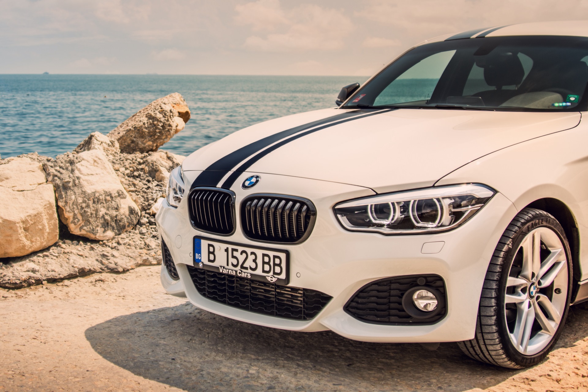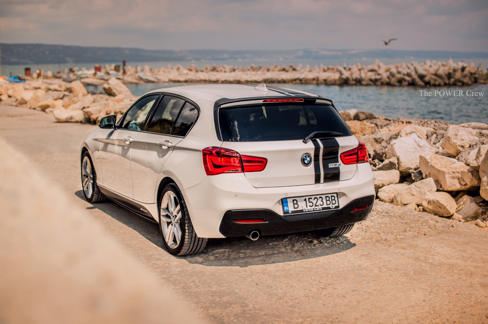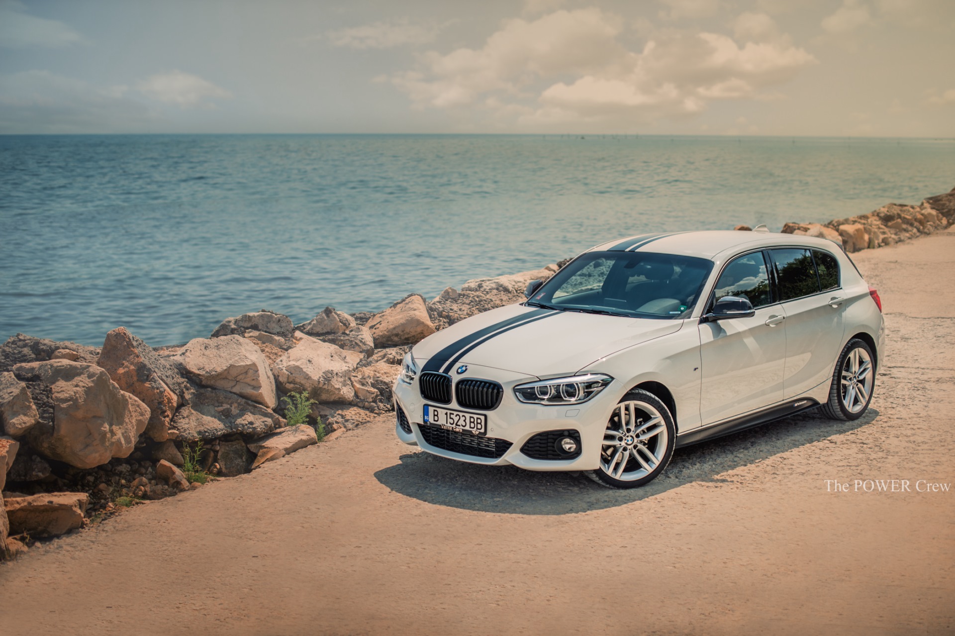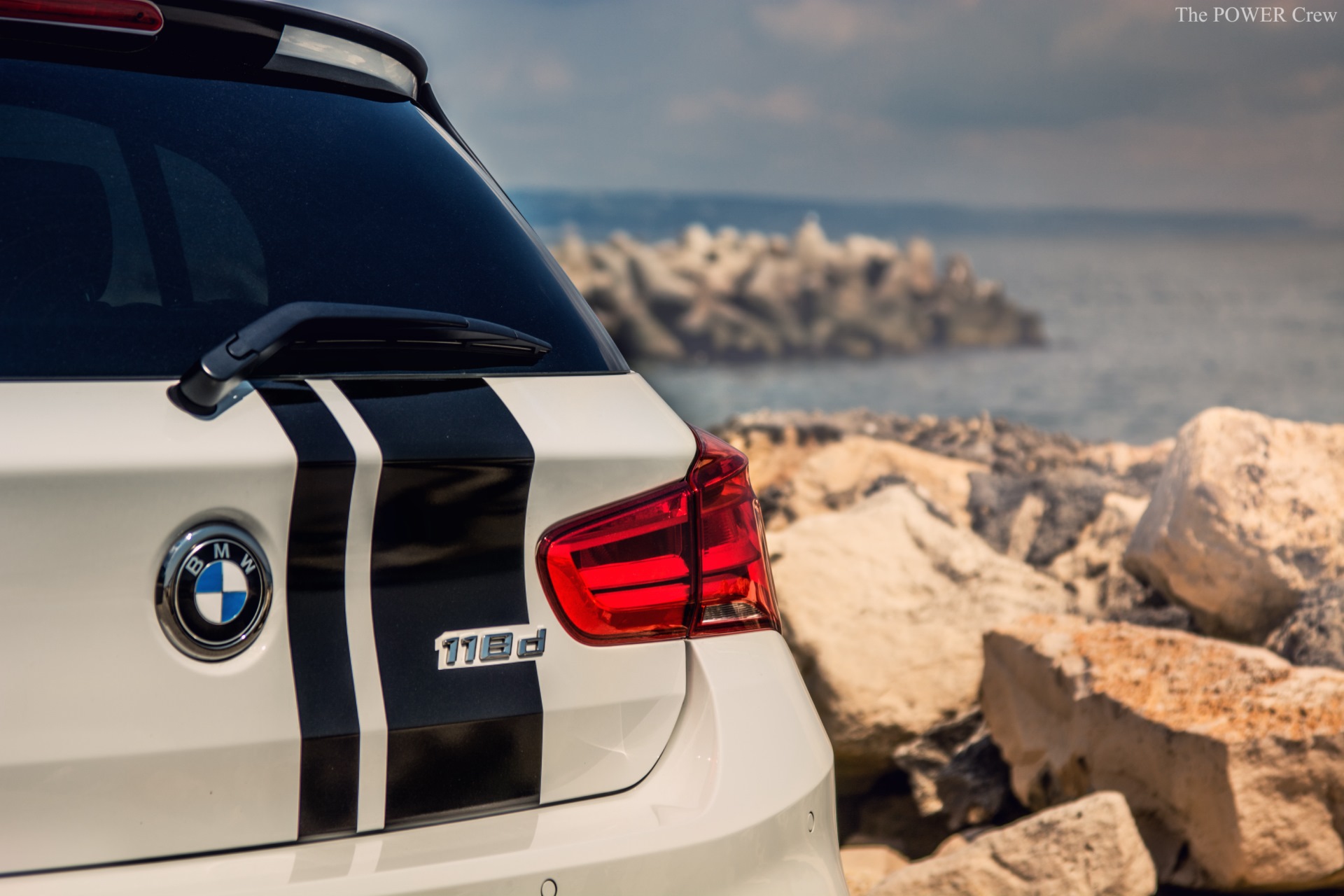 Grundlage des Projekts ist ein weißer BMW 1er F20 LCI mit M Sport-Paket, dieser wurde unter anderem mit den schwarzen Performance-Streifen auf Frontschürze, Motorhaube, Dach und Heckklappe aufgerüstet. Außerdem trägt der kompakte Hecktriebler die M Performance-Seitenschweller, die schwarz abgesetzten Aero-Finnen am Heck und einen ebenfalls schwarz beklebten Heckspoiler.