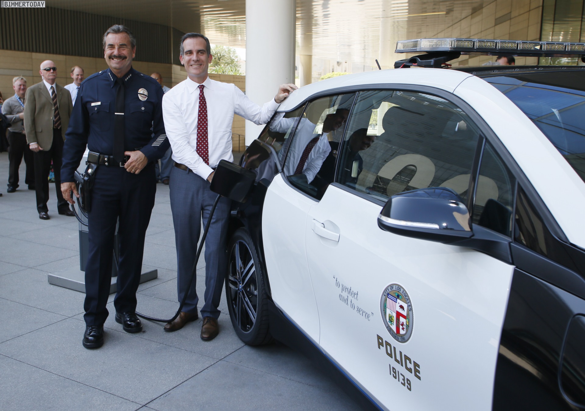 Los Angeles City Mayor Eric Garcetti and Los Angeles Police Department Chief Charlie Beck announce a year long test of a BMW i3 electric vehicle at a City of Los Angeles press conference in Los Angeles, Sept. 11, 2015. Photo by Danny Moloshok/Newscast
