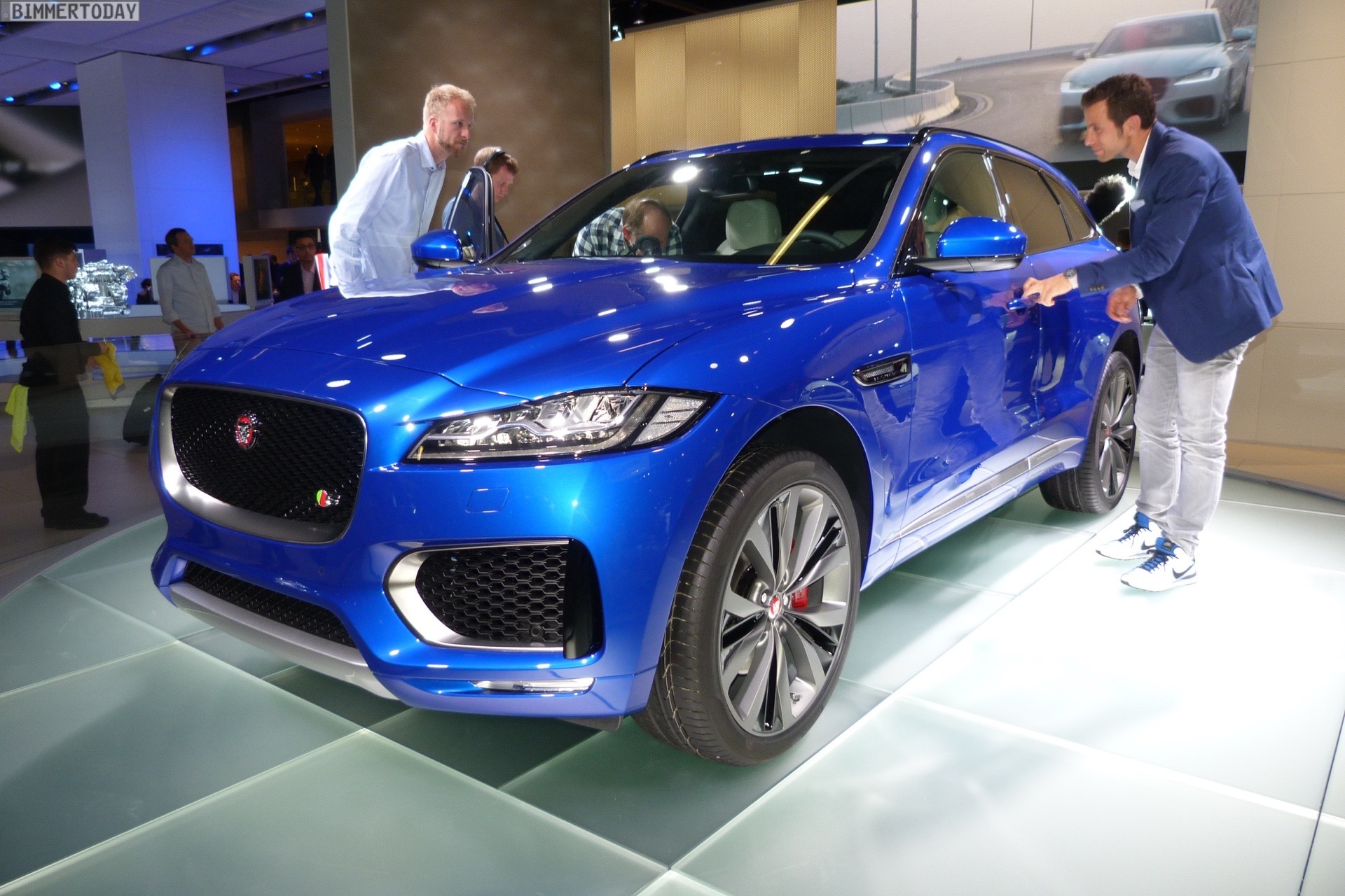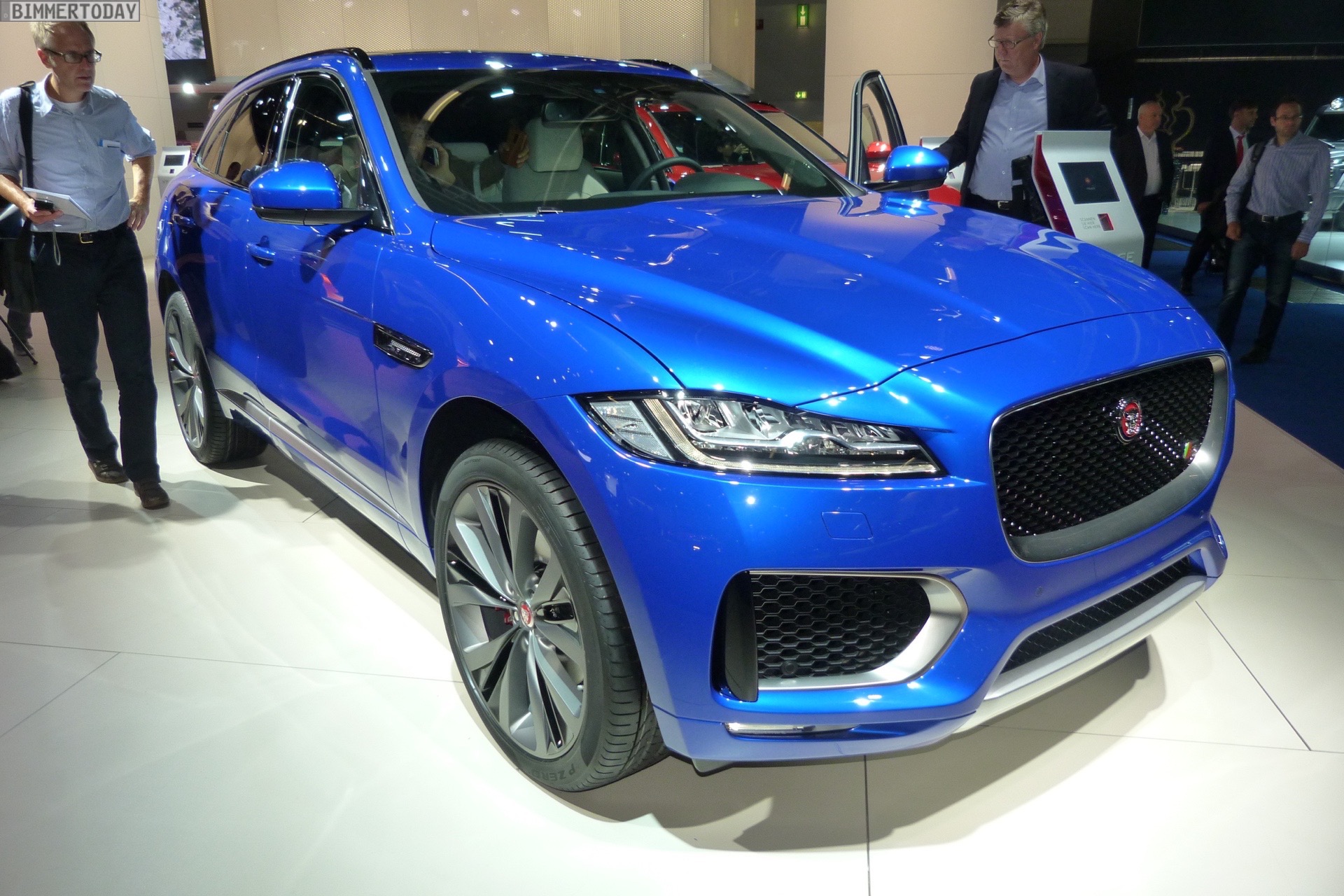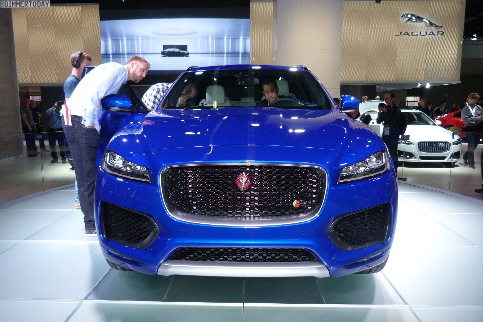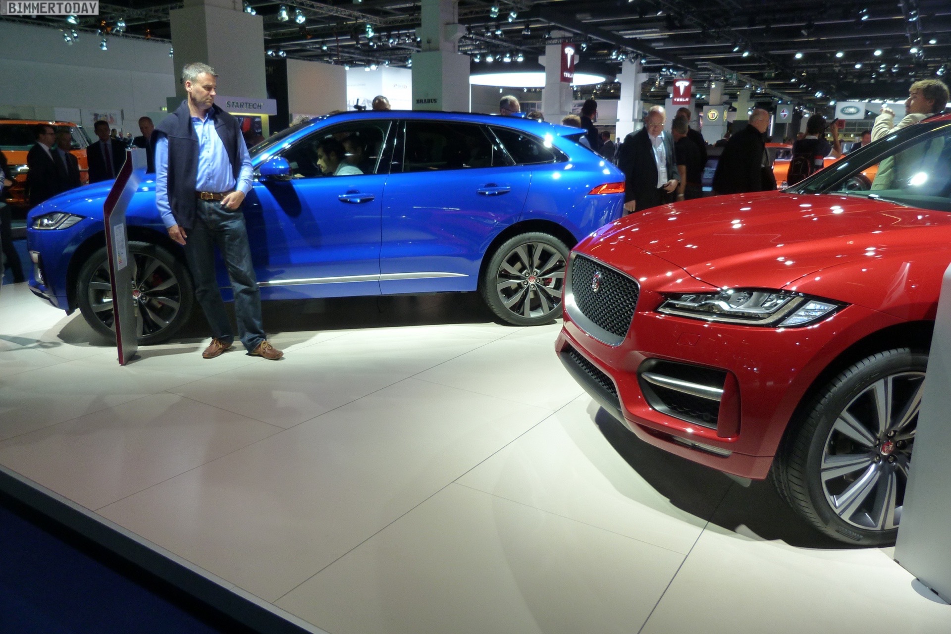 Zur Weltpremiere in Frankfurt zeigt Jaguar den neuen F-Pace nicht nur im strahlenden Blau der First Edition, sondern komplettiert die Farbpalette des Union Jack noch mit zwei weiteren Exemplaren in Rot und Weiß:
