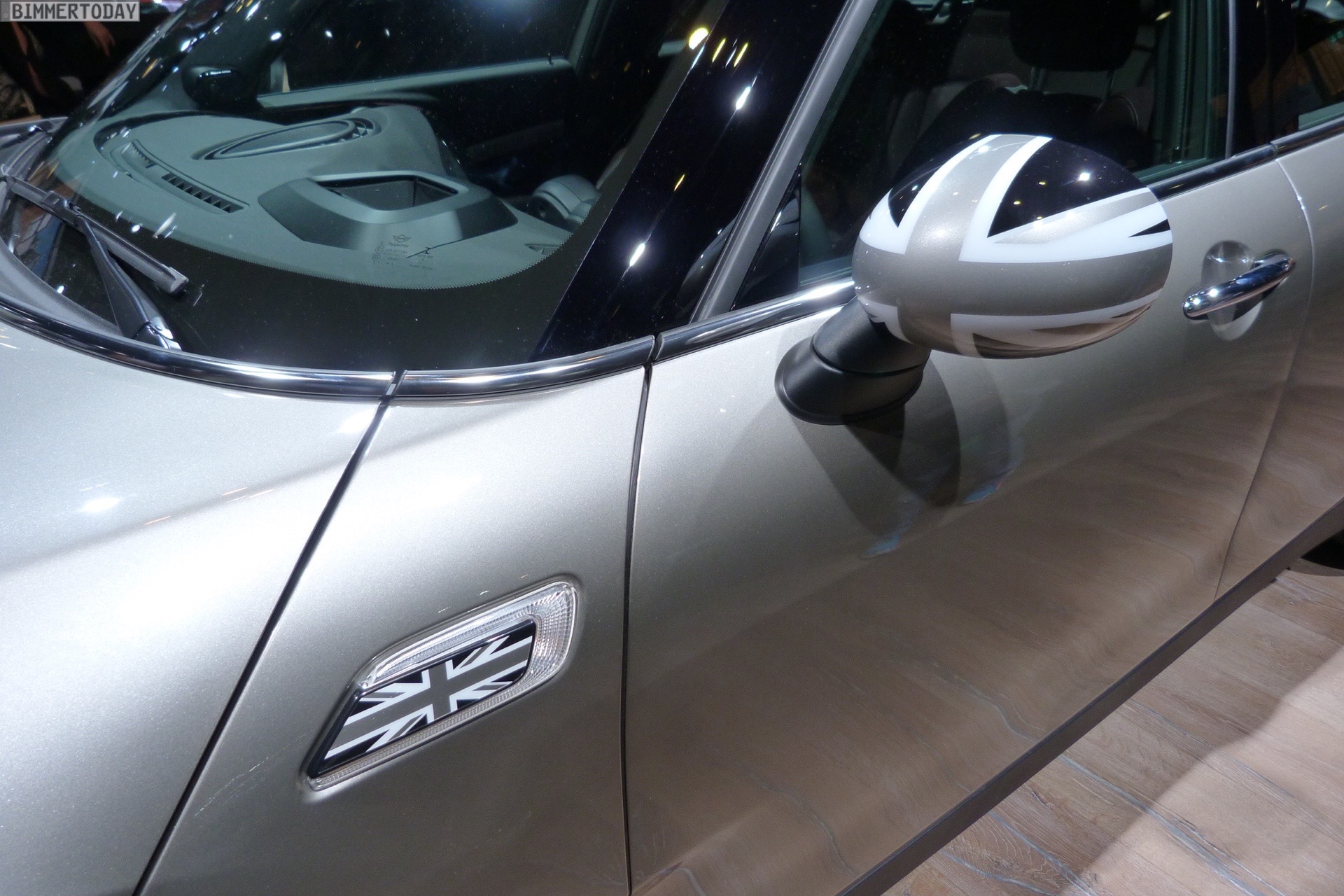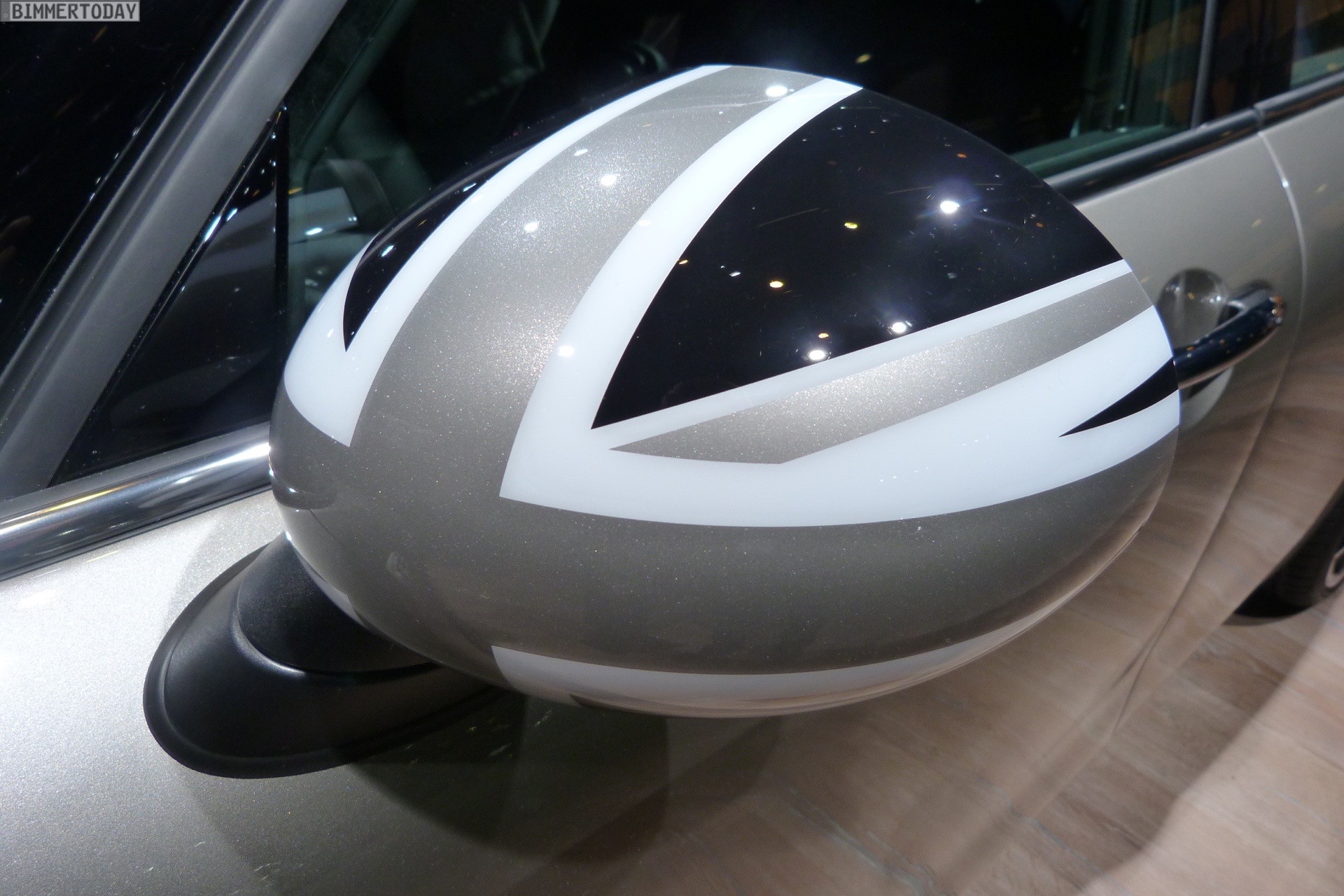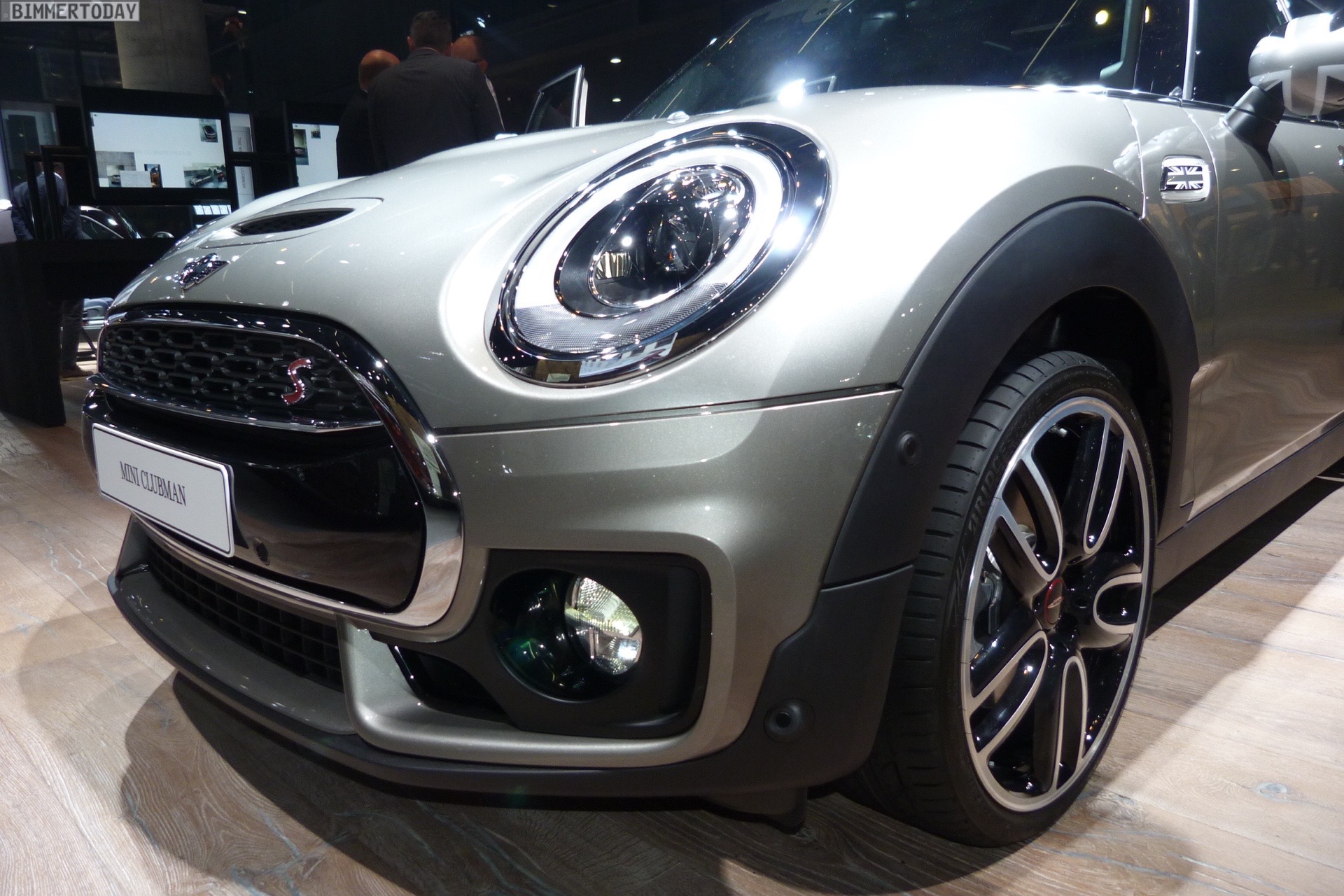 Zur Weltpremiere auf der IAA 2015 glänzt der MINI Clubman F54 nicht nur im eleganten Lapisluxury Blue, sondern auch in einer betont sportlichen Version mit John Coopeer Works Exterieur-Paket. Mit seiner Lackierung in Melting Silver Metallic und dem schwarz abgesetzten Dach wird der Clubman zum dynamischen Hingucker, die schwarzen Union Jack-Elemente aus dem Zubehör-Programm greifen die Farben des Fahrzeugs erneut auf.