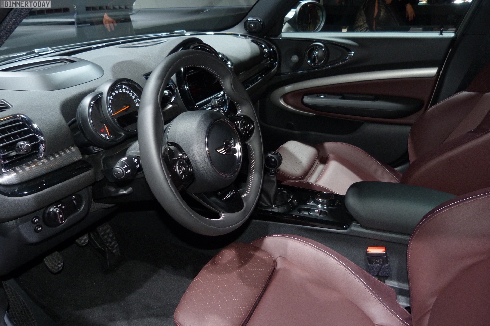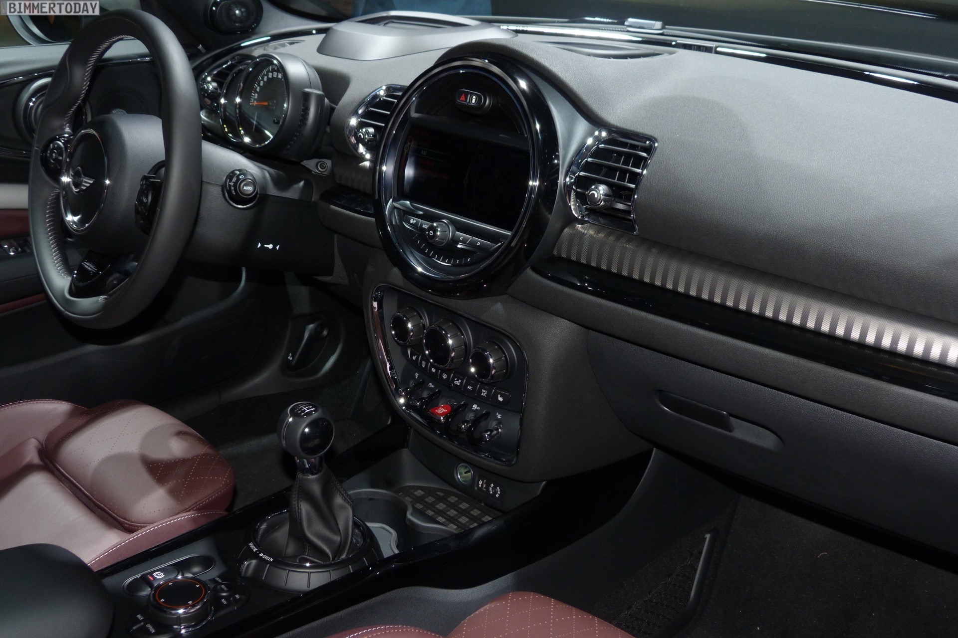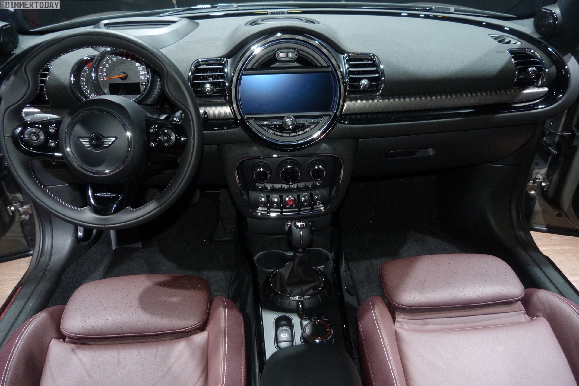 Im Innenraum trägt der gezeigte MINI Clubman 2015 die Ausstattung Leder Cross Punch in Pure Burgundy, außerdem sehen wir unter anderem das MINI Yours Sportlenkrad, das Navigationssystem Professional und das mit Hilfe einer kleinen Scheibe realisierte Head-Up-Display.