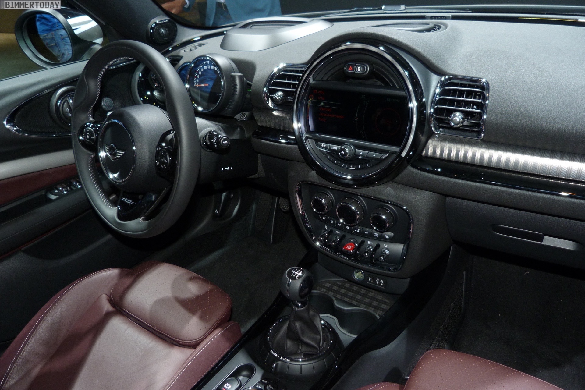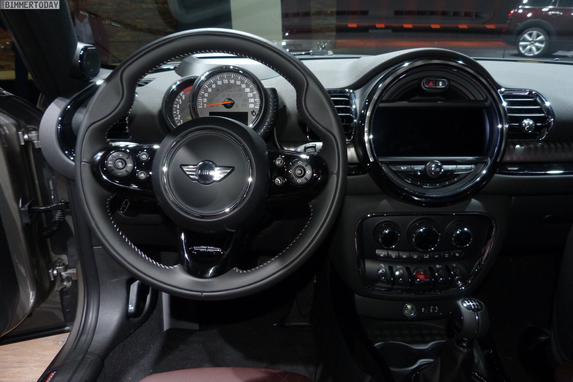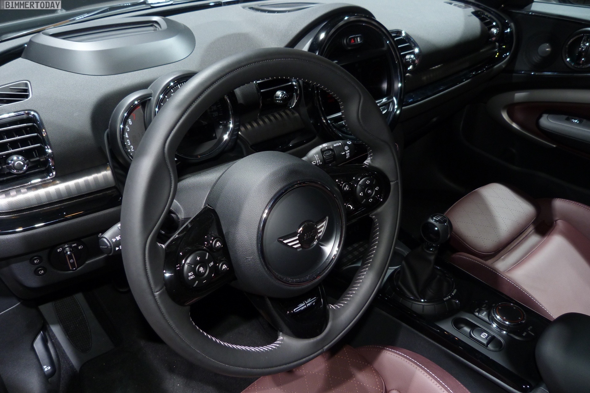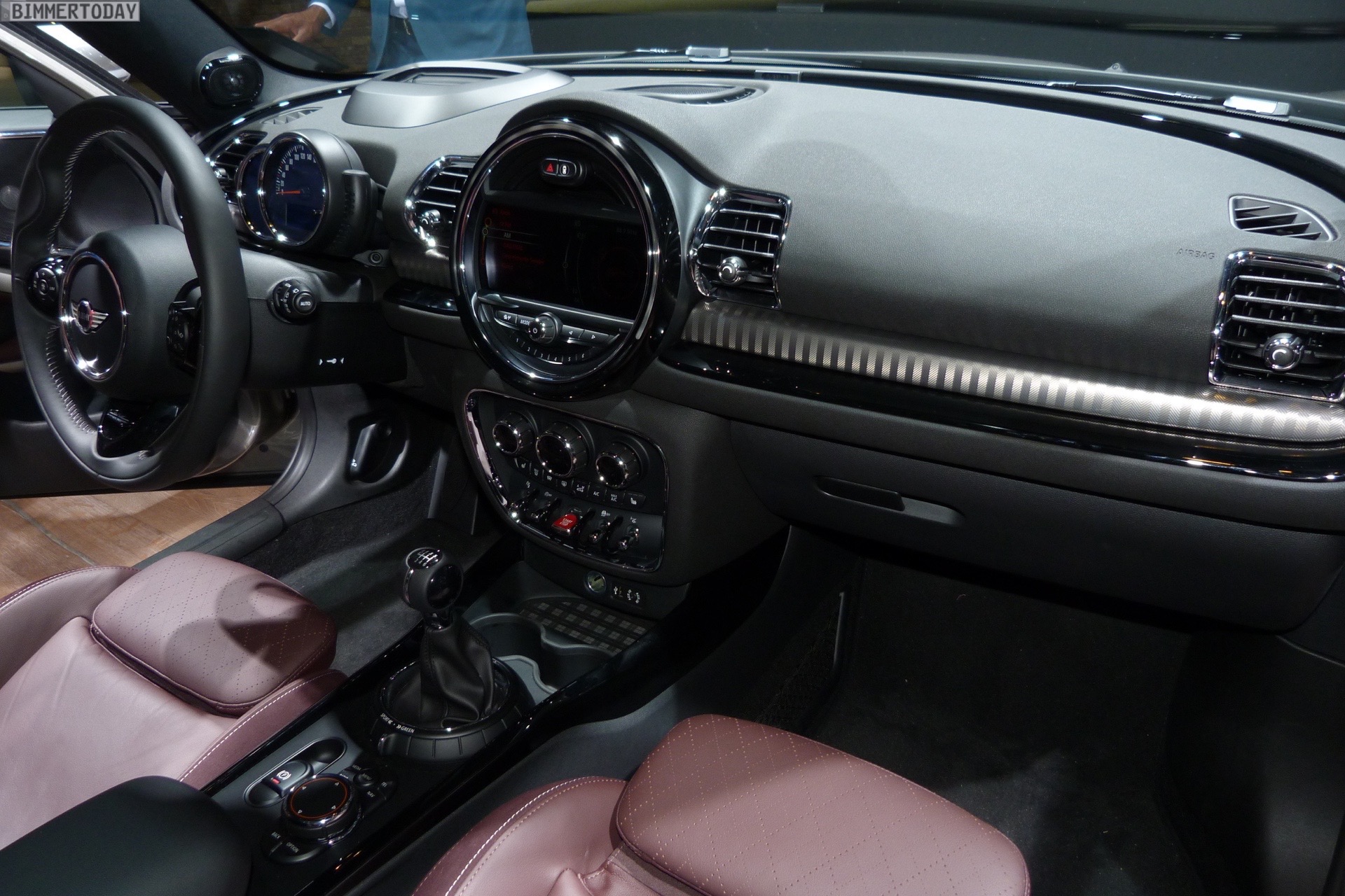 Im Innenraum trägt der gezeigte MINI Clubman 2015 die Ausstattung Leder Cross Punch in Pure Burgundy, außerdem sehen wir unter anderem das MINI Yours Sportlenkrad, das Navigationssystem Professional und das mit Hilfe einer kleinen Scheibe realisierte Head-Up-Display.