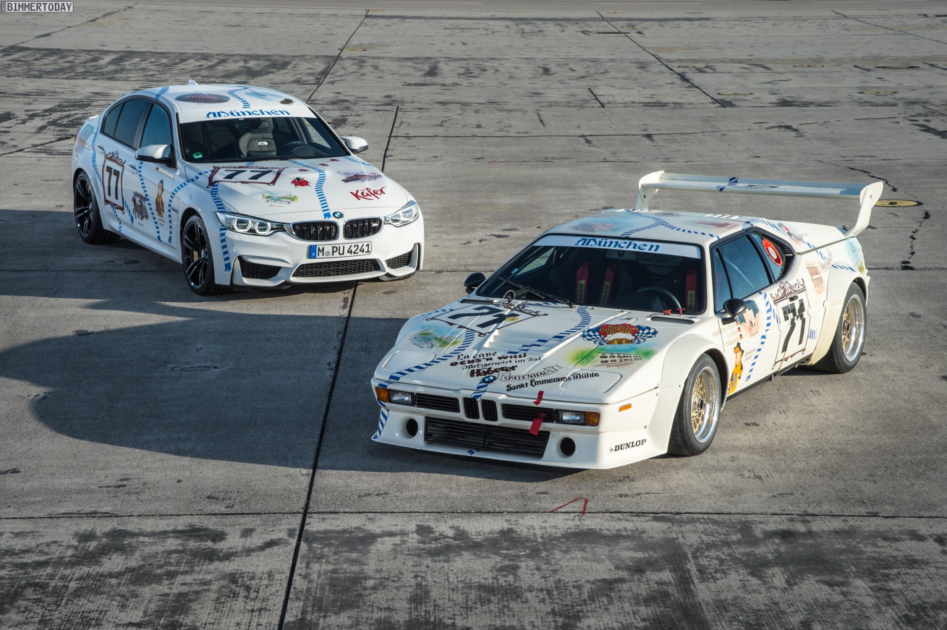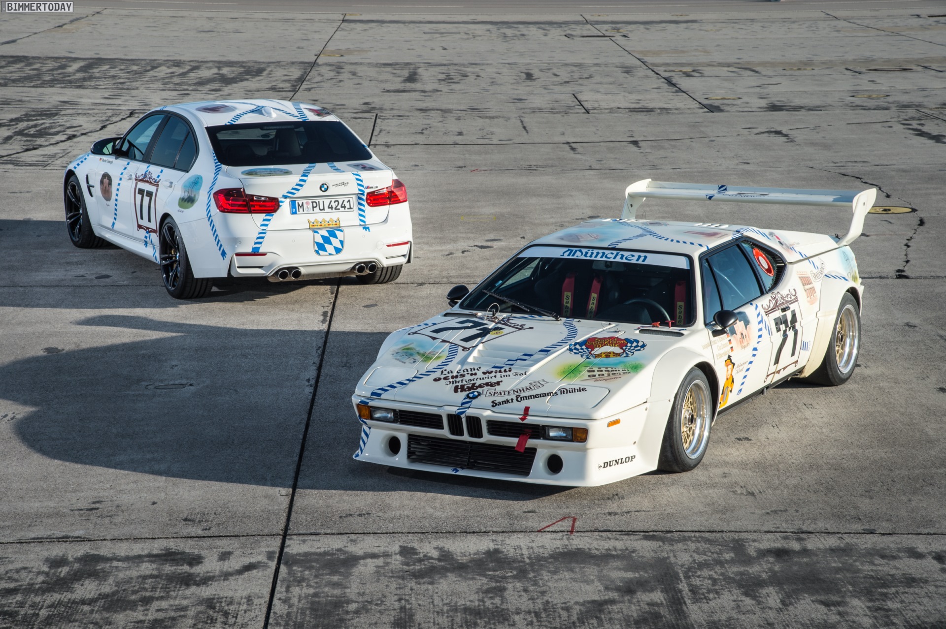 Wenn zwei Einzelstücke aufeinandertreffen, schlagen nicht nur die Herzen von Sammlern und Traditionalisten höher. Wir konnten uns gestern ein persönliches Bild vom BMW M3 Münchner Wirte machen und durften die Mittelklasse-Limousine im Oktoberfest-Look auch direkt mit ihrem historischen Vorbild vergleichen – auch das BMW M1 Procar im Wiesn-Design war gestern auf dem Gelände der BMW Driving Experience in Maisach bei München zu Gast.