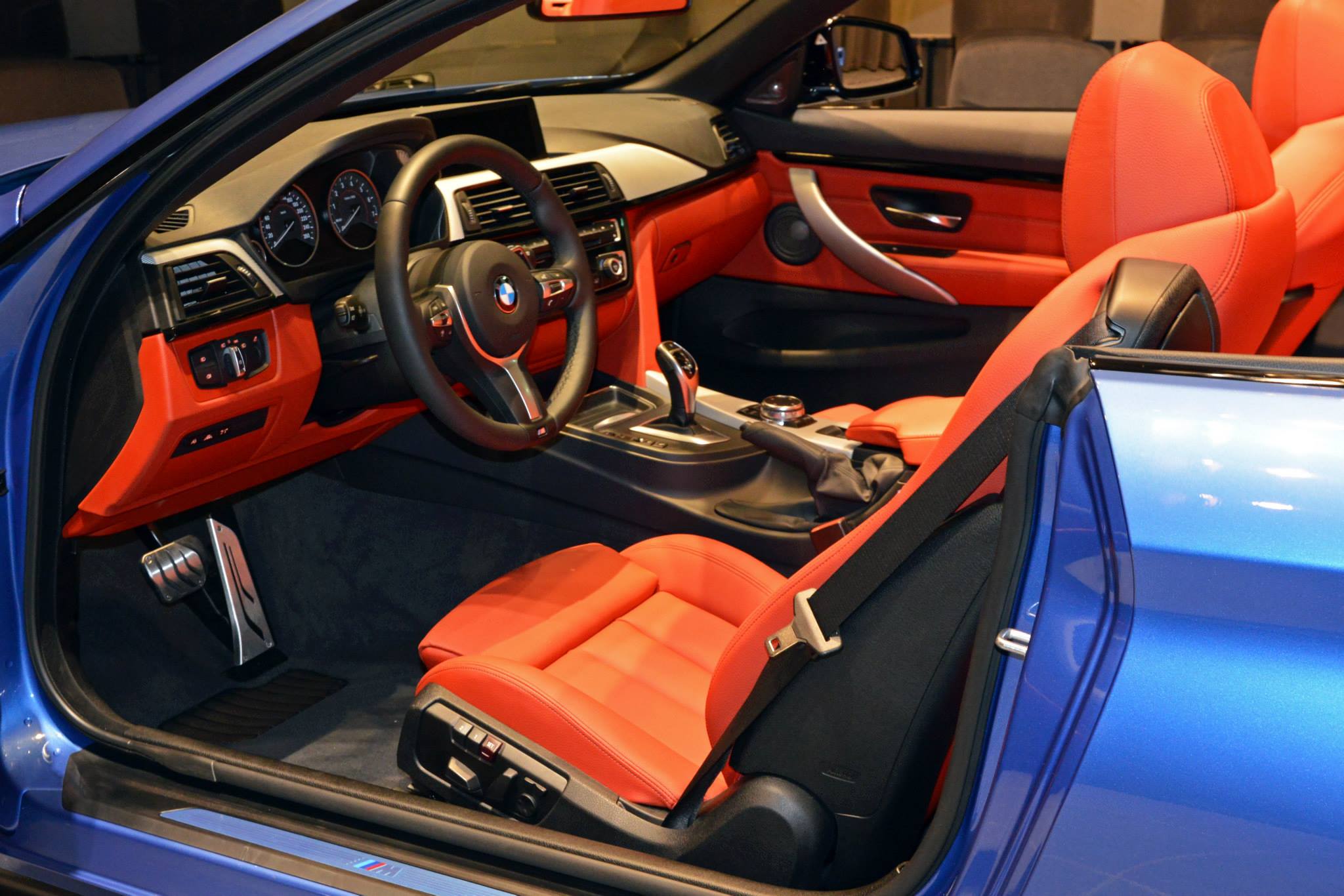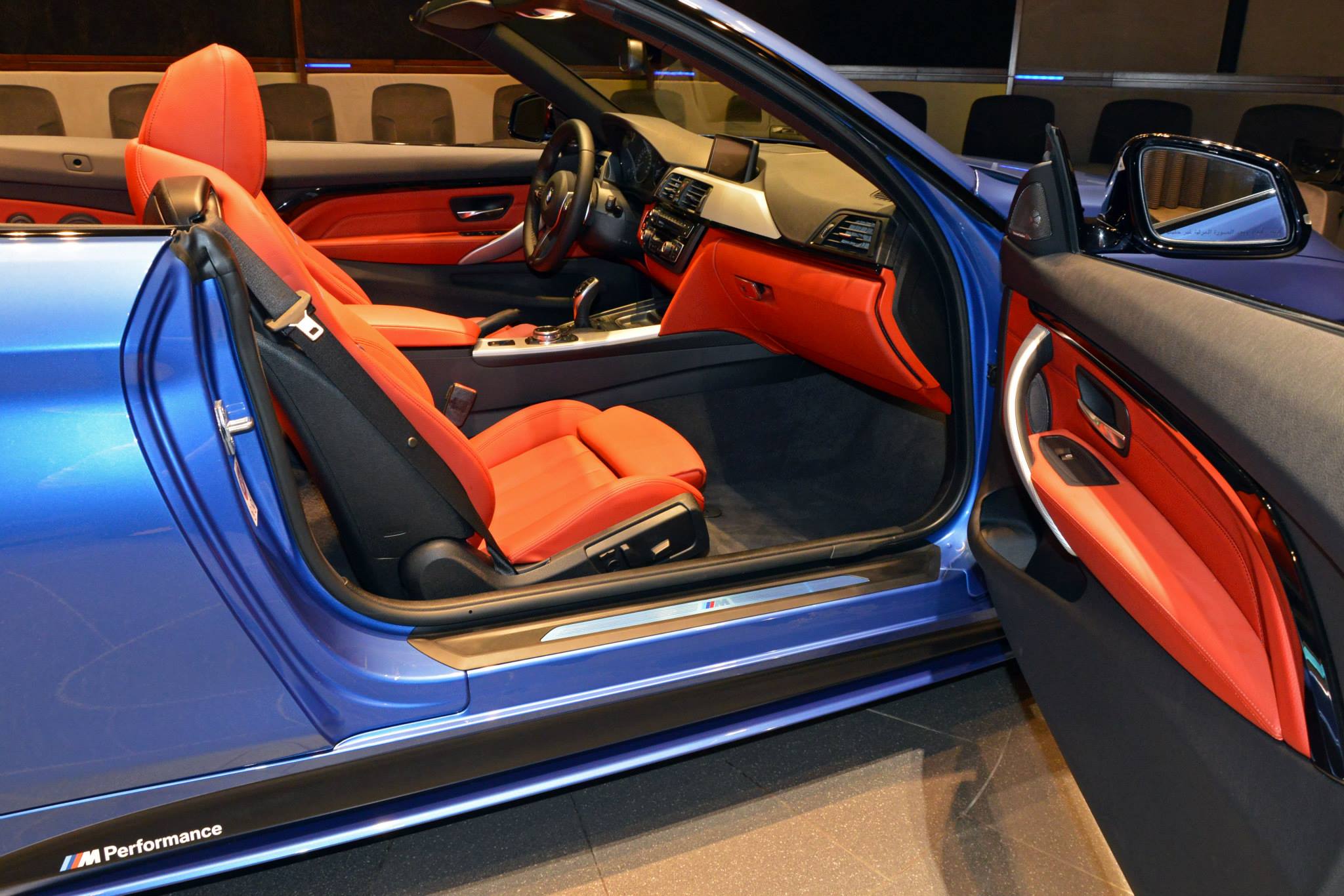 Unverändert präsentiert sich der Innenraum des gezeigten Fahrzeugs, auf Wunsch sorgen aber auch hier Elemente wie das BMW M Performance Sportlenkrad mit Carbon und Alcantara für einen sportlicheren Look. Die Lederausstattung in Korallrot zieht bei geöffnetem Verdeck zusätzliche Blicke auf dieses besonders sportlich gestaltete BMW 4er Cabrio F33.