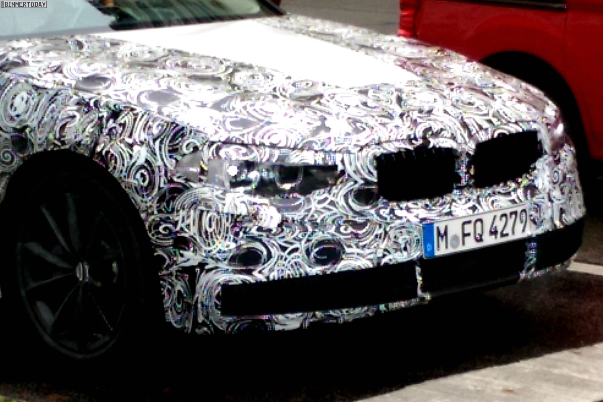 Die jüngsten Fotos von einem unserer Leser zeigen die Oberklasse-Limousine im Münchner Stadtverkehr, gut zu erkennen sind bereits die serienmäßigen Scheinwerfer mit direktem Übergang zu den wuchtig ausgeführten Nieren. Die “Hybrid Test Vehicle”-Aufkleber an den Türen verraten den Prototypen als Plug-in-Hybrid, denn wie fast alle Neuheiten der nächsten Jahre wird auch der neue BMW 5er 2017 nicht nur mit konventionellen Antrieben erhältlich sein.