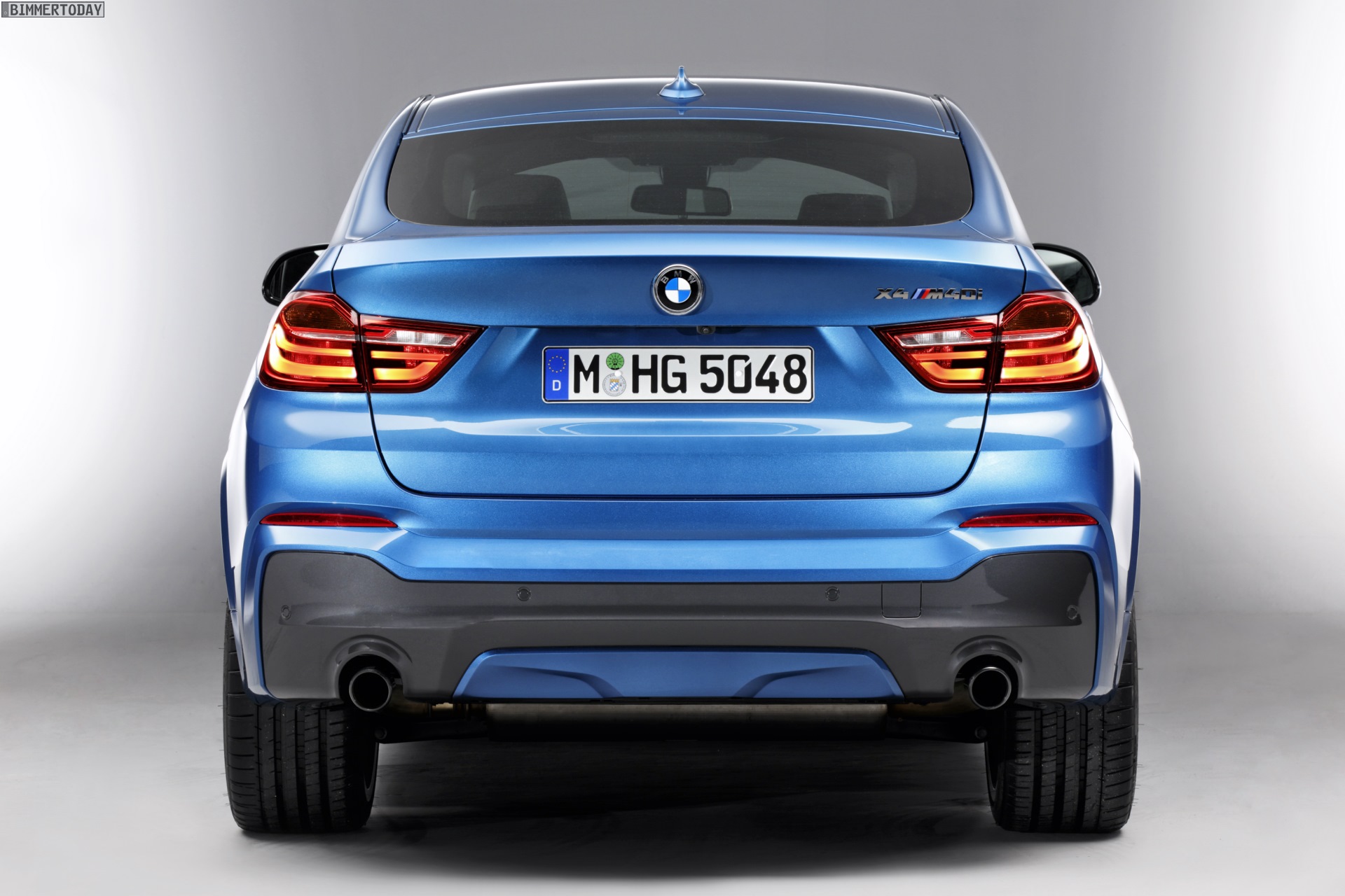 Am Heck sorgen eine neue Schürze mit angedeutetem Diffusor und eine Abgasanlage mit jeweils einem Endrohr auf der linken und rechten Seite des Fahrzeugs für eine völlig neue Optik, bisher hatte kein BMW X4 mehr als zwei Endrohre auf der linken Seite zu bieten. Die klappengesteuerte Sportabgas-Anlage kommt mit sattem Sound und schwarz-verchromten Endrohren.