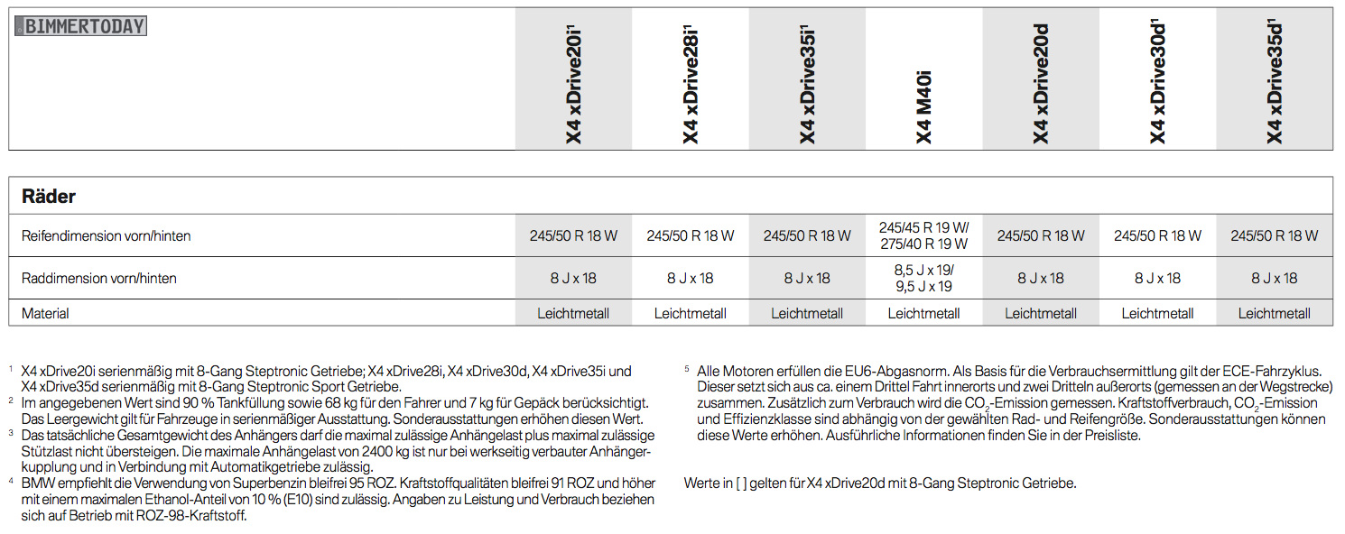 Das Design des Topmodells orientiert sich erwartungsgemäß stark am M Sportpaket, setzt sich aber mit einigen Elementen in Ferric Grey von der Serie ab. Auch die 20 Zoll-Felgen vom Typ Doppelspeiche 680 M Bicolor bleiben dem BMW X4 M40i vorbehalten und werden auf Wunsch sogar mit einer nicht näher definierten High Performance-Bereifung versehen. An der Vorderachse sind 245 Millimeter-Reifen für die Übertragung der Lenkkräfte zuständig, an der Hinterachse steht der M40i sogar auf 275er-Reifen.