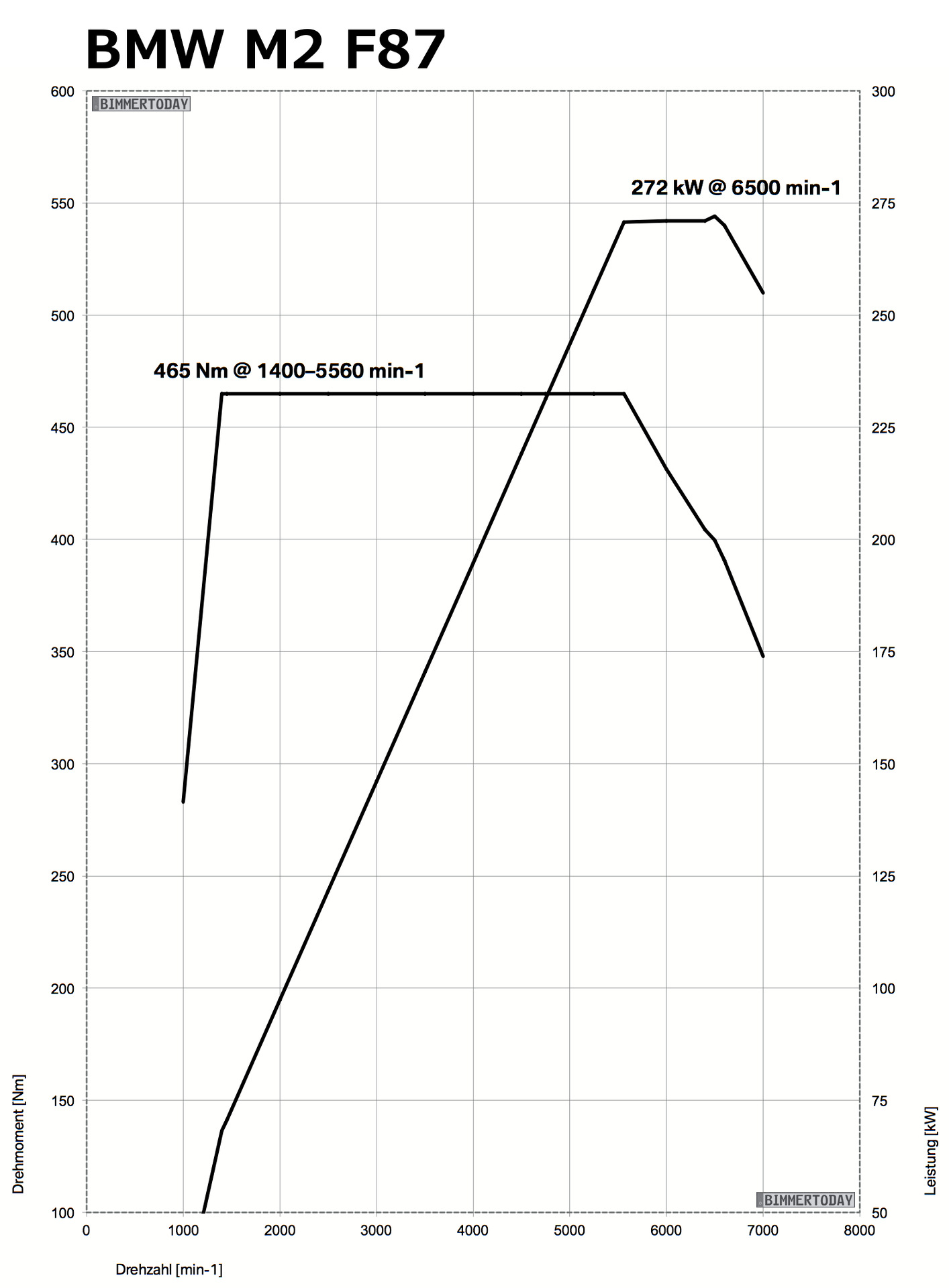 Die Nennleistung fällt mit 370 PS noch etwas stärker als beim technisch eng verwandten Motor des BMW X4 M40i aus. Auch beim Blick auf das maximale Drehmoment gibt es Unterschiede zwischen beiden Varianten, obwohl beide zunächst mit 465 Newtonmeter angegeben werden. Dieser Höchstwert liegt beim M2-Motor marginal später, aber dafür noch etwas länger an und kann zudem per Overboost kurzzeitig auf 500 Newtonmeter angehoben werden. Einen direkten Vergleich der beiden Drehmoment- und Leistungs-Diagramme erlaubt unsere Bildergalerie, allerdings hat BMW auf das Einzeichnen des nur kurzzeitig verfügbaren Overboost-Moments verzichtet.