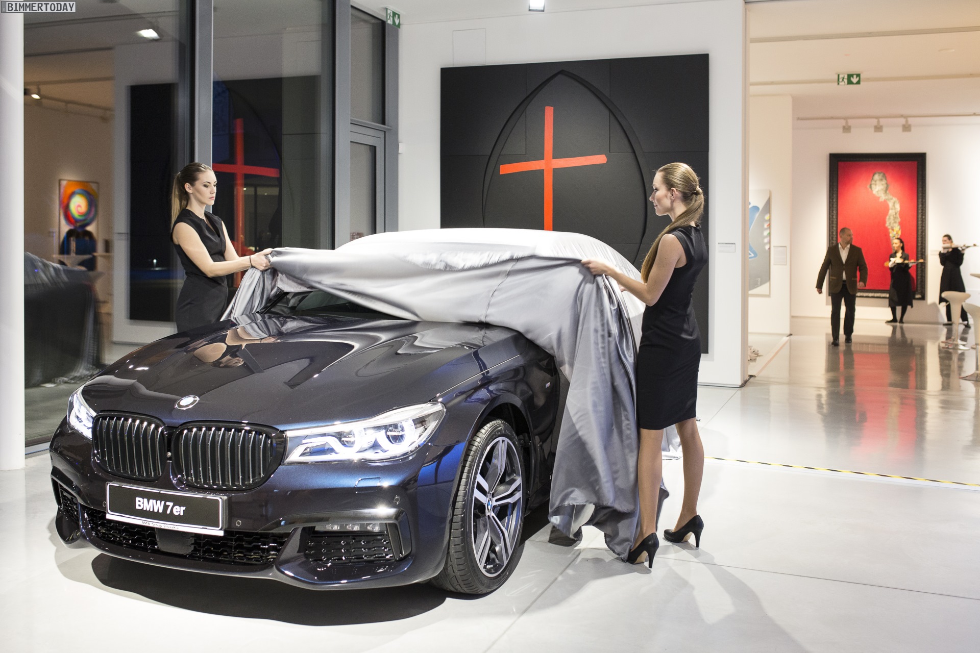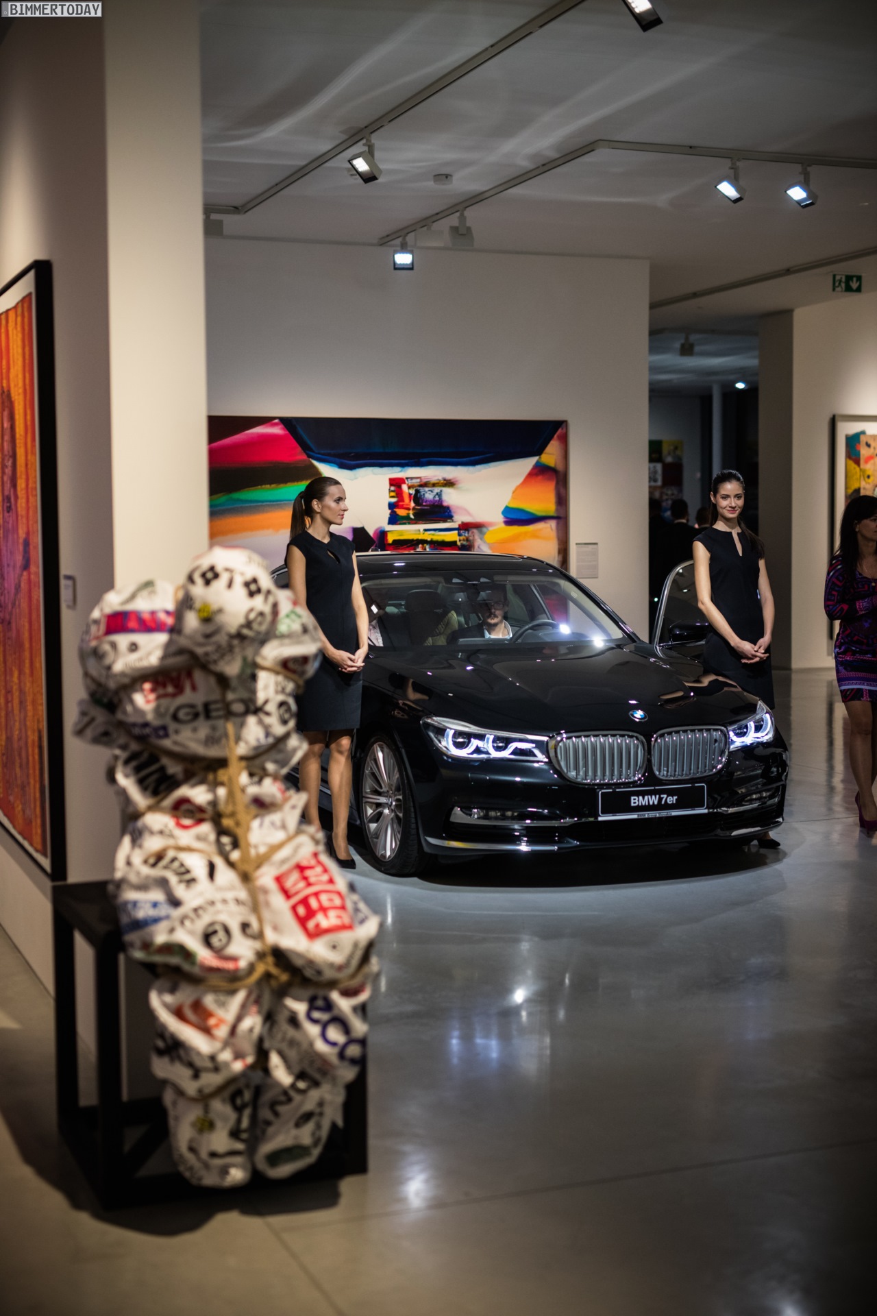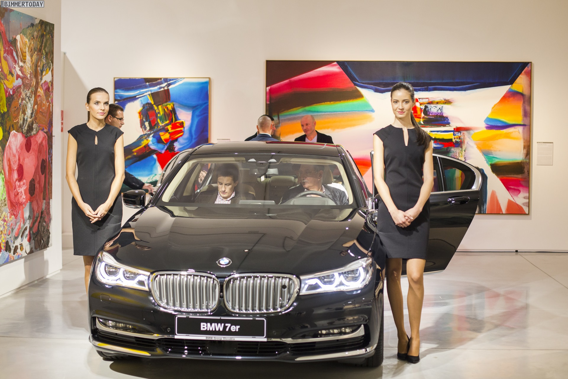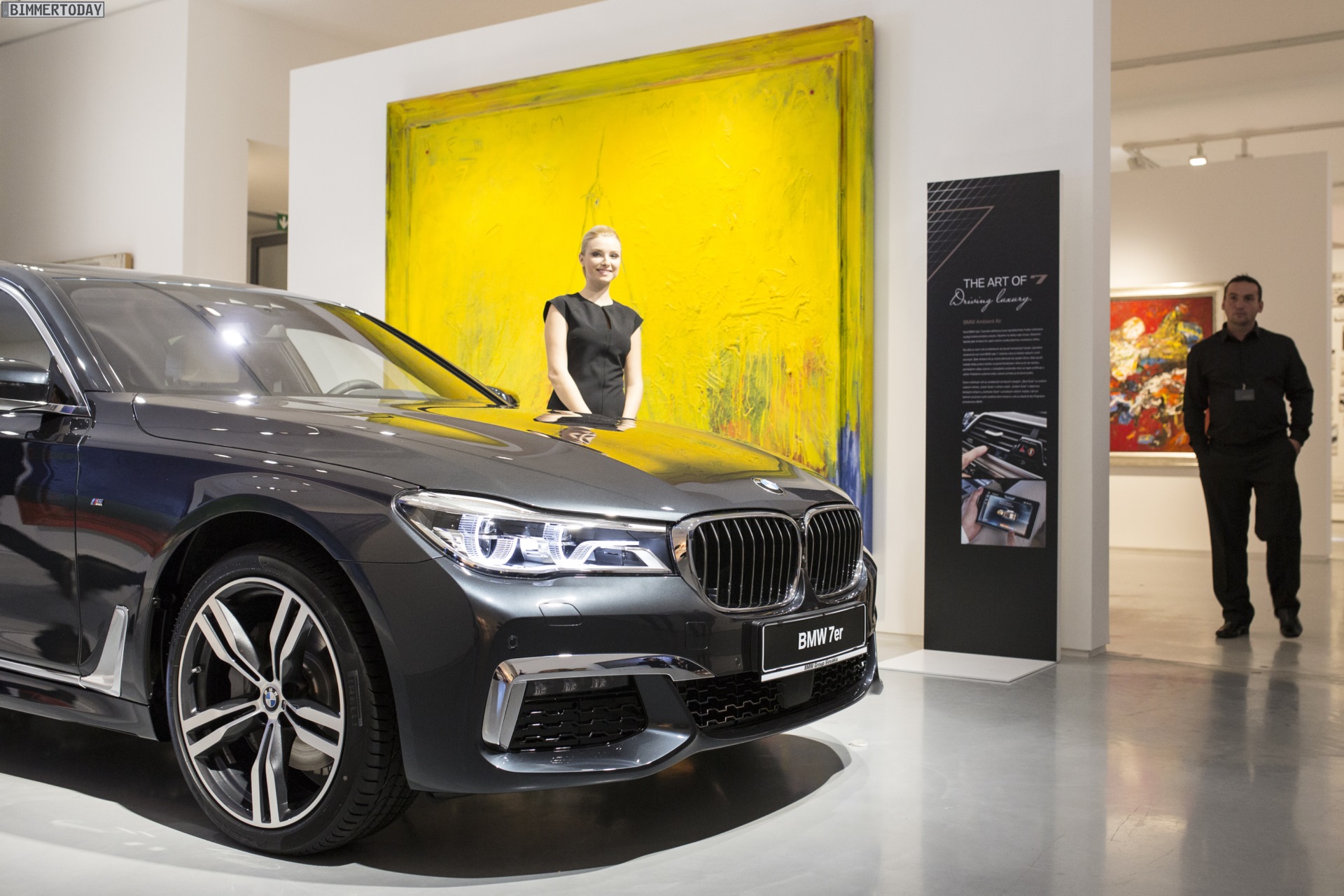 Bei der eigentlichen Premiere BMW 7er G11 / G12 in Slowenien wurde die Limousine im Rahmen einer Kunst-Ausstellung unter dem Titel “The Art of 7 – Driving Luxury” vorgestellt und durfte dabei zwischen zahlreichen Kunstwerken ohne Räder oder anderen Auto-Bezug glänzen: