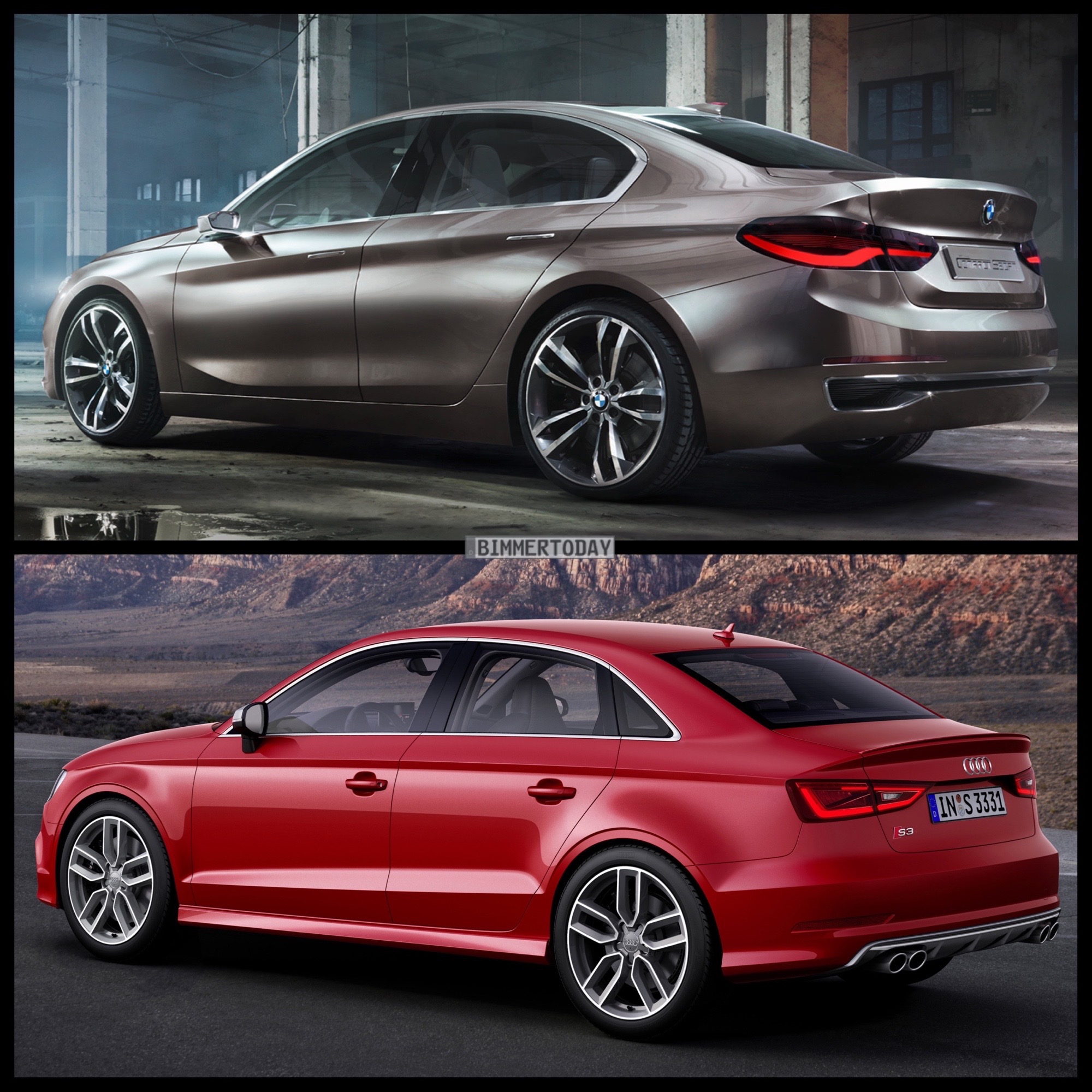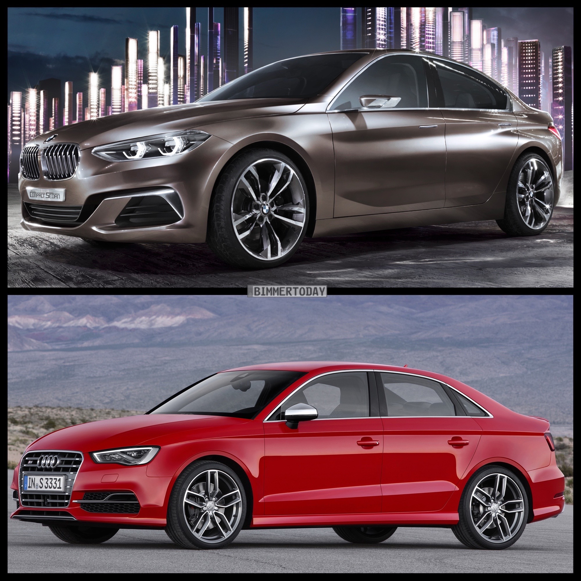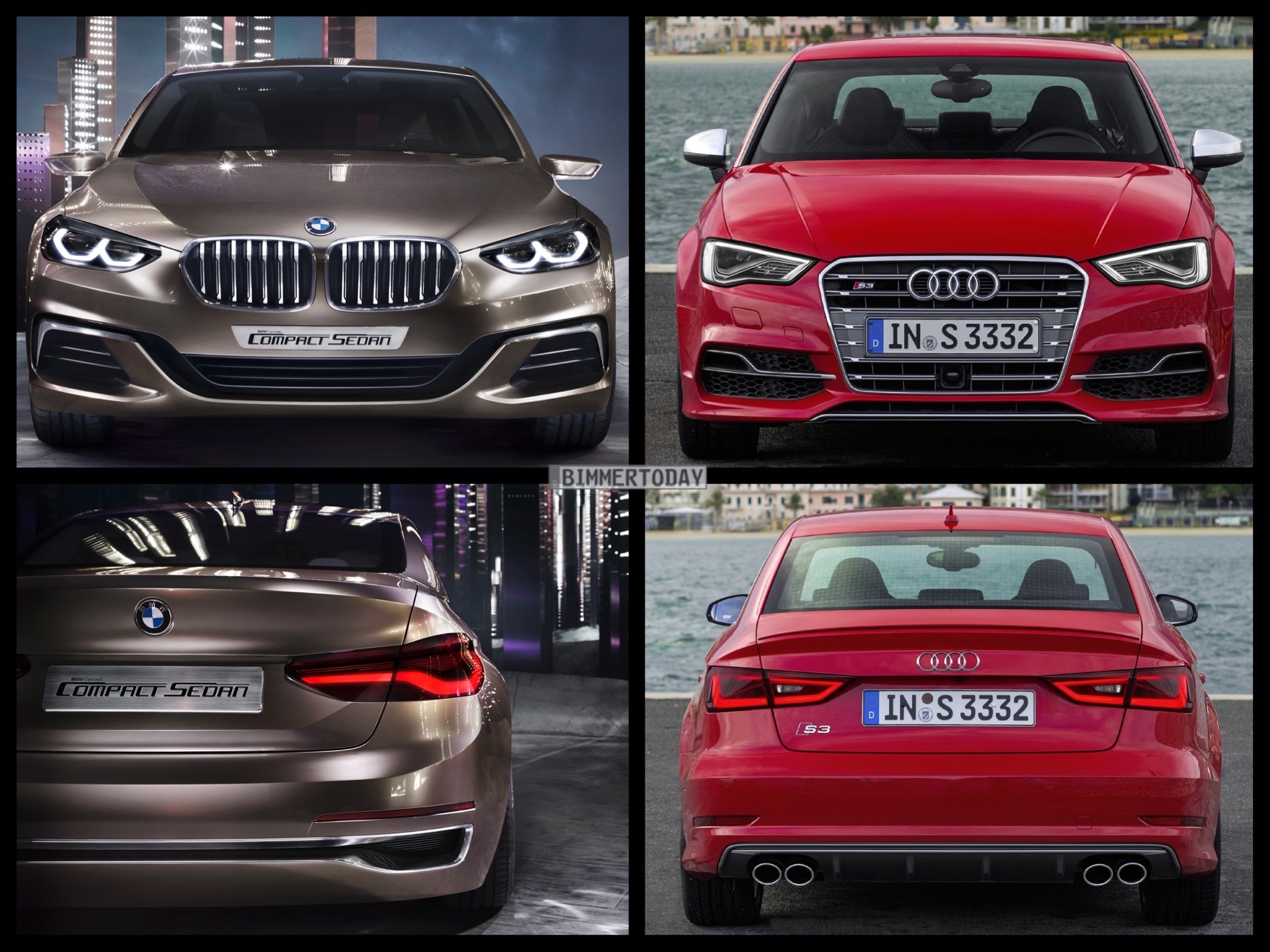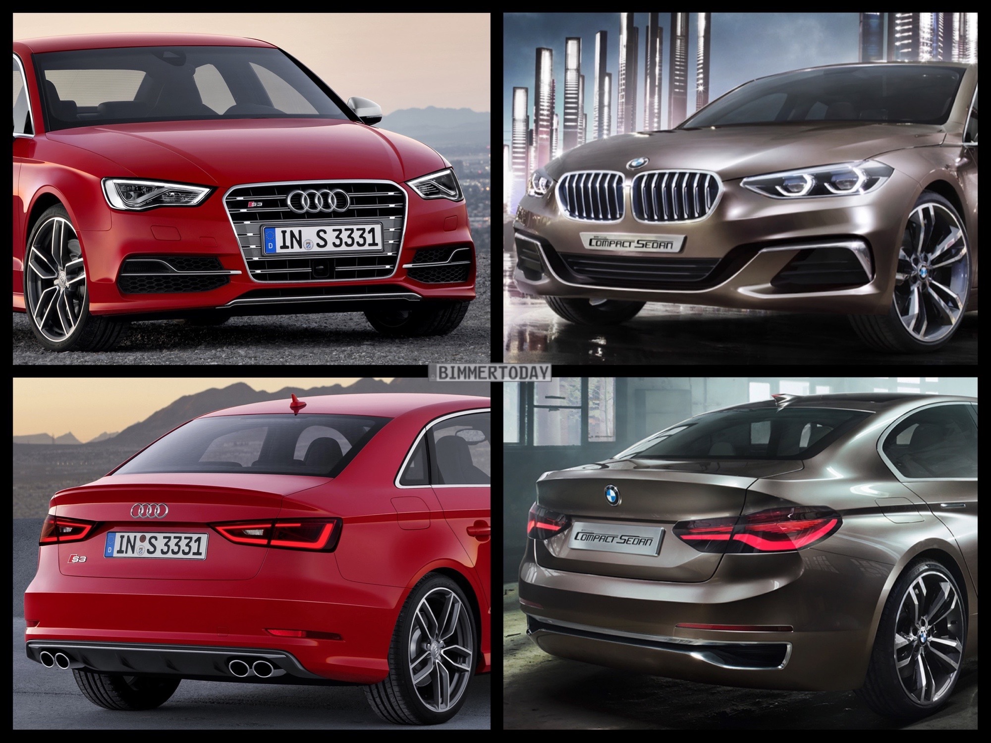 In unserem Bild-Vergleich stellen wir den jüngsten Ableger der BMW UKL-Architektur Seite an Seite mit einem seiner schärfsten Rivalen. Weil es sich beim BMW Compact Sedan Concept um eine Studie mit einigen besonders dynamischen Details handelt, die so nicht in Serie gehen werden, haben wir für den Foto-Vergleich die sportliche Variante S3 genutzt – alles andere wäre schlicht unfair und würde den BMW übervorteilen, auch wenn die Studie nicht als Sportlimousine positioniert ist.