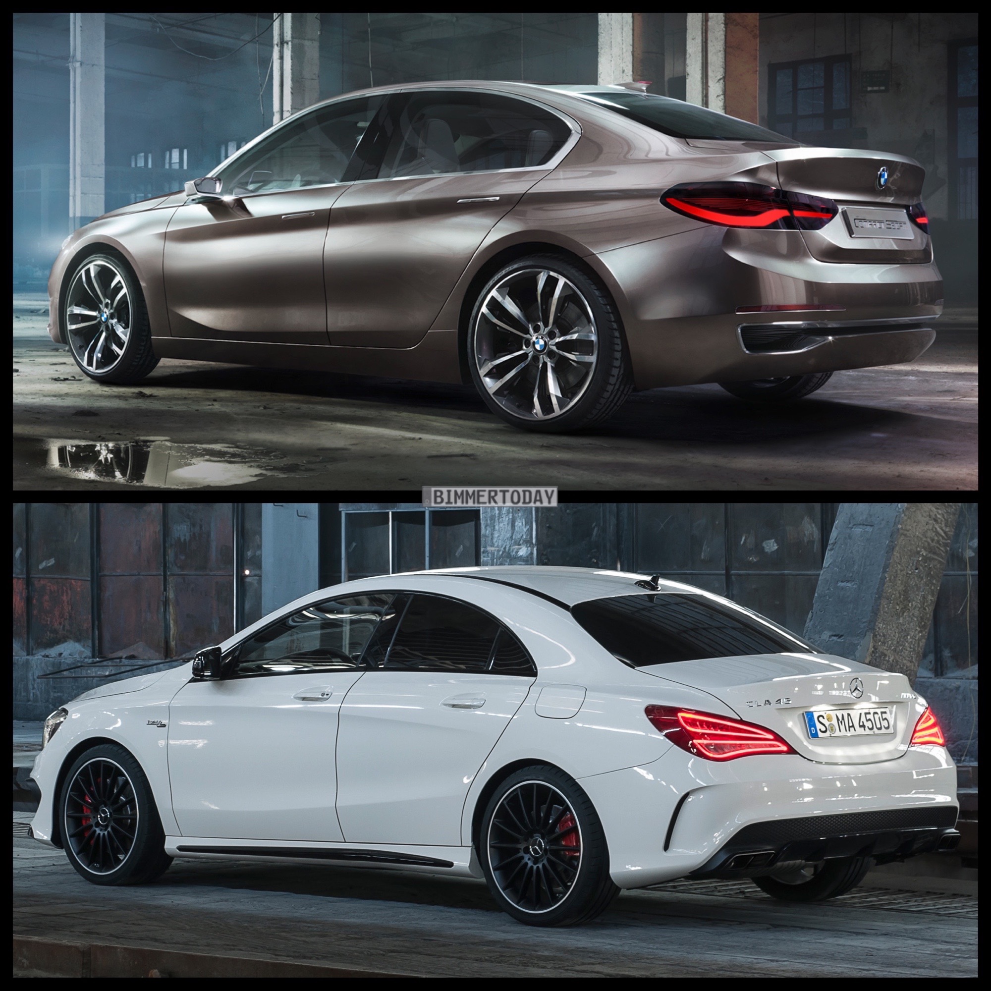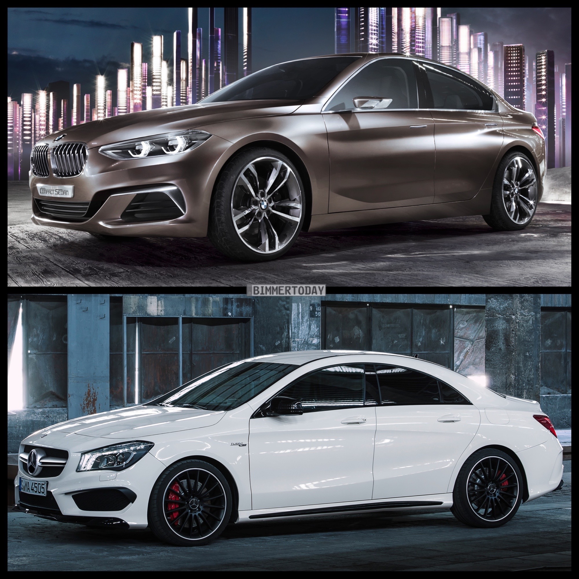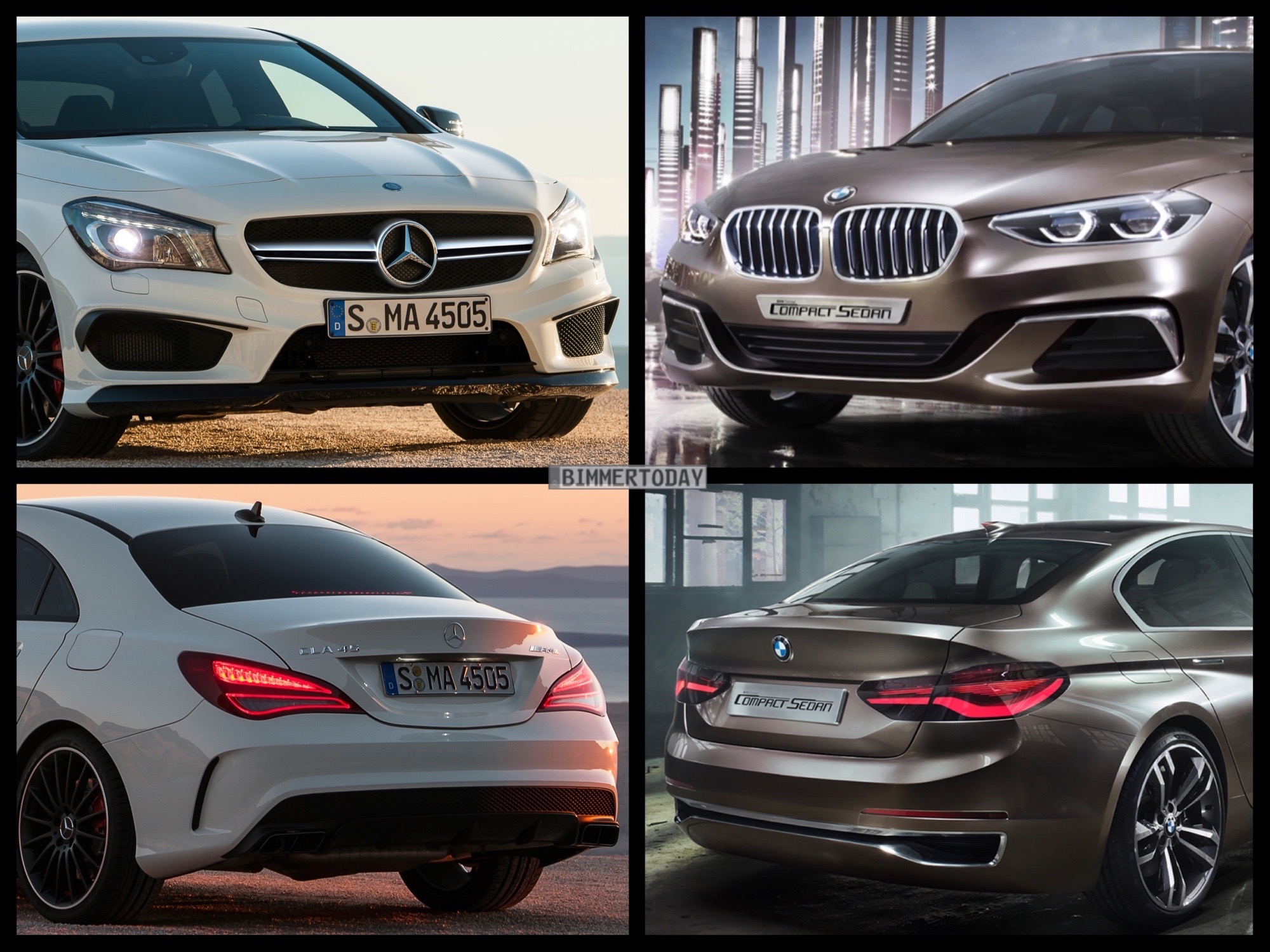 Ein neuer Gegner für den CLA kündigt sich nun aus München an, die am Freitag auf der Auto Guangzhou 2015 als Compact Sedan Concept vorgestellte BMW 1er Limousine nimmt eine eine ganz ähnliche Zielgruppe ins Visier. In unserem Bild-Vergleich haben wir der Studie den Mercedes-AMG CLA 45 gegenübergestellt, schließlich verfügt auch die BMW-Studie über einige betont-sportliche Details.
