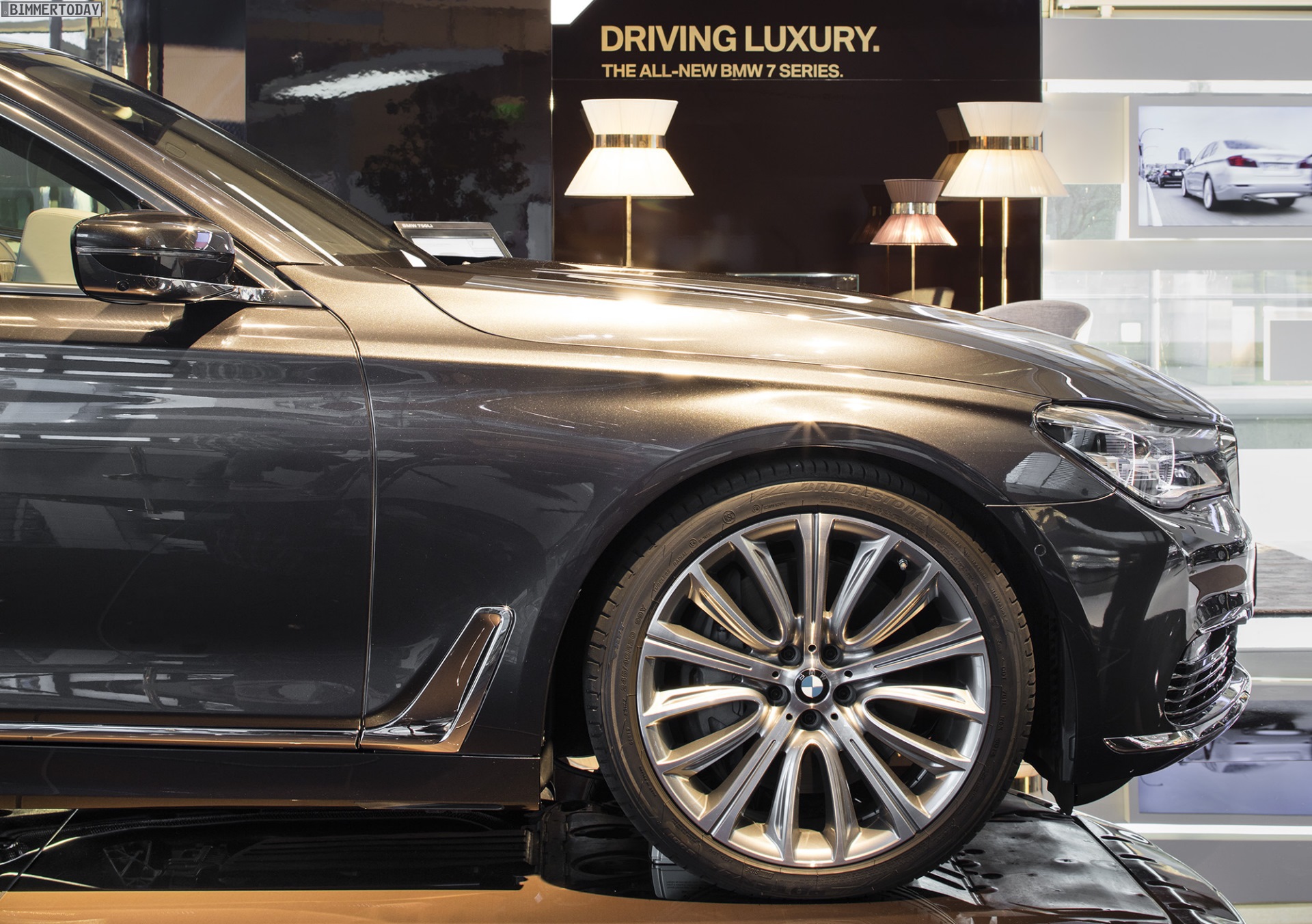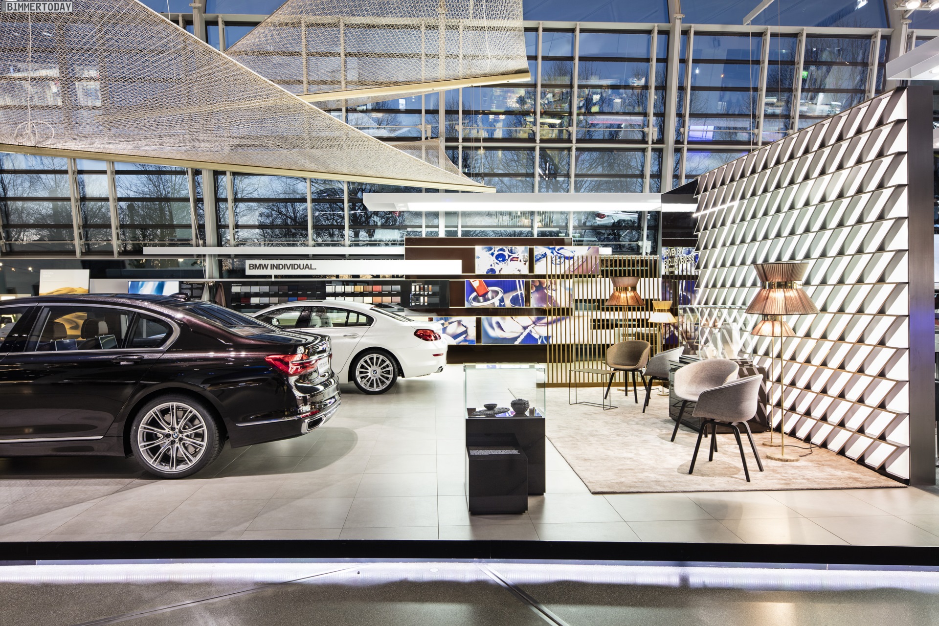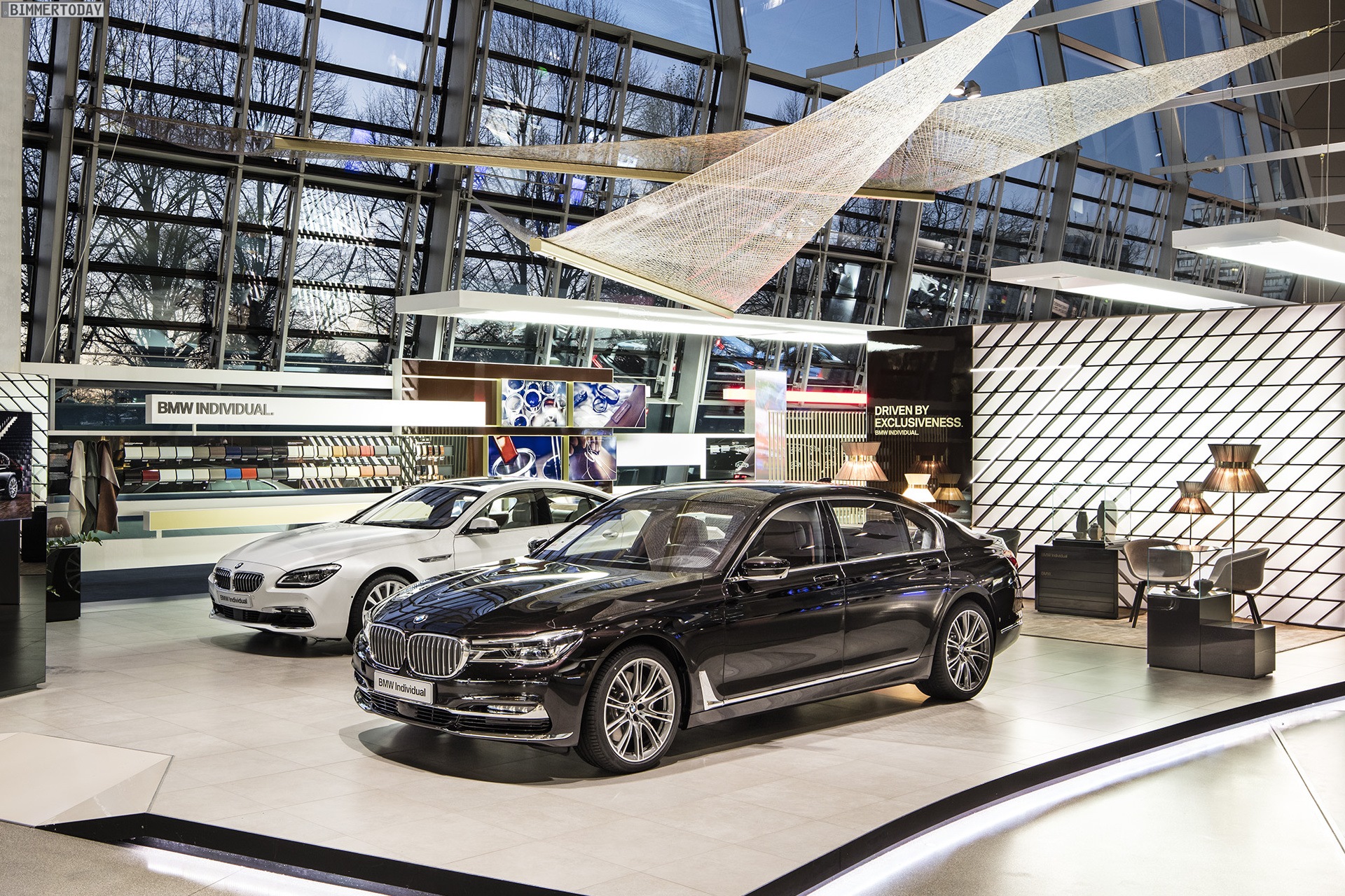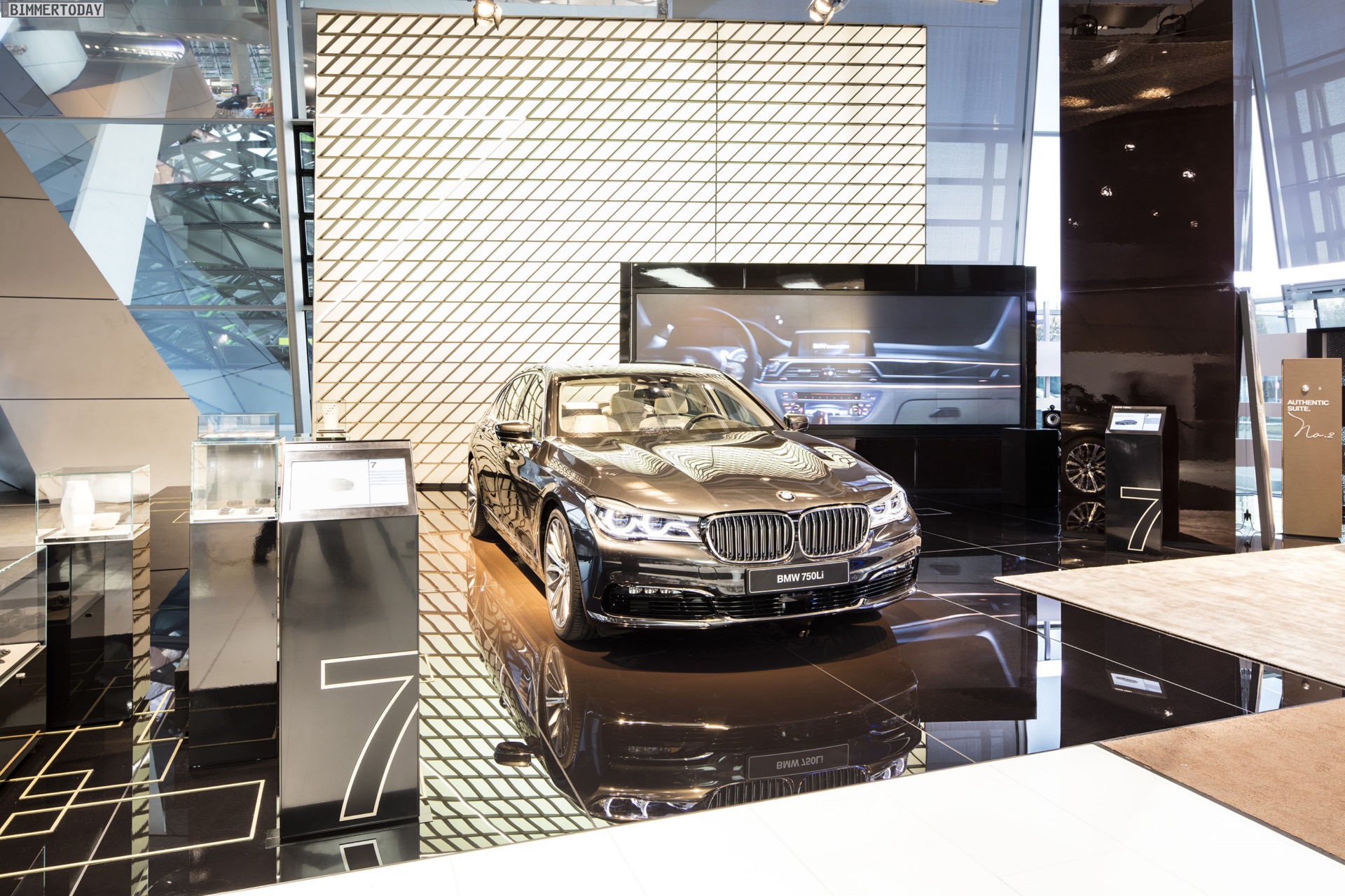 In der BMW Welt steht seit einigen Tagen der neue BMW 7er 2015 im Mittelpunkt des Geschehens. Mit einer Sonderausstellung unter dem Motto “Driven by Exclusiveness” zeigen die Münchner, wie hochwertig sich die neue 7er-Generation G11 / G12 ausstatten lässt. Auf der separaten Ausstellungsfläche am Süd-Eingang der BMW Welt steht das vorläufige Topmodell BMW 750Li G12, wenige Schritte weiter steht der neue 7er mit hochwertiger Individual-Ausstattung an der Seite eines BMW 6er Gran Coupé.