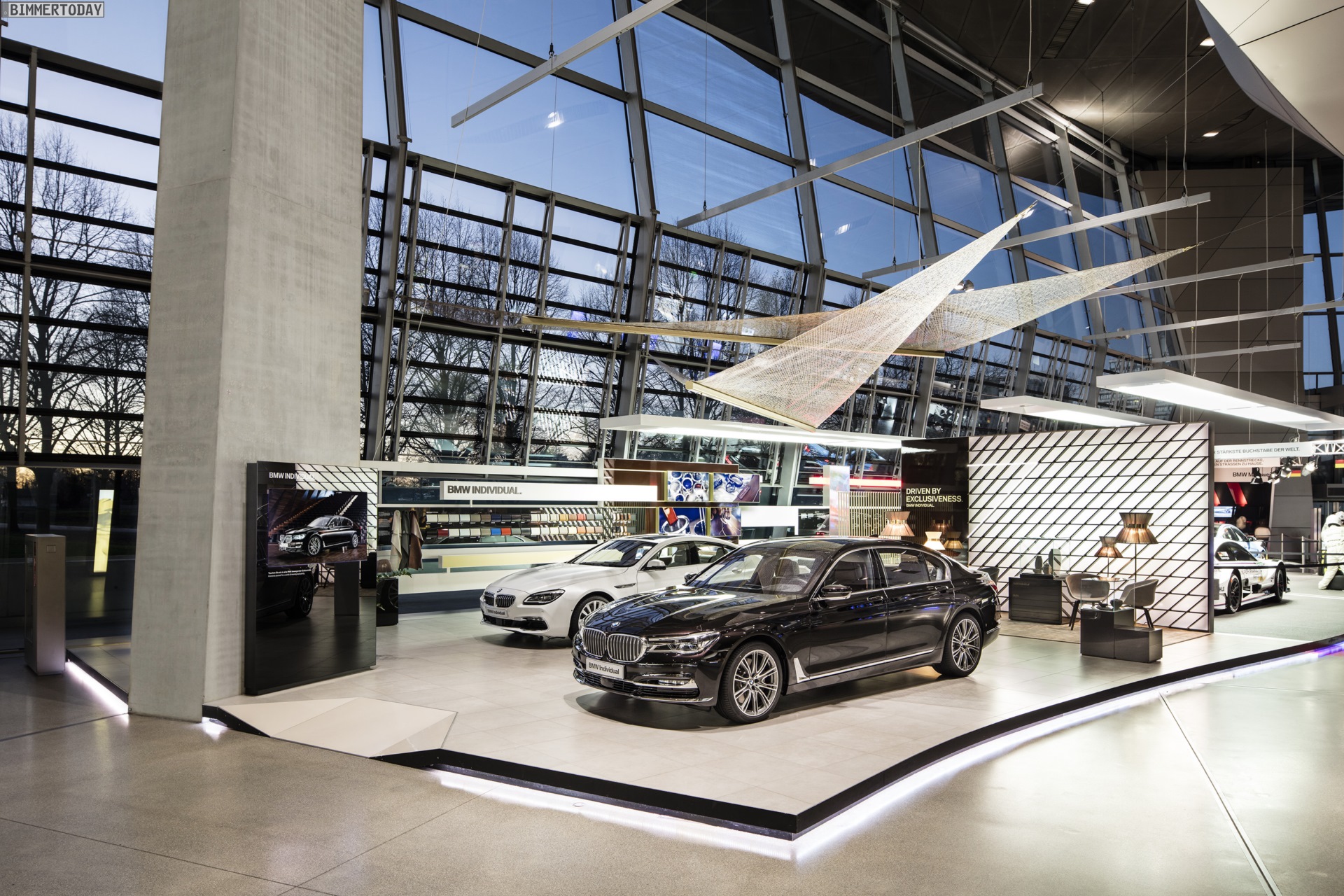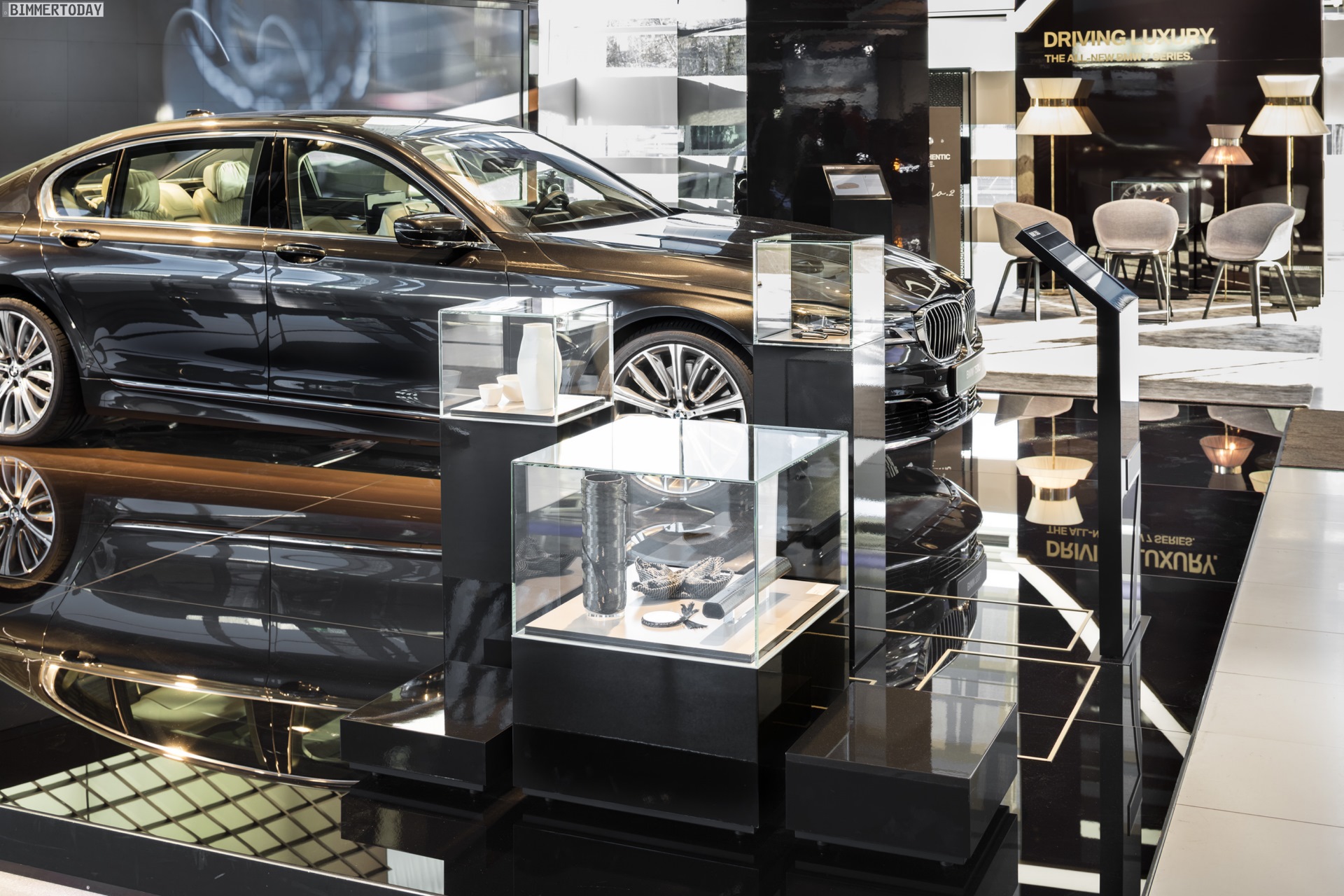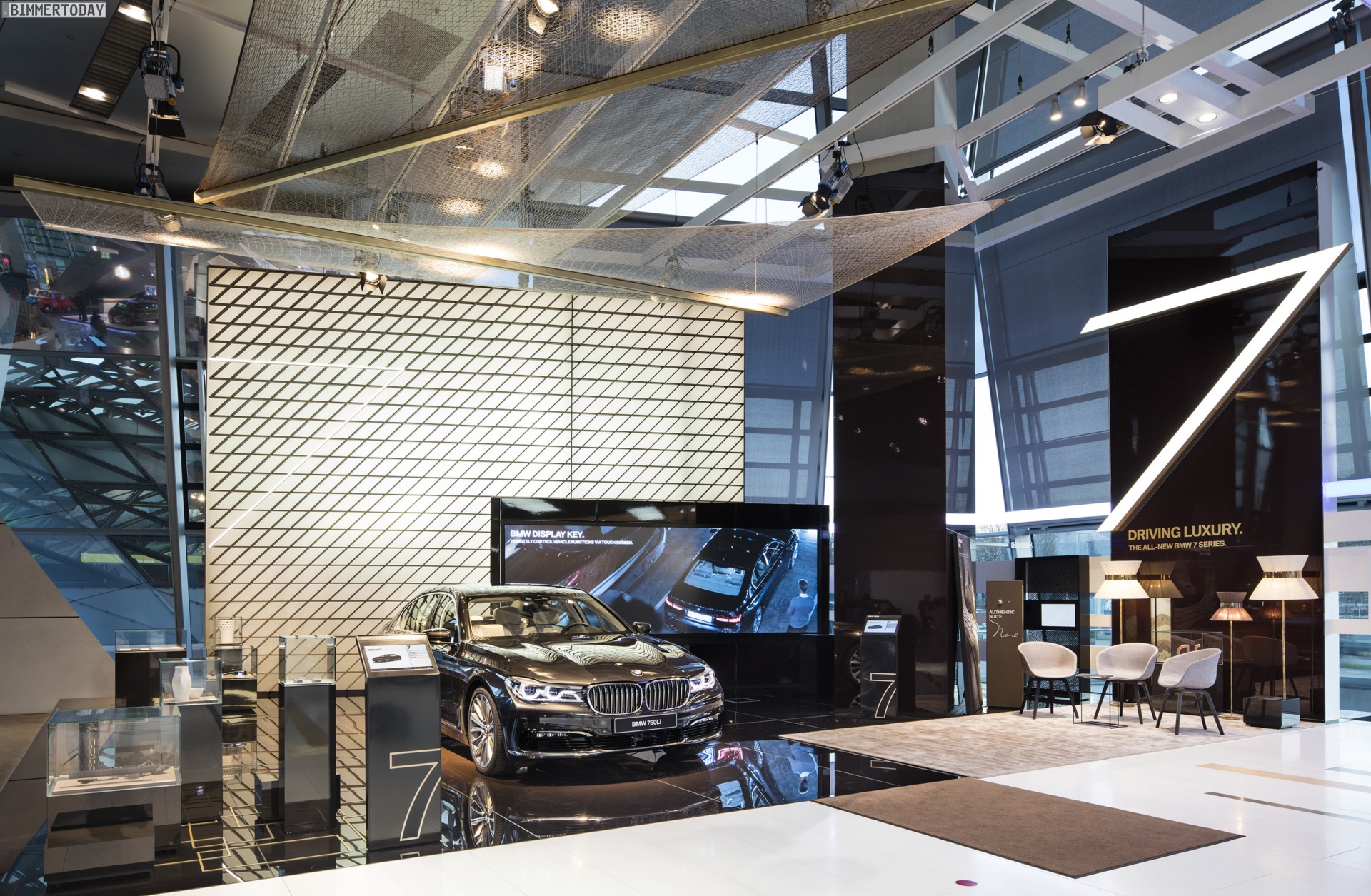 Über der Ausstellungsfläche schwebt ein Segel aus Carbon-Fasern, das auf den umfangreichen Einsatz des Hightech-Werkstoffs hinweist und zugleich dessen Leichtigkeit betont. Der neue BMW 7er G11 / G12 nutzt ein Carbon Core genanntes Leichtbau-Konzept, bei dem kohlefaserverstärkte Kunststoffe mit koventionellen Materialien wie Stahl und Aluminium kombiniert werden.