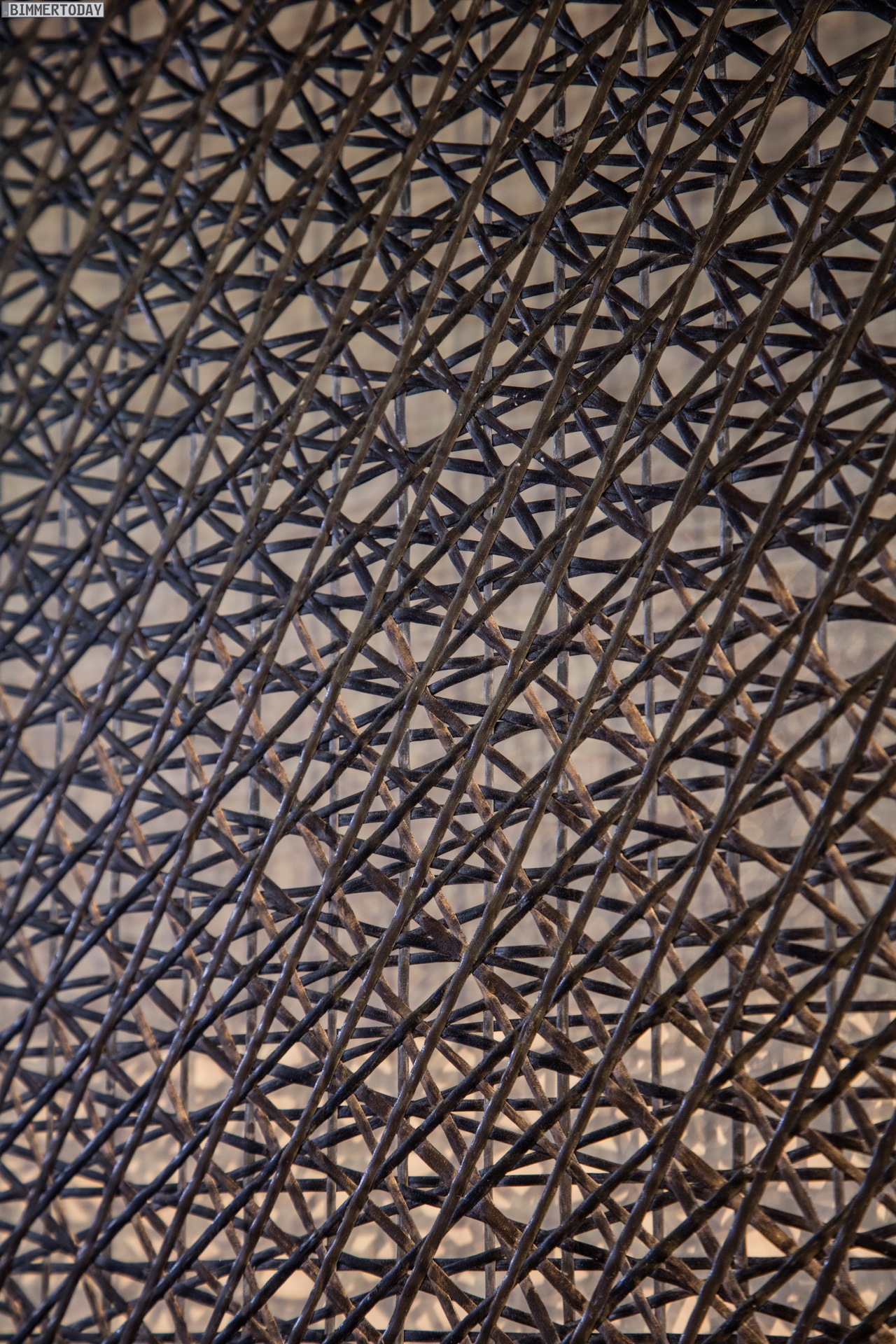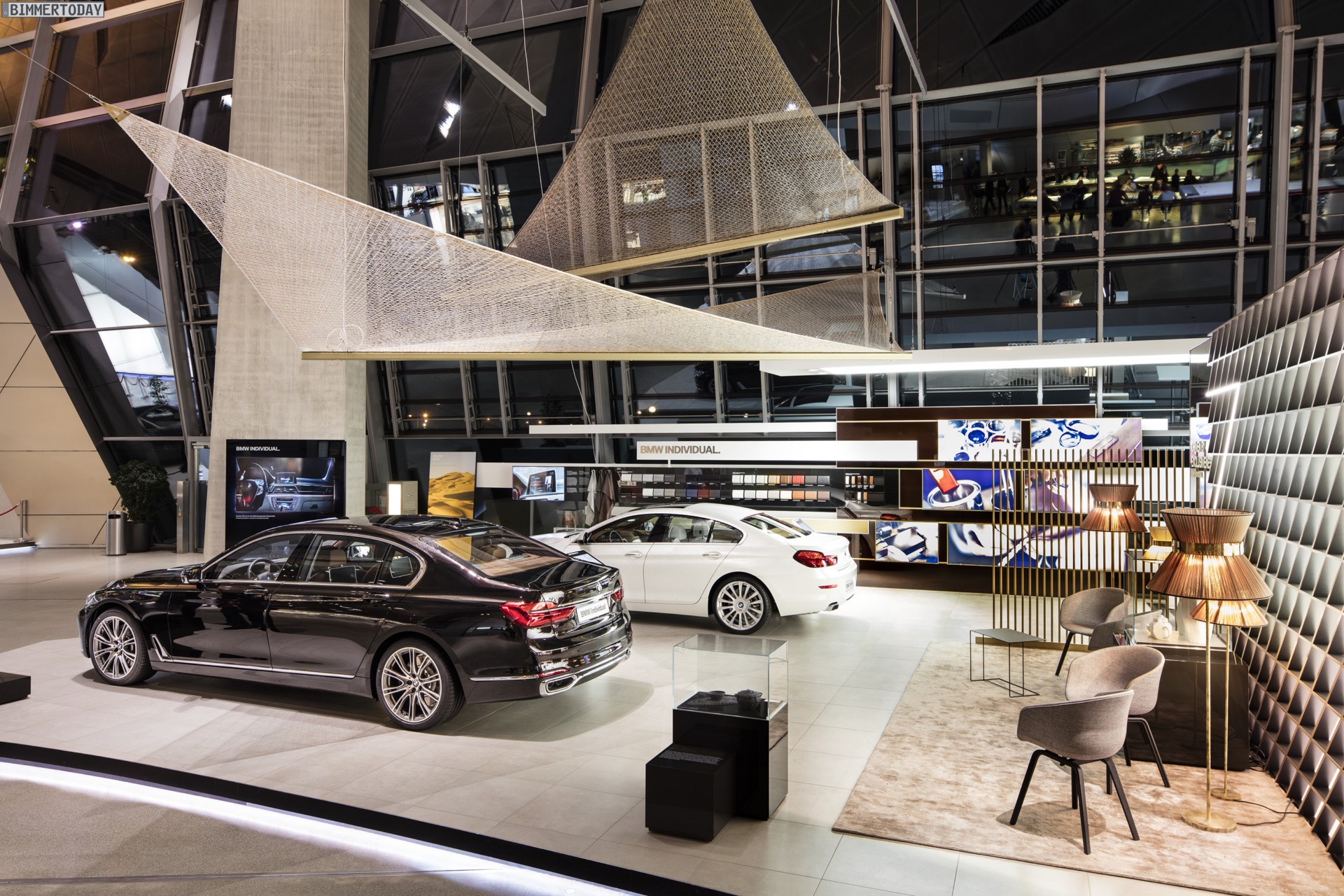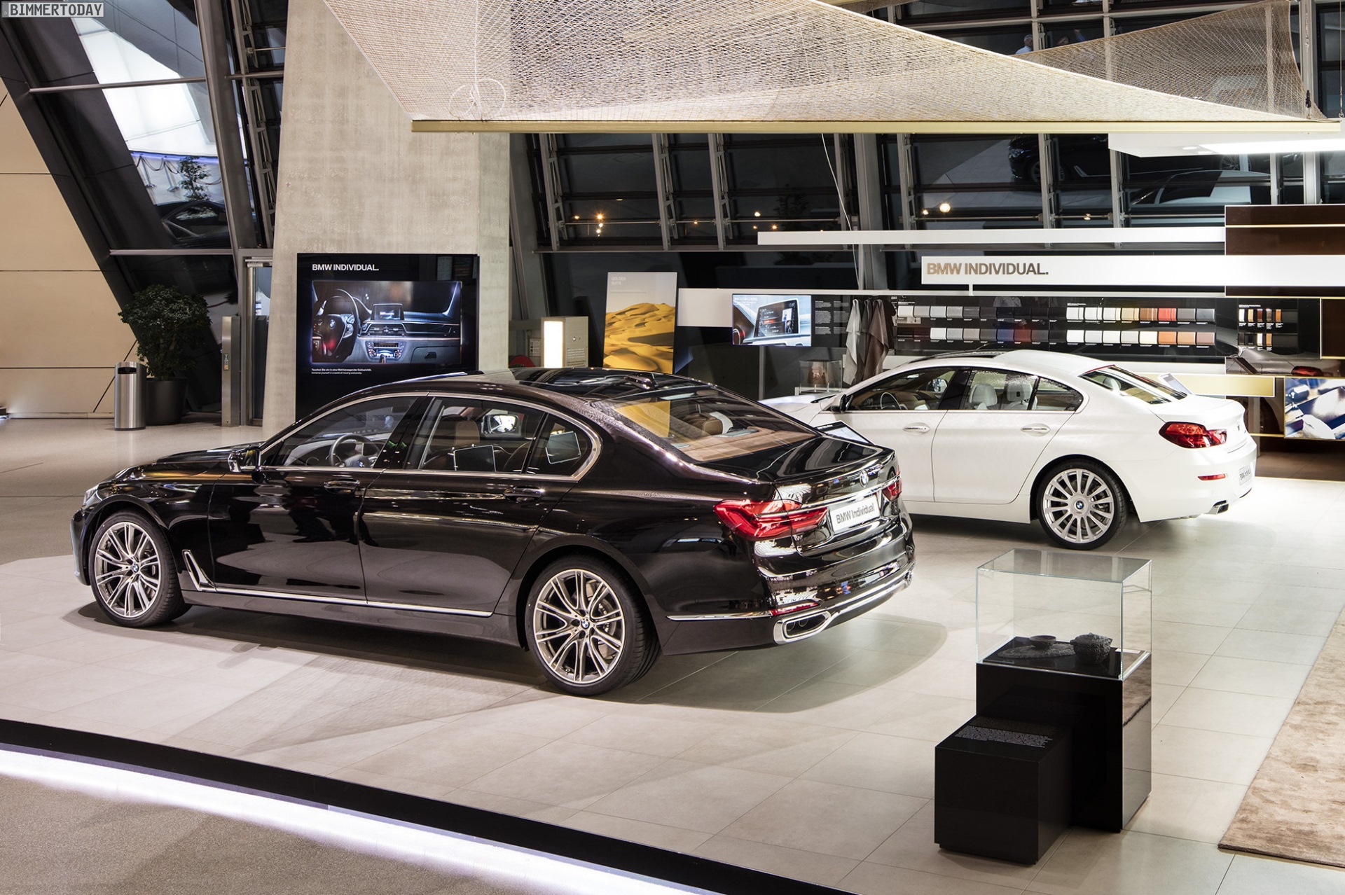 Über der Ausstellungsfläche schwebt ein Segel aus Carbon-Fasern, das auf den umfangreichen Einsatz des Hightech-Werkstoffs hinweist und zugleich dessen Leichtigkeit betont. Der neue BMW 7er G11 / G12 nutzt ein Carbon Core genanntes Leichtbau-Konzept, bei dem kohlefaserverstärkte Kunststoffe mit koventionellen Materialien wie Stahl und Aluminium kombiniert werden.