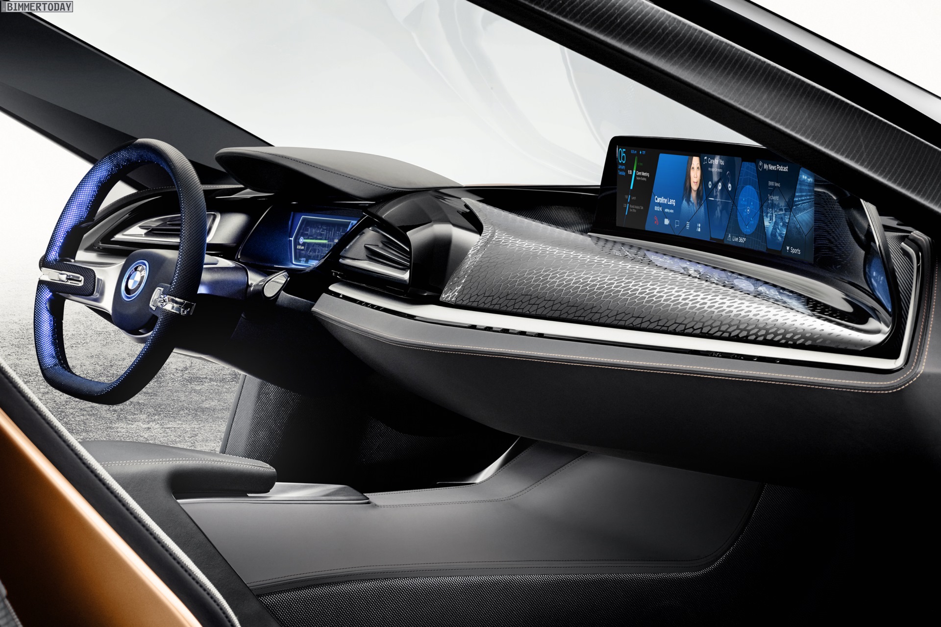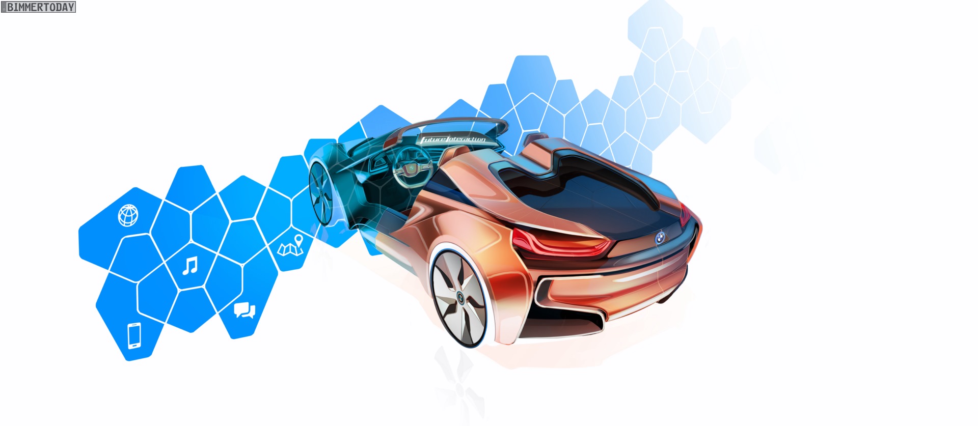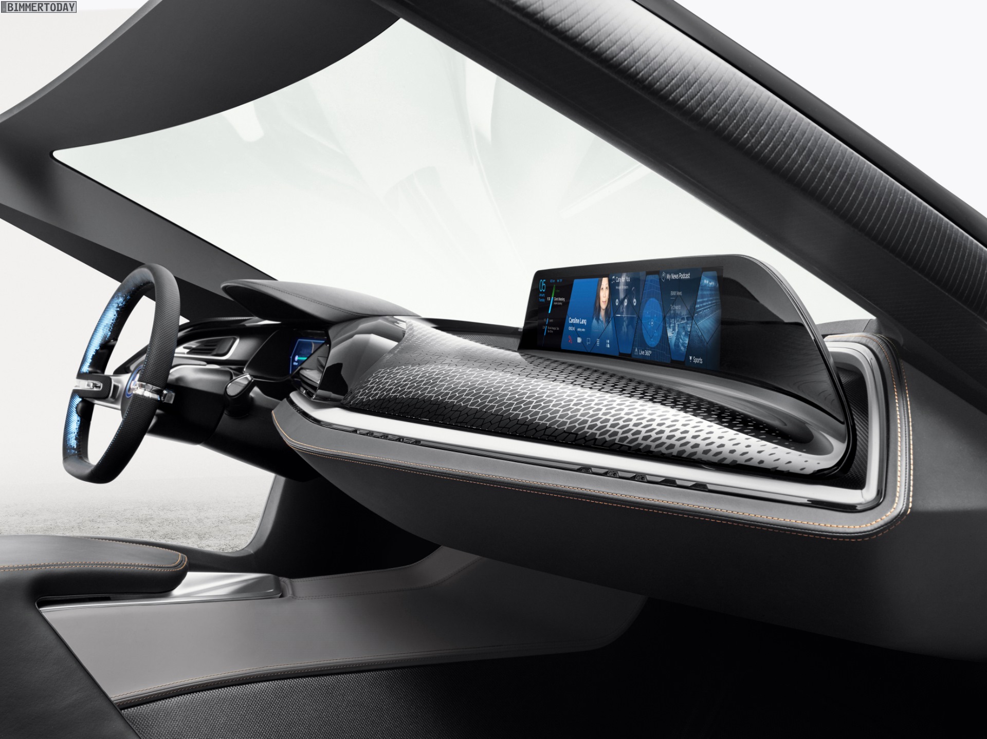 Im Vergleich mit dem gewöhnlichen i8 verfügt das BMW i Vision Future Interaction Concept über einen völlig neu gezeichneten Armaturenträger mit einer innovativen Anordnung der Infotainment-Displays. Das normalerweise mittig platzierte Display rückt dabei in deutlich vergrößerter und zudem gebogener Form vor den Beifahrer, für den Fahrer gibt es neben dem Head-Up-Display einen weiteren Bildschirm mit 3D-Darstellungen direkt hinter dem Lenkrad.