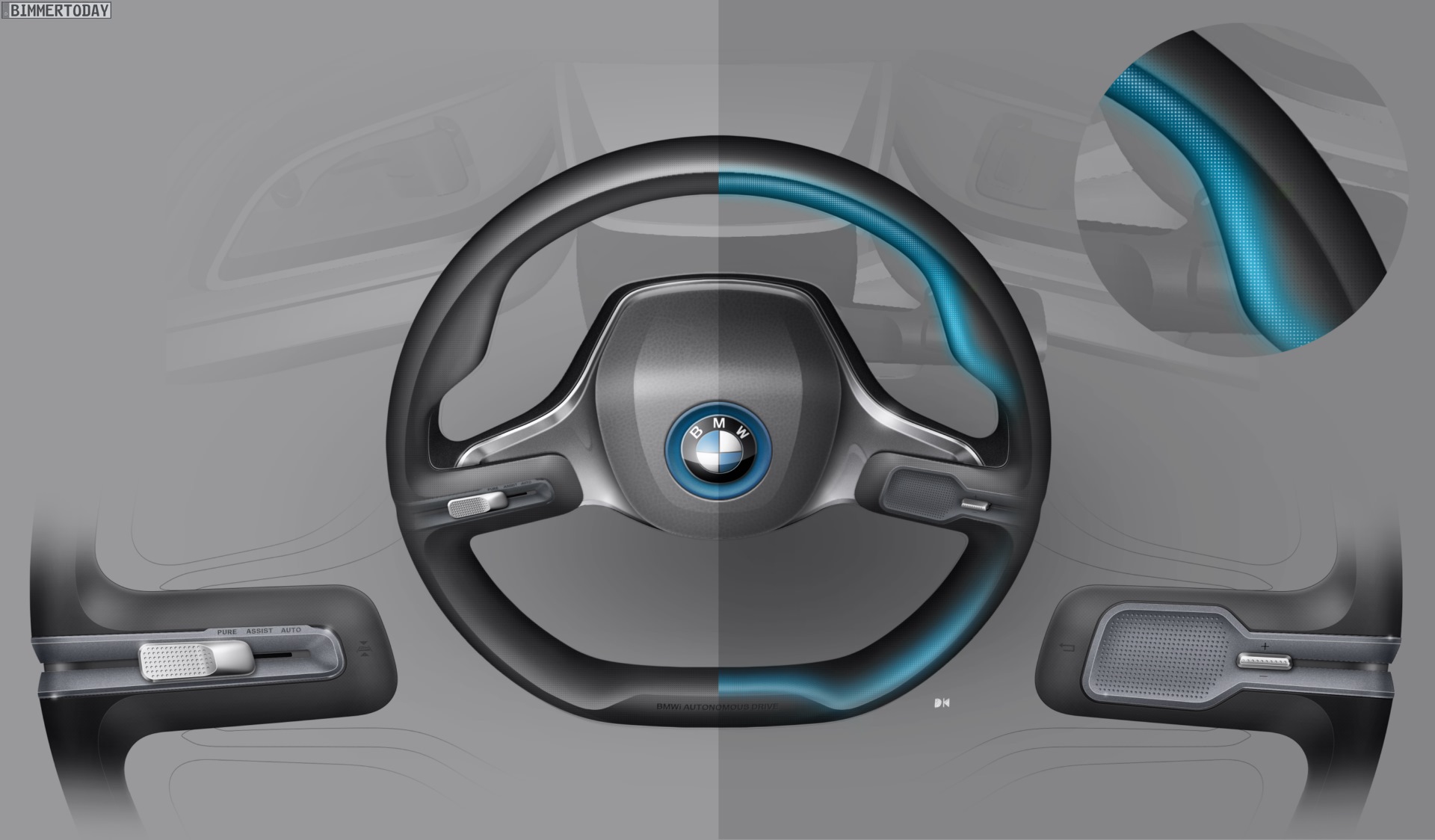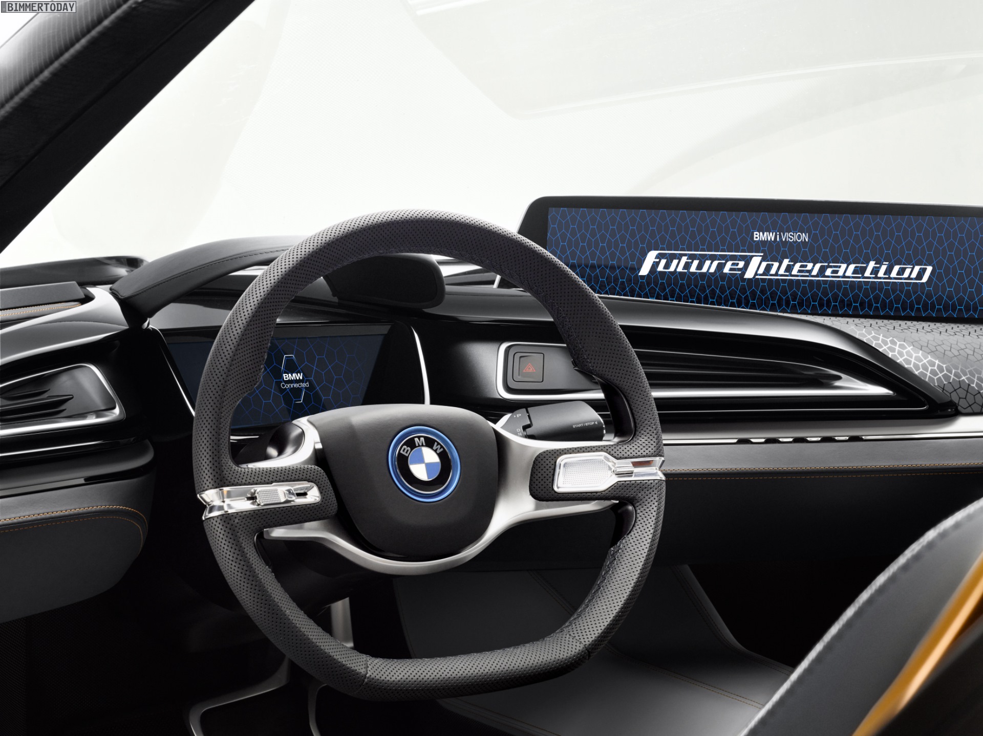 Abgesehen von den Infotainment-Displays verzichtet das BMW i Vision Future Interaction beinahe vollständig auf Bedienelemente in Form von Knöpfen und Schaltern, nur am Lenkrad gibt es noch Knöpfchen zur Auswahl des Fahrprogramms. Hier darf sich der Fahrer zwischen den Modi Pure Drive, Assist und Auto Mode entscheiden und damit darüber bestimmen, wie viel Kontrolle er dem Auto überlassen will. Während er im Modus Pure Drive selbst die volle Kontrolle hat, fährt der BMW i8 Spyder im Auto Mode hochautomatisiert und praktisch ohne Eingriffe des Fahrers.