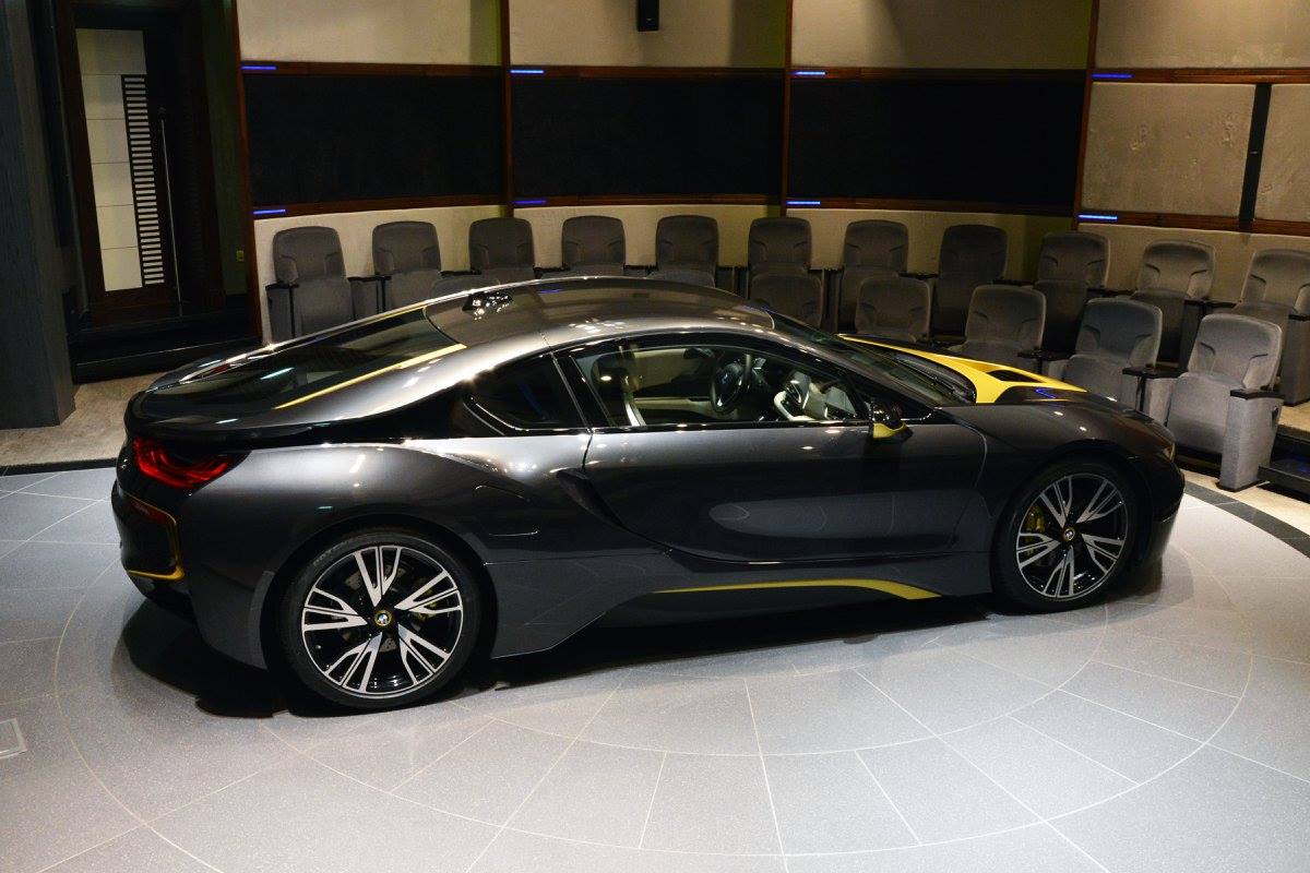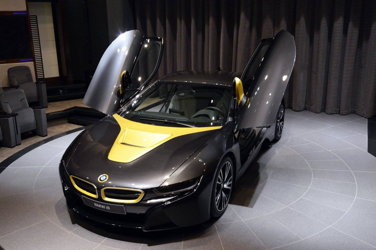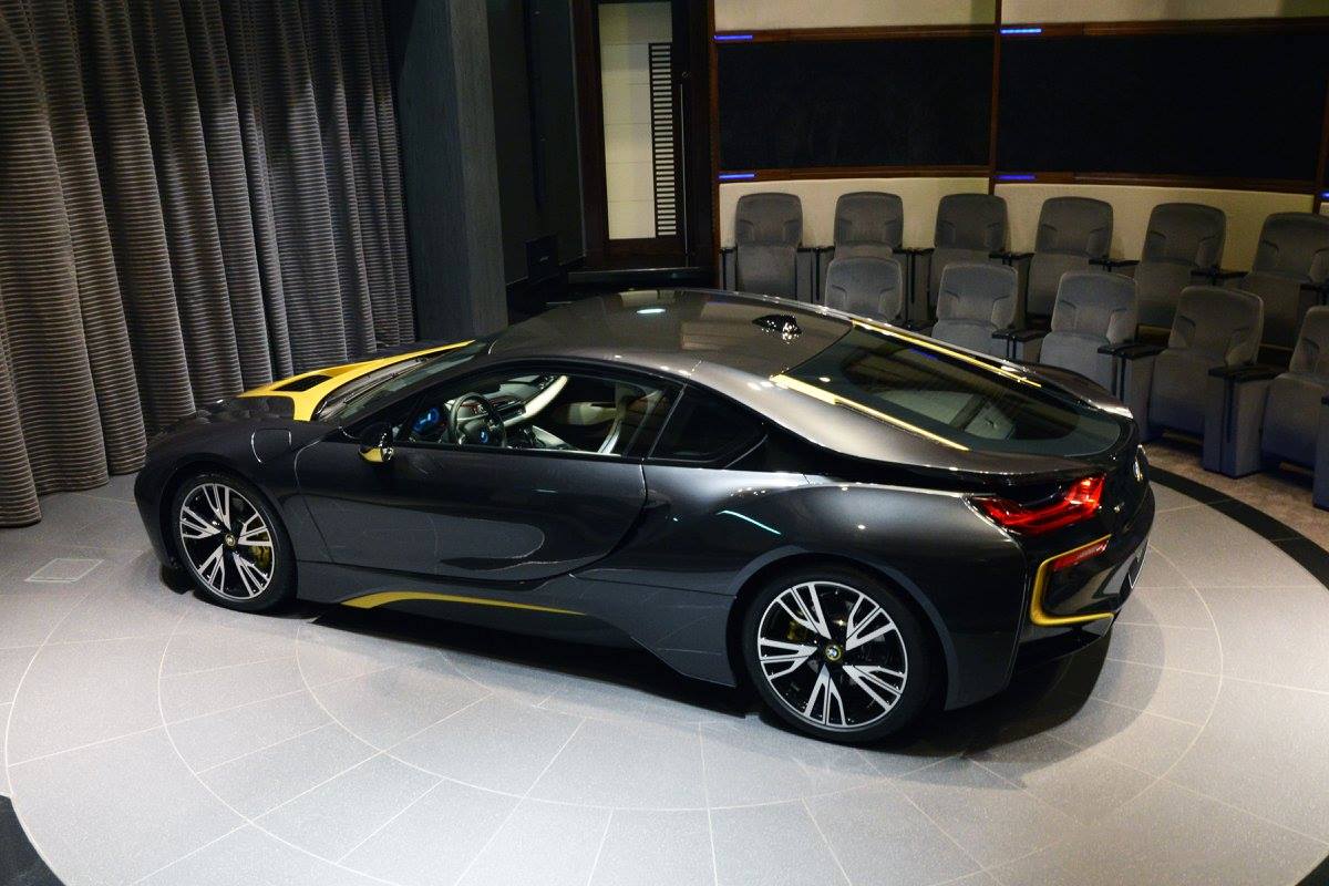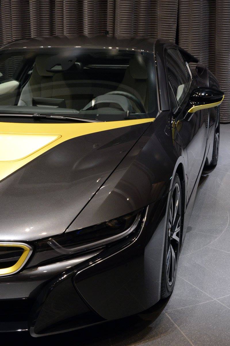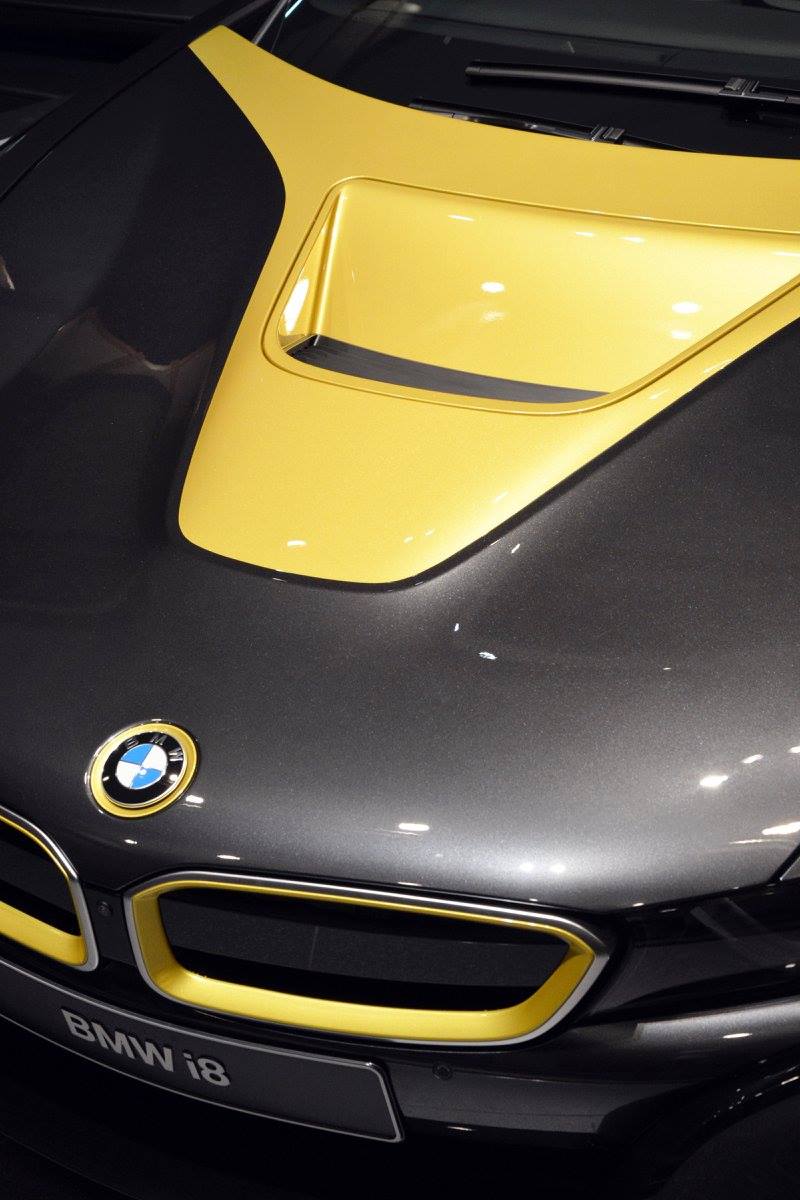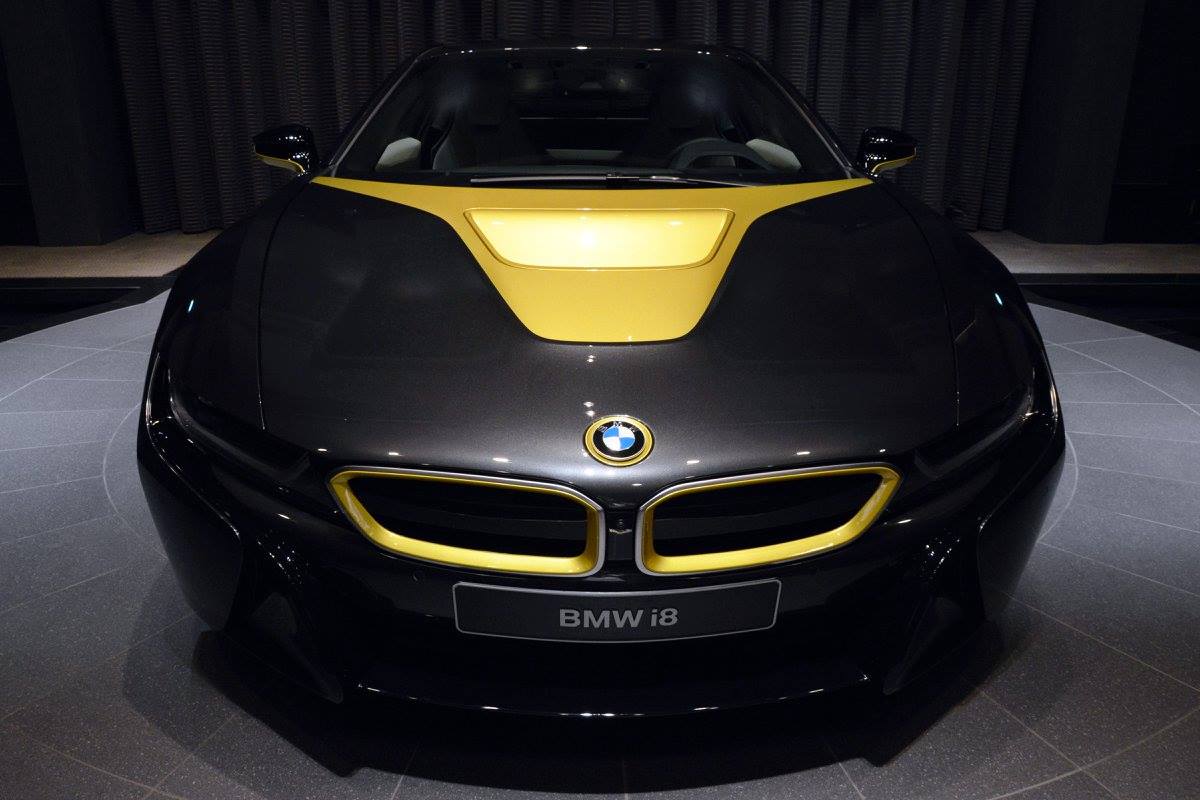 Ein weiteres Beispiel für die große Wirkung kleiner Maßnahmen liefert BMW Abu Dhabi Motors. Für ihren Showroom haben die Araber einen BMW i8 in Sophistograu mit Akzenten in Austin Yellow versehen und verpassen ihm so eine unverwechselbare Optik. Die gemeinsam mit den Mittelklasse-Sportlern M3 und M4 eingeführte und nach der Formel 1-Rennstrecke in Texas benannte Farbe kommt nicht nur an Nieren und Außenspiegeln zum Einsatz, sie ersetzt auch Elemente des sogenannten Black Belt und jene Akzente, die ab Werk in BMW i Blau lackiert sind.