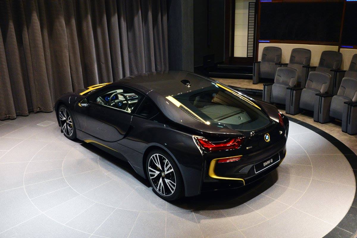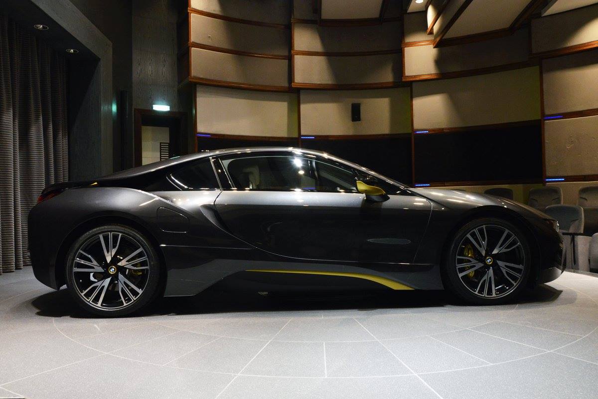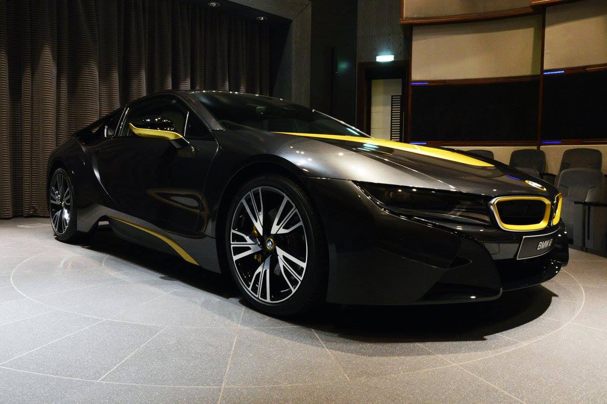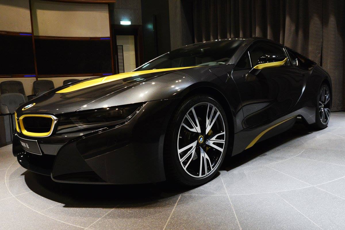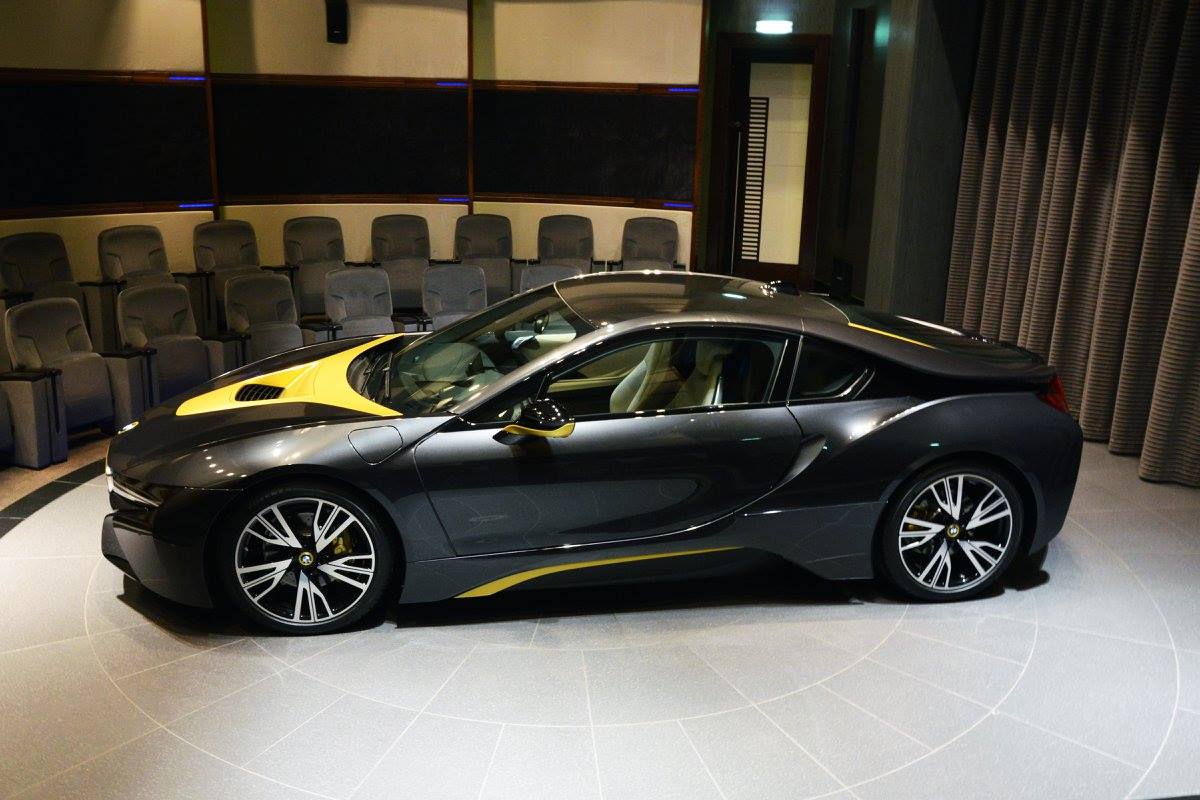 Ein weiteres Beispiel für die große Wirkung kleiner Maßnahmen liefert BMW Abu Dhabi Motors. Für ihren Showroom haben die Araber einen BMW i8 in Sophistograu mit Akzenten in Austin Yellow versehen und verpassen ihm so eine unverwechselbare Optik. Die gemeinsam mit den Mittelklasse-Sportlern M3 und M4 eingeführte und nach der Formel 1-Rennstrecke in Texas benannte Farbe kommt nicht nur an Nieren und Außenspiegeln zum Einsatz, sie ersetzt auch Elemente des sogenannten Black Belt und jene Akzente, die ab Werk in BMW i Blau lackiert sind.