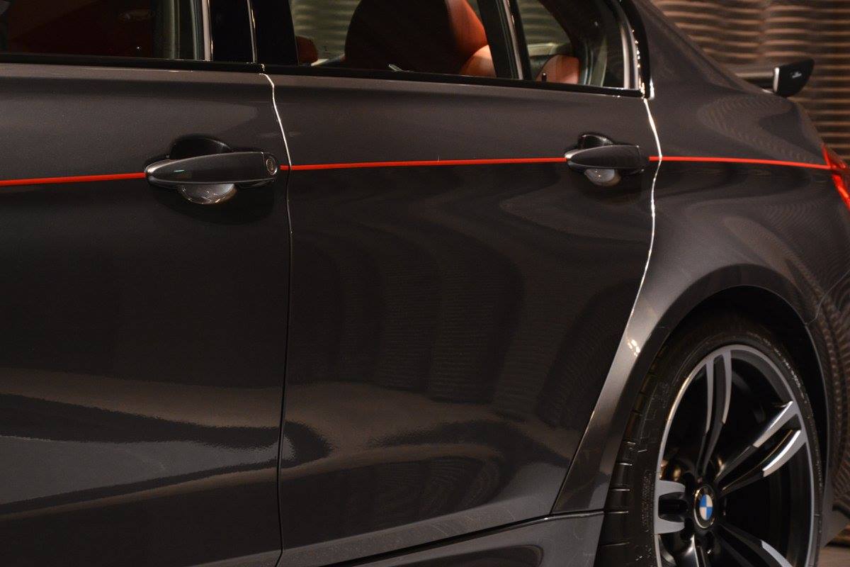 Auch akustisch grenzt sich der gezeigte BMW M3 F80 LCI dank der verbauten Akrapovic Evolution-Abgasanlage samt Downpipes und Titan-Endrohren klar von der Serie ab. Den vielleicht wichtigsten Akzent setzen allerdings die roten Linien, die viele Details der sportlichen Mittelklasse-Limousine gesondert betonen.