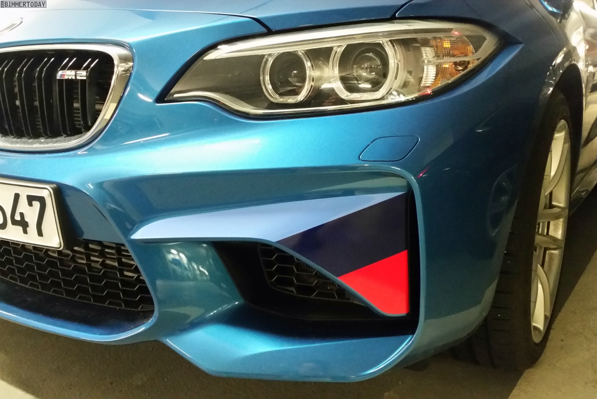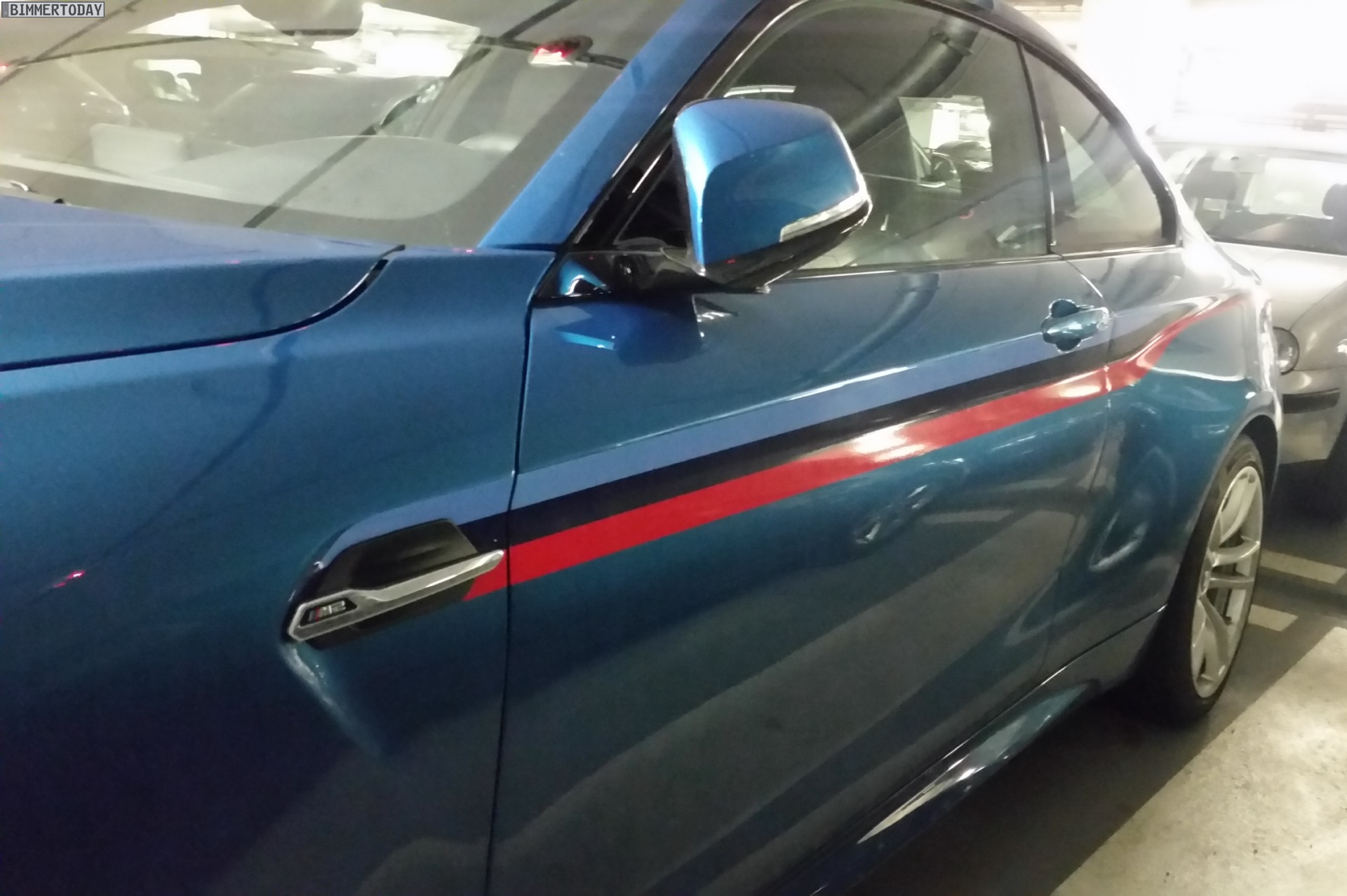 Vor wenigen Tagen konnten wir das erste Foto eines weißen BMW M2 mit M Performance-Dekor zeigen, nun haben wir einige Tiefgaragen-Fotos eines entsprechend beklebten M2 in der Launch-Farbe Long Beach Blue. Unser Leser Todor hat den Werkstestwagen in einer Garchinger Tiefgarage entdeckt und gleich einige Fotos für uns gemacht, so sehen wir die Farben von BMW Motorsport erstmals an einem blauen M2.