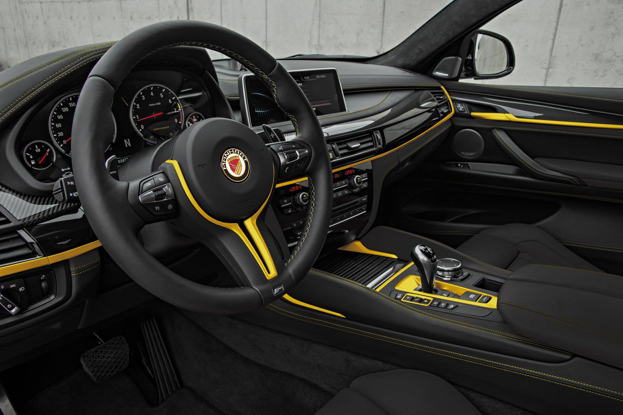 Mit seinen gelben Interieurleisten grenzt sich der Innenraum schon auf den ersten Blick deutlich stärker von der Serie ab als das Exterieur, gelbe Ziernähte und geprägte Manhart-Schriftzüge in den Kopfstützen runden die Überarbeitung ab. Und weil sich nach dem Tuning auch unter der Haube viel getan hat, darf natürlich auch eine knallgelbe Motorabdeckung im Manhart-Design nicht fehlen.