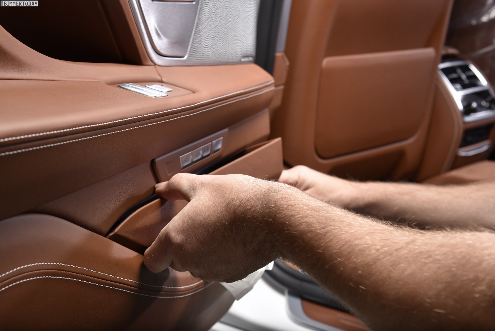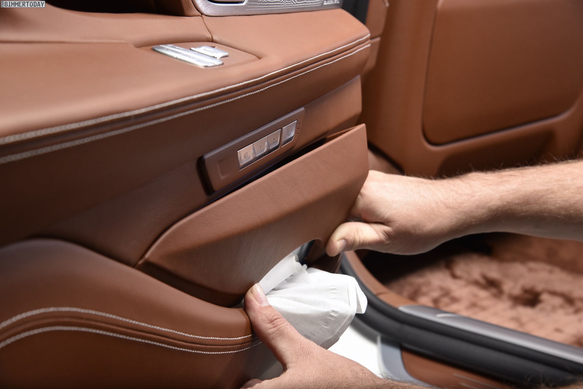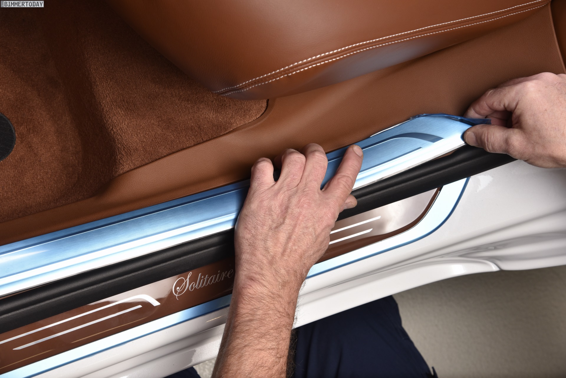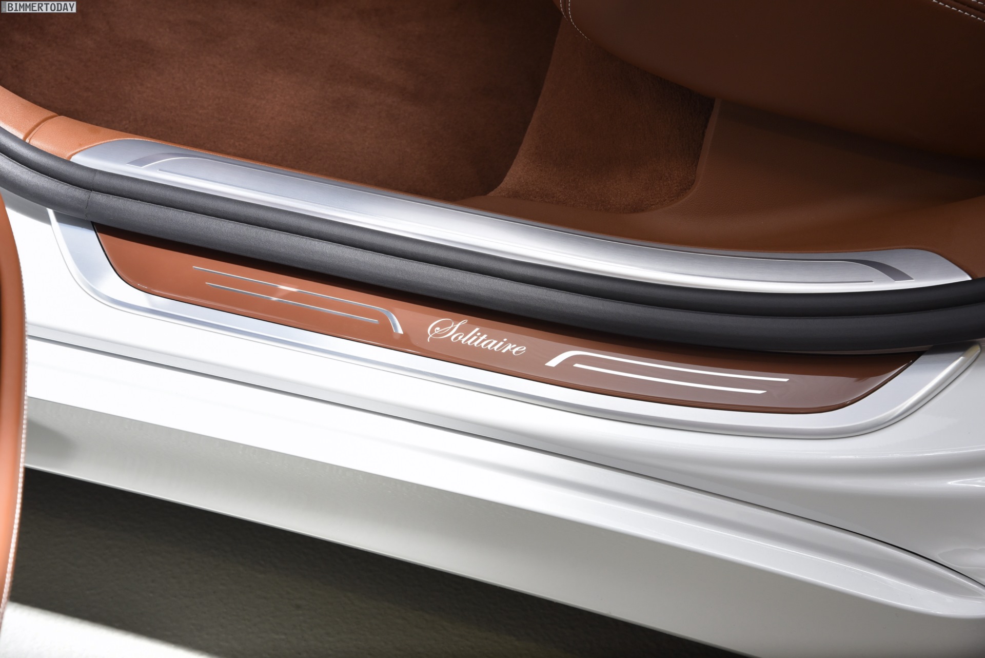 Doch auch die hochwertigste Sonderlackierung kann nicht davon ablenken, dass die eigentlichen Höhepunkte der BMW 7er Solitaire Edition im Innenraum gesetzt wurden. Hier sorgt eine umfangreiche verfeinerte Volllederausstattung Merino Feinnarbe im Farbton Tartufo für edles Ambiente, auch der Dachhimmel aus Alcantara ist im gleichen Farbton gehalten. Besonders weiche Lammfell-Fußmatten, in farblich passendem Leder bezogene Kosmetiktücher-Boxen in beiden Fond-Türen sowie Alcantara-Kissen mit eingesticktem Solitaire-Schriftzug unterstreichen die besondere Stellung der seltenen Sondermodelle.