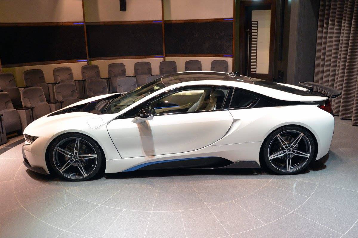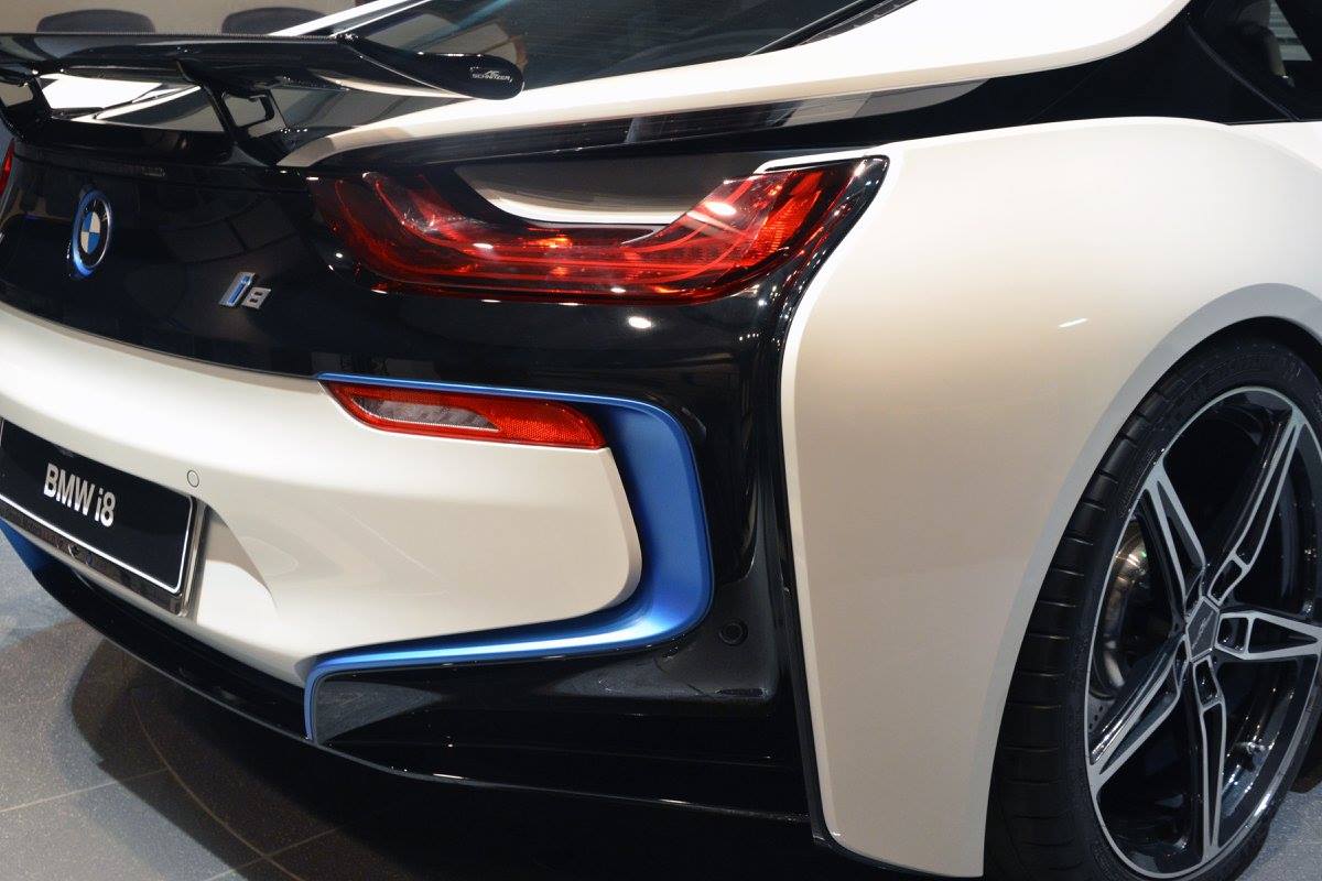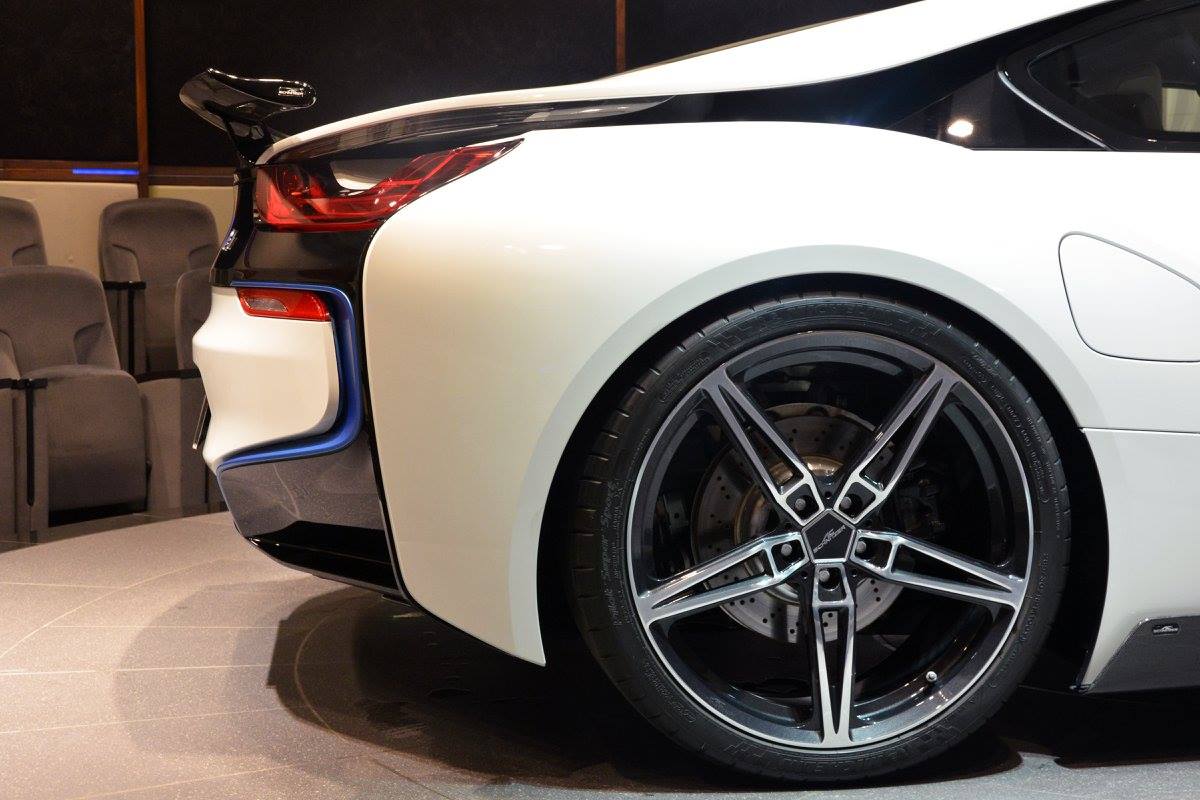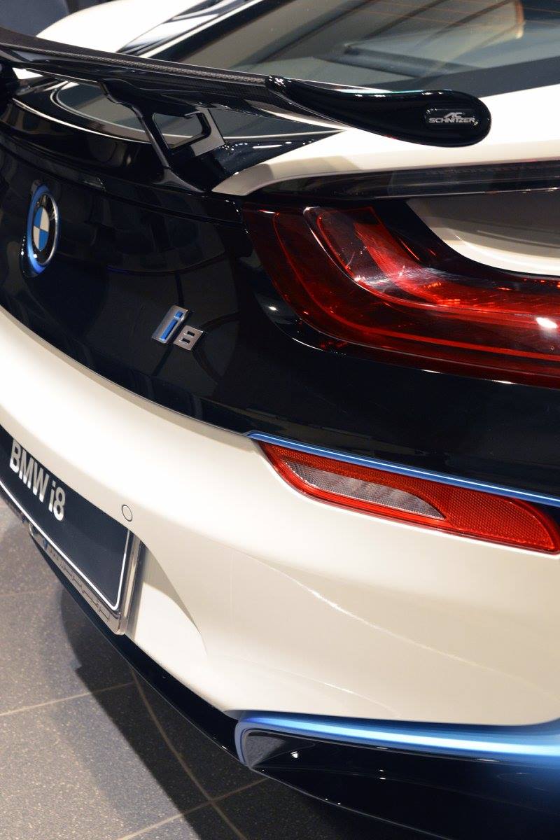 Der gezeigte Plug-in-Hybrid steht auf 21 Zoll großen Schnitzer-Felgen und trägt außerdem die Aerodynamik-Komponenten aus Aachen, die in Sicht-Carbon ausgeführt sind und so farbliche Akzente zur hellen Lackierung in Kristallweiß Perleffekt setzen. Außerdem passt der Hightech-Werkstoff auch technisch perfekt zum BMW i8, dessen komplette Fahrgastzelle aus Carbon besteht und entscheidend zum vergleichsweise niedrigen Gewicht des Hybriden beiträgt.