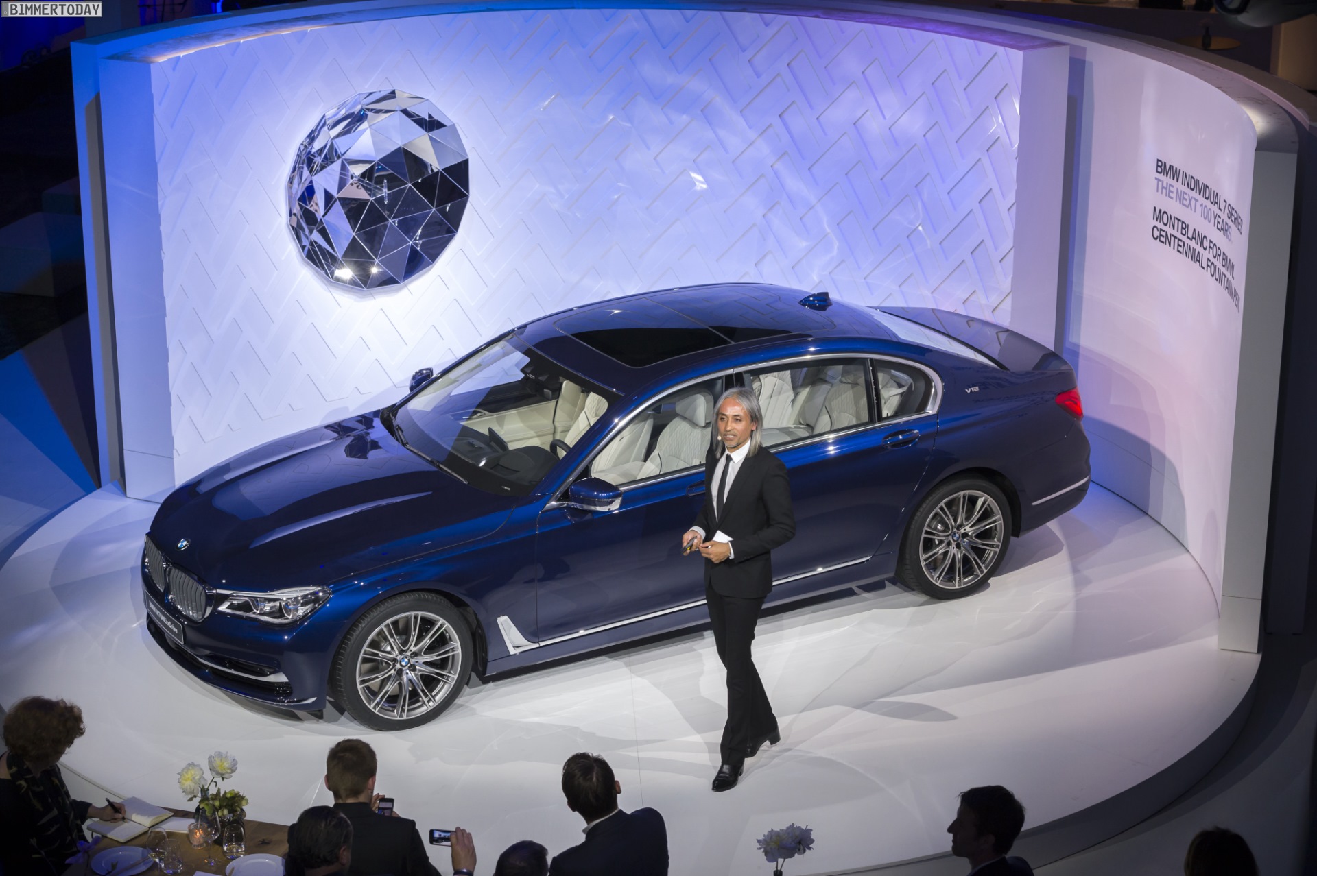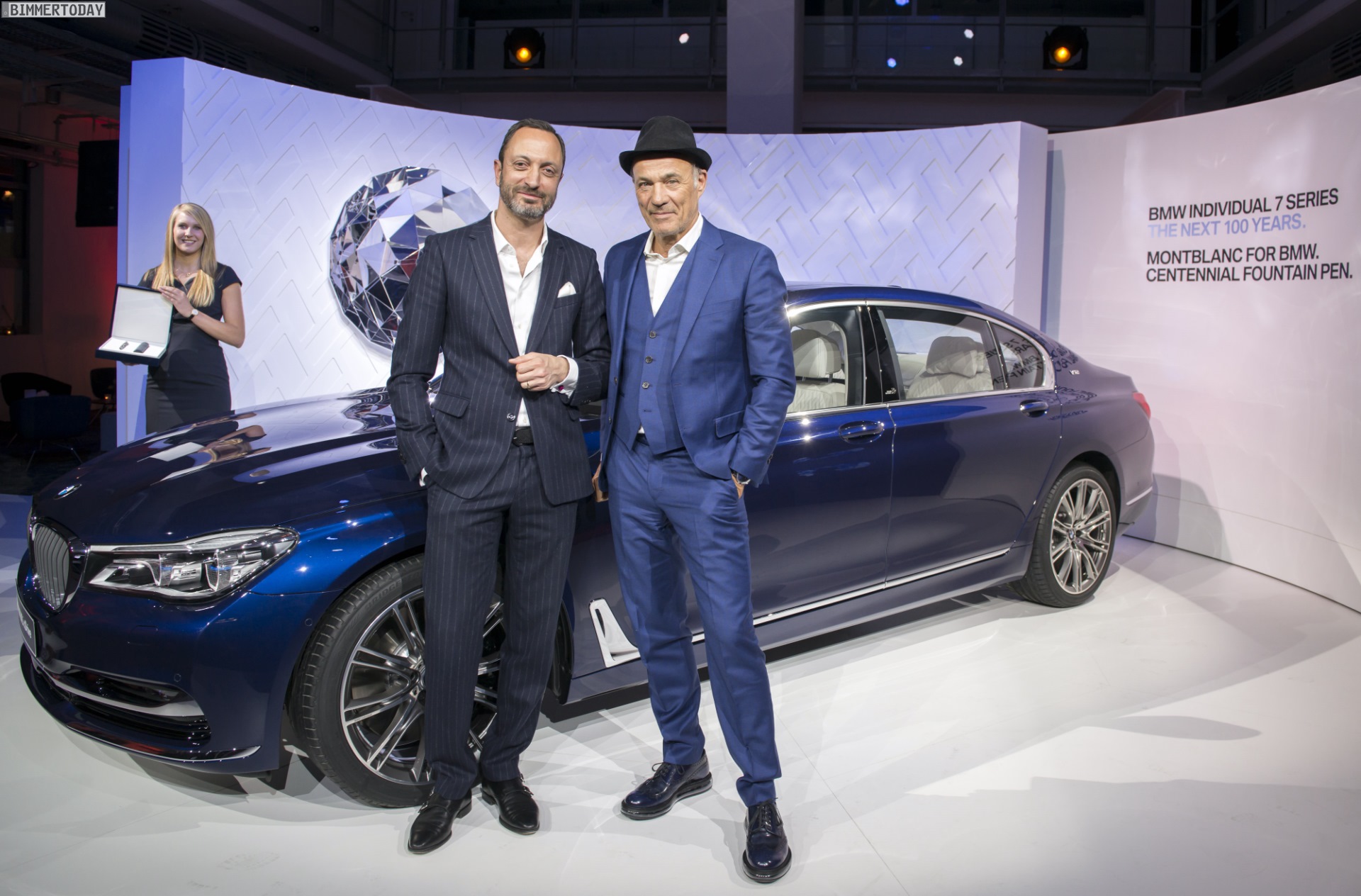 Zur Vorstellung waren nicht nur Karim Habib, Leiter BMW Design, und Hildegard Wortmann, Leiterin Produktmanagement Automobile und Aftersales, sondern auch der Montblanc-CEO Jérôme Lambert sowie der Montblanc Creative Director Zaim Kamal vor Ort. Zu jedem Exemplar der BMW 7er The Next 100 Years Edition gehört auch der ebenfalls auf 100 Stück limitierte Montblanc Centennial Fountain Pen, der einige zentrale Designelemente und die Farbe der Luxuslimousine aufgreift.