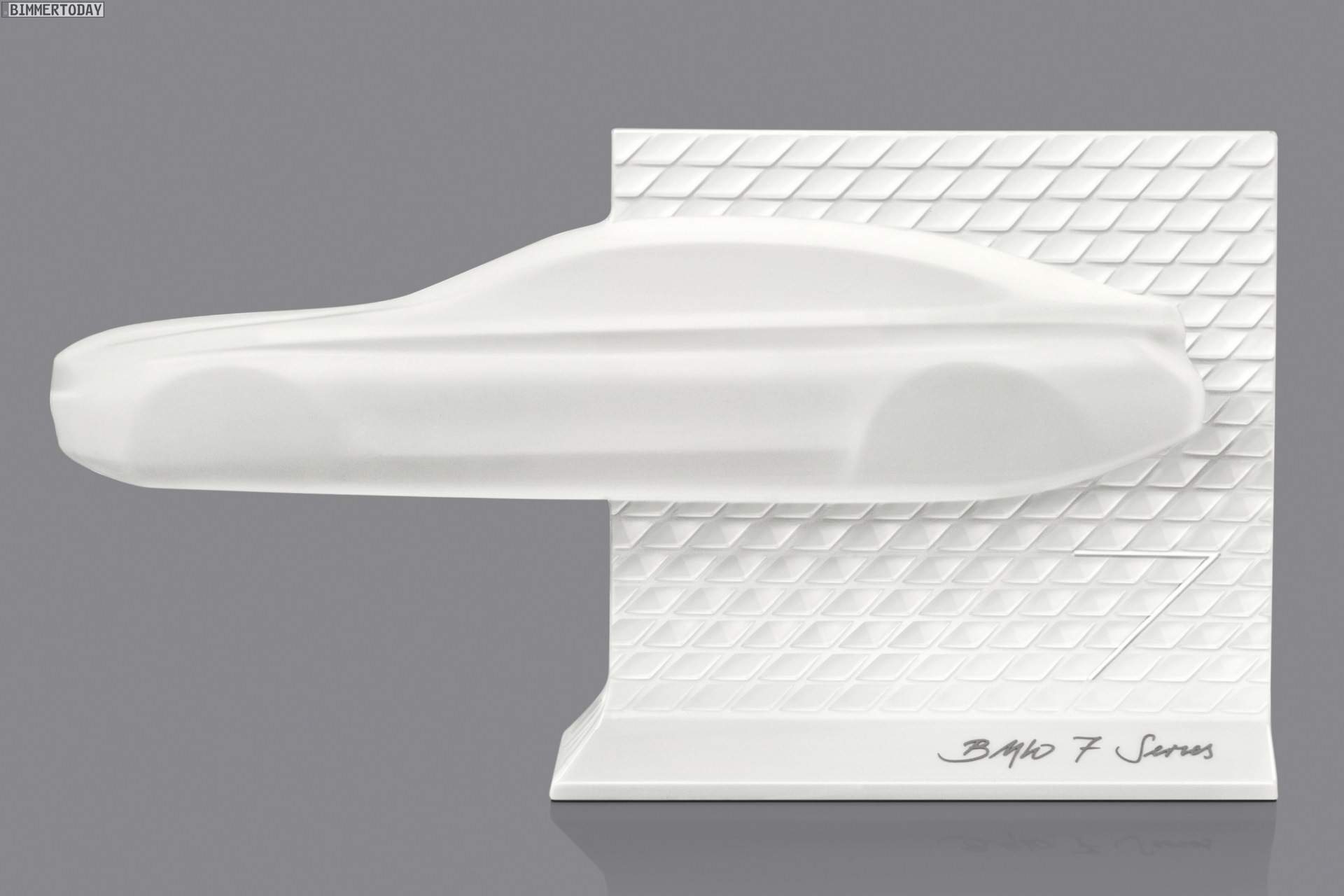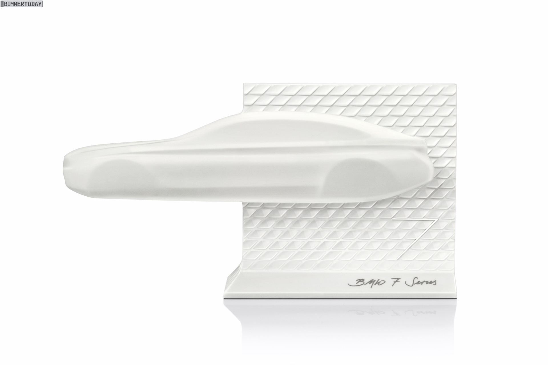 Der im Maßstab 1:18 angefertigte BMW 7er ist rund 30 Zentimeter lang und lässt die auf 500 Exemplare limitierte Skulptur zu einem echten Hingucker werden. Die Skulpturen werden von der KPM Berlin in hundertprozentiger Handarbeit gefertigt, weshalb sich der kalligraphische Schriftzug “BMW 7 Series” am Fuß des Sockels auch problemlos individualisieren lässt. Ab Juli 2016 wird die Skulptur auch in Deutschland bei ausgewählten BMW-Händlern erhältlich sein, zum Preis gibt es derzeit noch keine Aussagen.