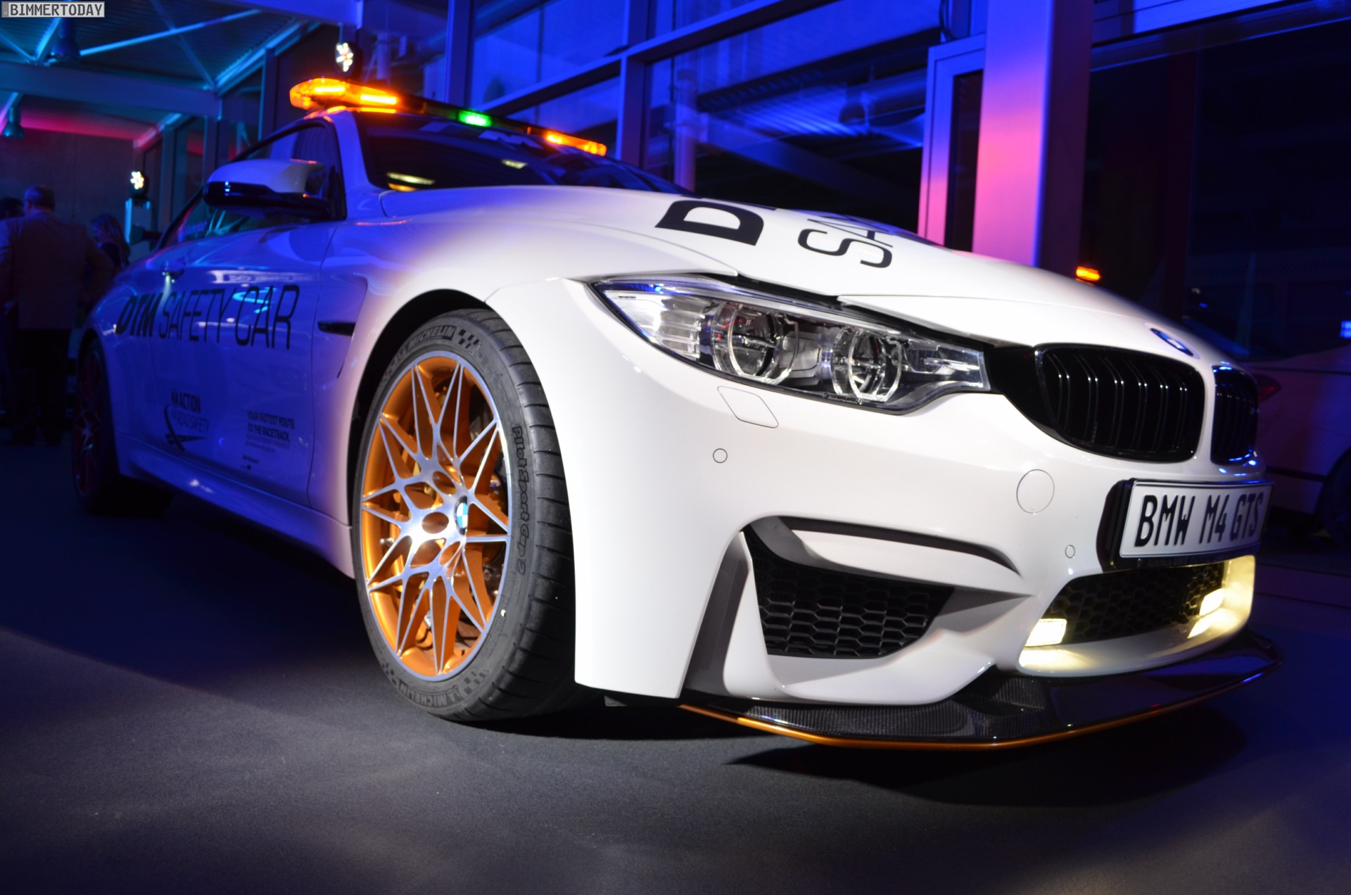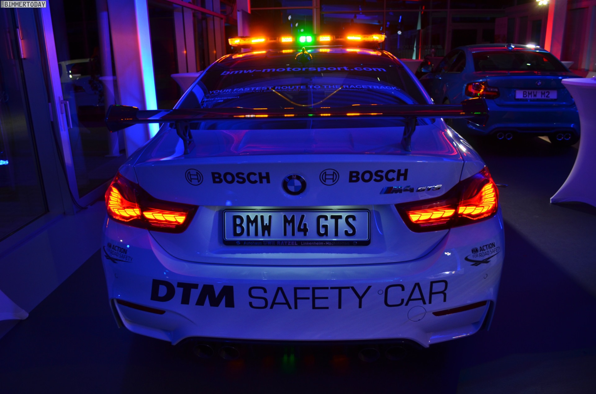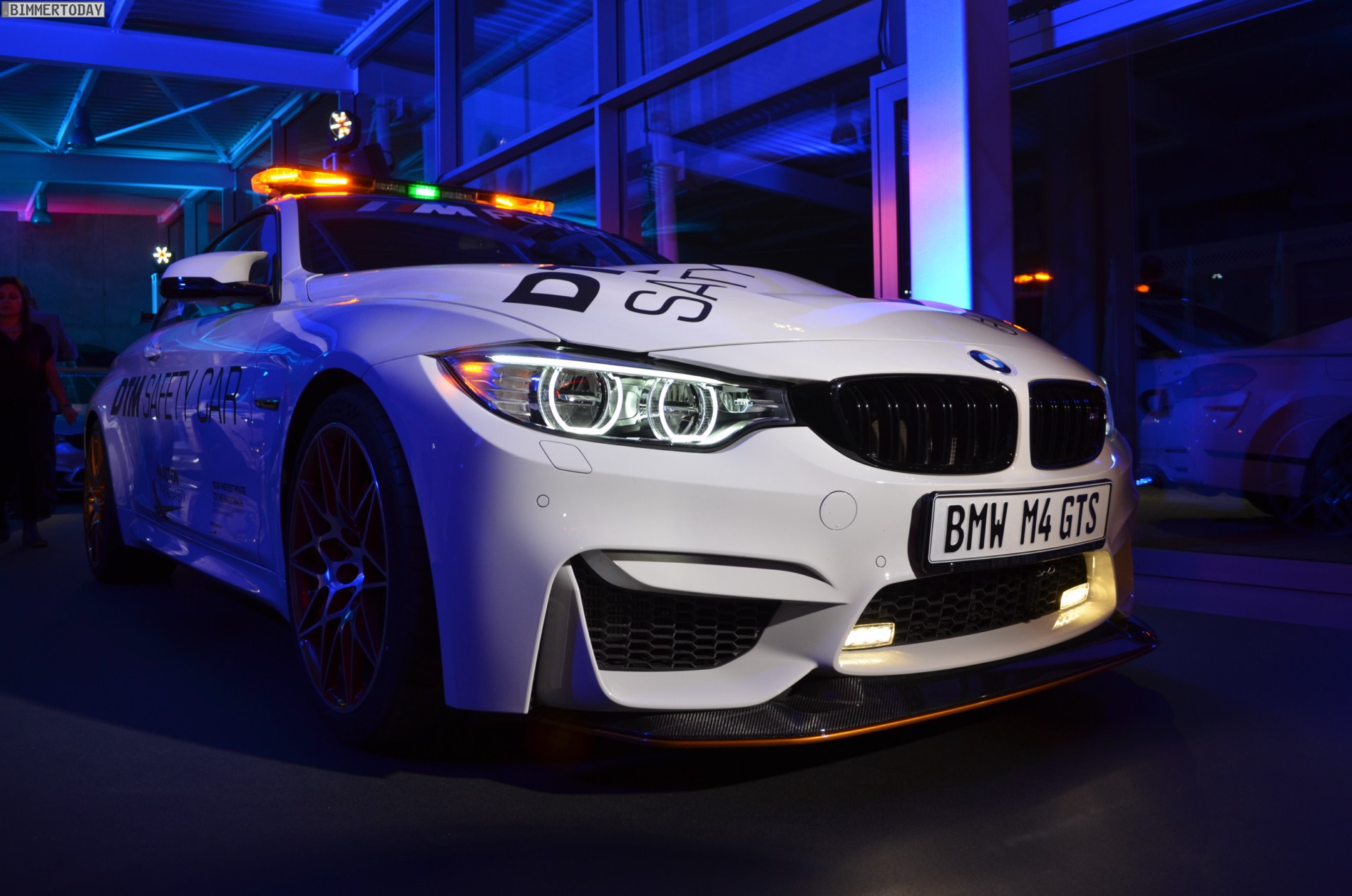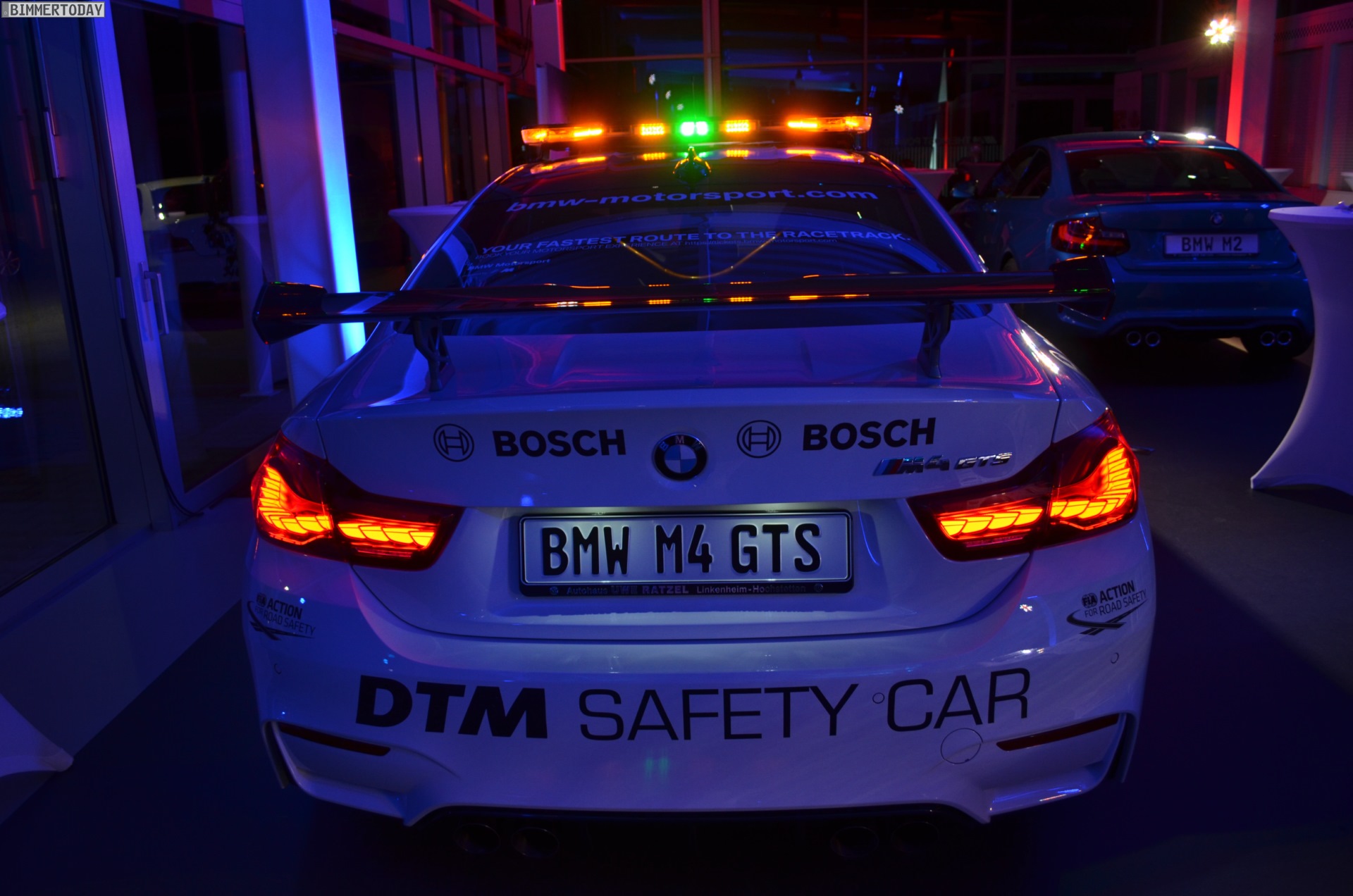 Mit seiner auffälligen Lichtanlage auf dem Dach sorgt das BMW M4 GTS DTM Safety Car bei Dunkelheit im Alleingang für eine beeindruckende Lightshow, im Rahmen der DTM sollen die Lichtsignale für Sicherheit auf der Rennstrecke sorgen. Zum Einsatz kommt das Safety Car bei den Rennen in Hockenheim, Spielberg und auf dem Lausitzring. Bei den übrigen Rennen werden die anderen Hersteller mit modifizierten Fahrzeugen aus ihrem Programm für Sicherheit sorgen.