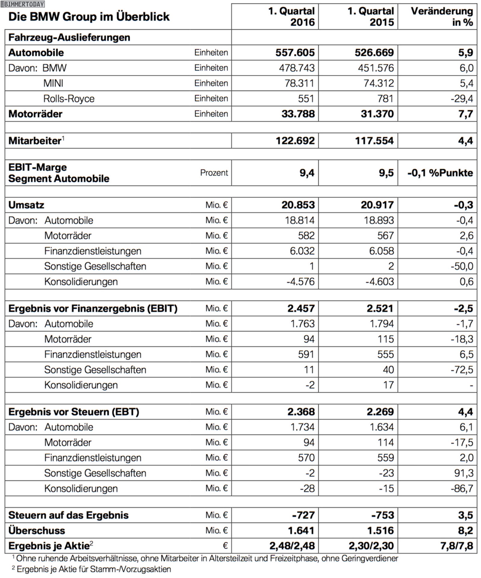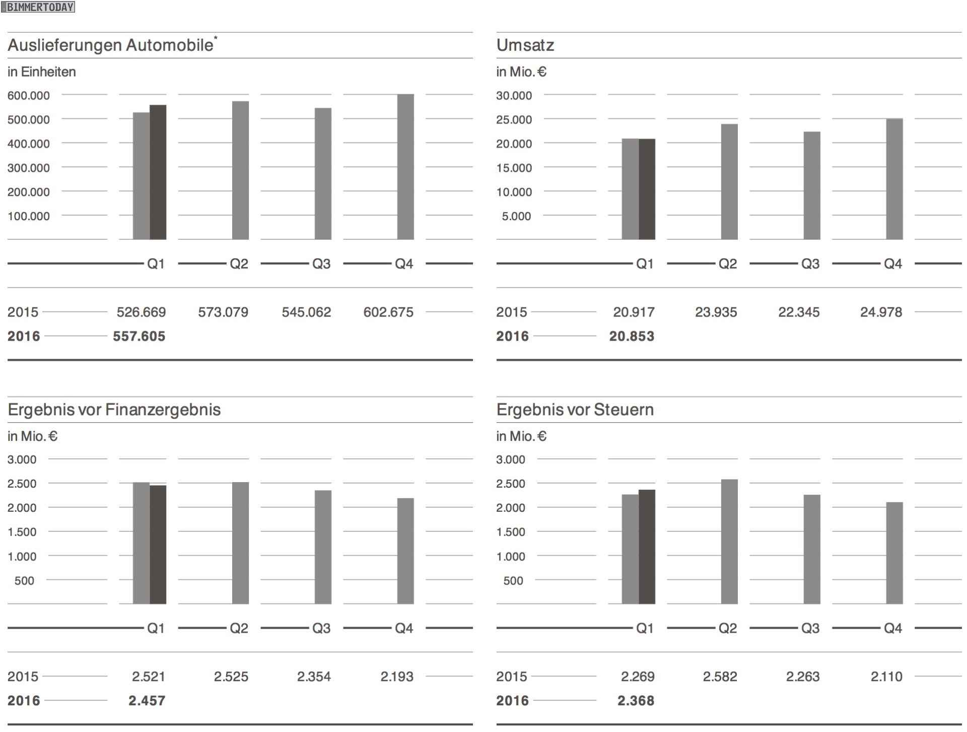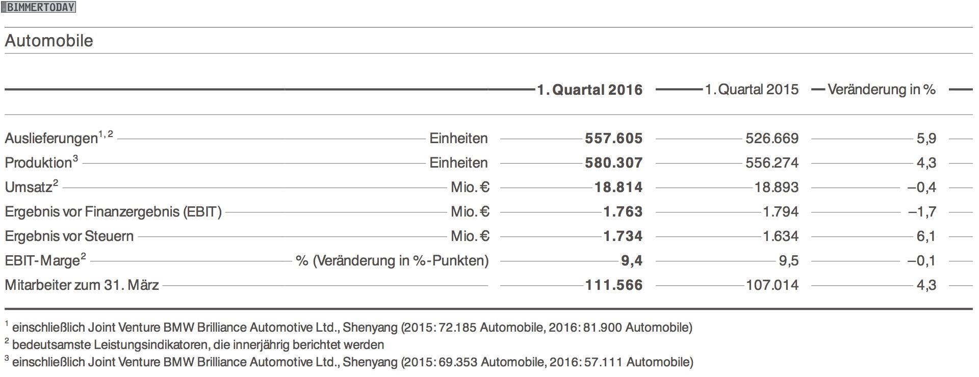 Etwas schwächer als von Analysten erhofft fallen die Zahlen der BMW Group für das 1. Quartal 2016 aus. Im Quartalsbericht verkünden die Münchner einen leichten Umsatz-Rückgang um 0,3 Prozent auf 20,853 Milliarden Euro, das Ergebnis vor Finanzergebnis (EBIT) schrumpft im Vergleich zum Vorjahr um 2,5 Prozent auf 2,457 Milliarden Euro. Wirklich enttäuschend sind die Zahlen aber keineswegs, schließlich gibt es neben den genannten Rückgängen auch einige neue Rekorde und Bestwerte für die BMW Group.