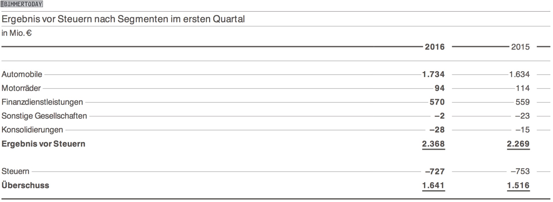 Sowohl der Absatz (557.605 Einheiten / +5,9%) als auch das Ergebnis vor Steuern (2,368 Milliarden Euro / +4,4%) waren in Q1 2016 höher als in jedem anderen Auftaktquartal der 100-jährigen Unternehmensgeschichte und der Überschuss konnte um deutliche 8,2 Prozent auf 1,641 Milliarden Euro gesteigert werden. Mit einer EBIT-Marge von 9,4 Prozent liegt BMW zwar 0,1 Prozent unter dem Vorjahresquartal, aber weiterhin im oberen Bereich des angestrebten Zielkorridors von 8 bis 10 Prozent.