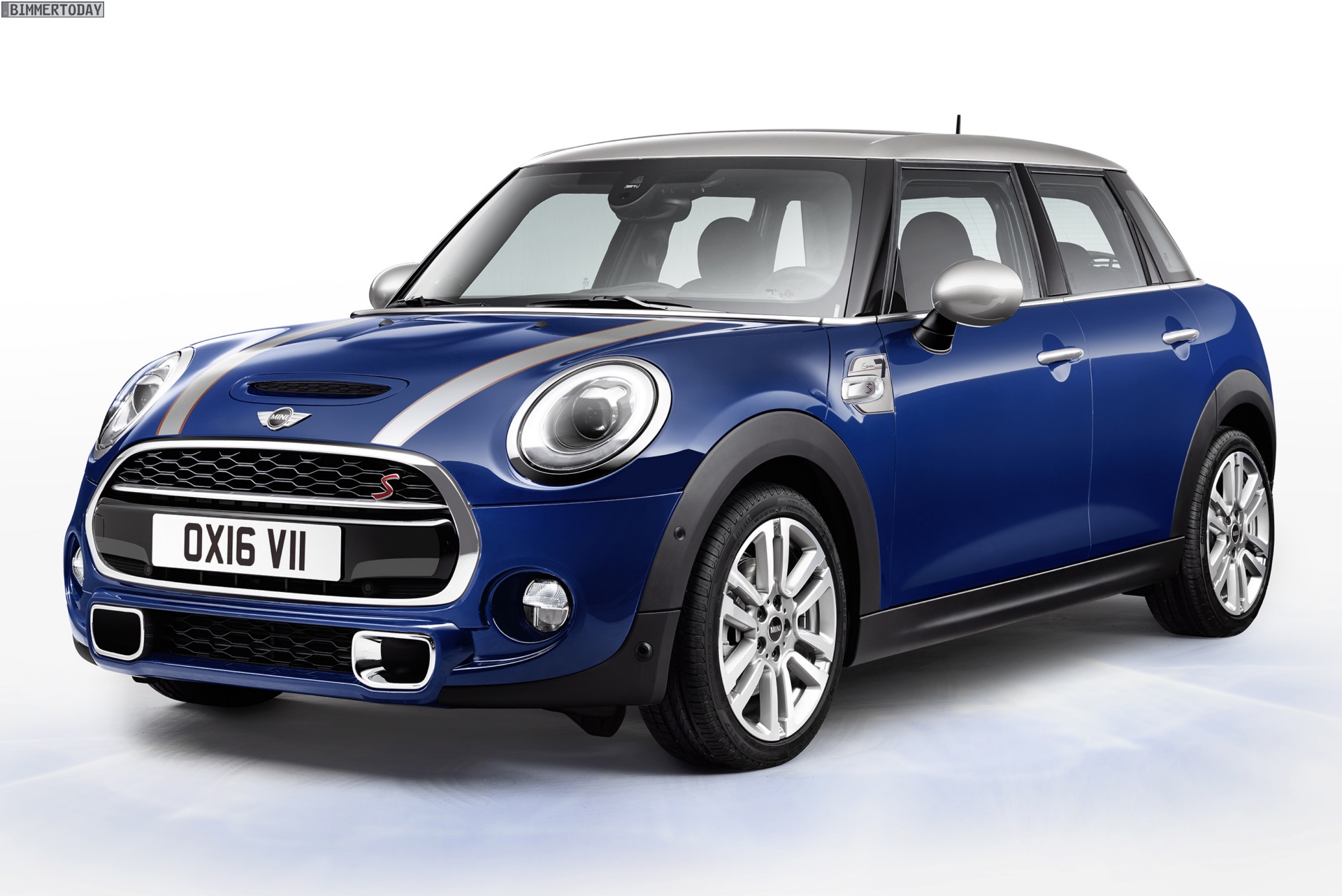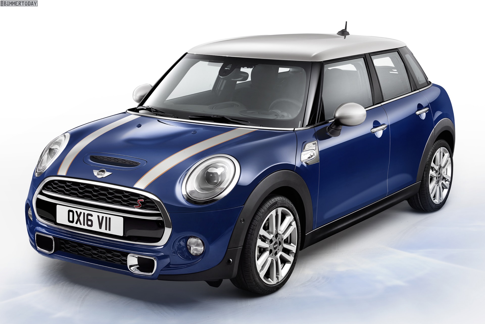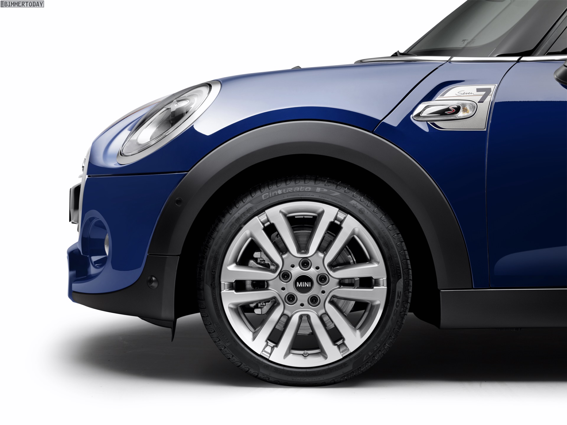 Die vierte MINI-Generation erhält ihr erstes Sondermodell: Der neue MINI Seven versteht sich als Designer-Kleinwagen für Menschen mit besonders hohen Ansprüchen an Individualität und Stil, sein Name erinnert an den legendären Urvater Austin Seven aus dem Jahr 1959. Er kombiniert dafür die klassischen Tugenden des MINI Cooper Hatchback mit der besonders edlen Außenfarbe Lapisluxury Blue, Akzenten in Melting Silver und exklusiven Seven Spoke-Felgen. Spiegelkappen und Dach glänzen Silbern, das Melting Silver der Motorhaubenstreifen ist von dünnen Streifen in Malt Brown eingefasst.