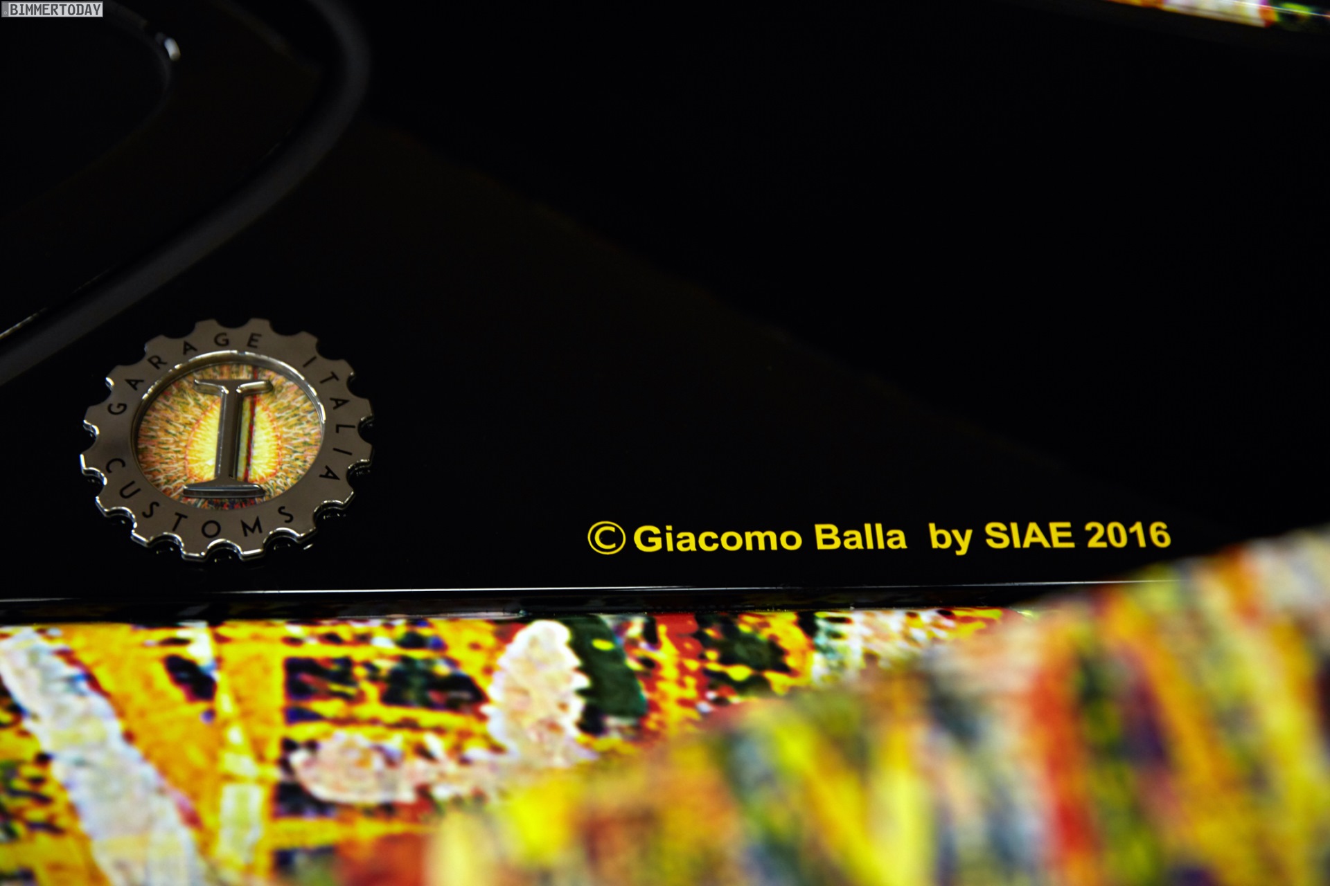 Auch wenn der einzigartige i8 das Zeug zu einem neuen BMW Art Car hätte, ist er offiziell kein Mitglied der exklusiven Art Car-Familie. Umgesetzt wurde die Idee von Garage Italia Customs, wo man sich sofort für die Verknüpfung des zukunftsweisenden Hybrid-Sportlers mit dem Kunstwerk eines berühmten italienischen Futurismus-Malers begeistern konnte.