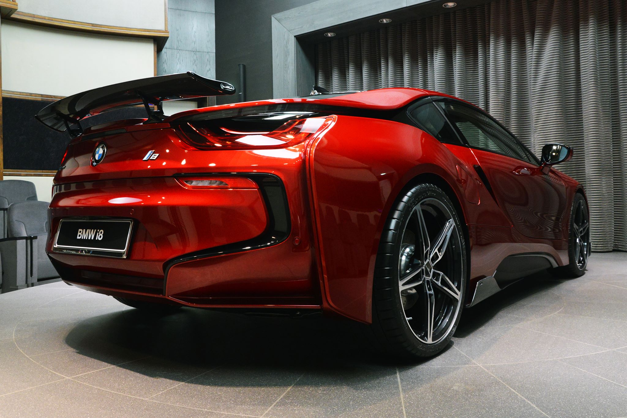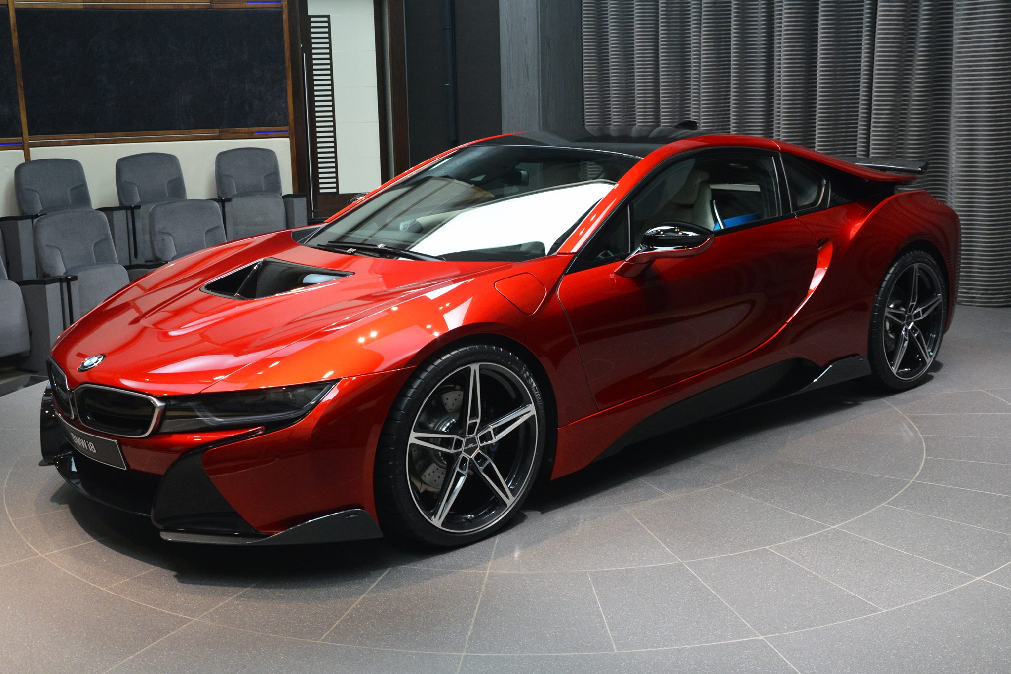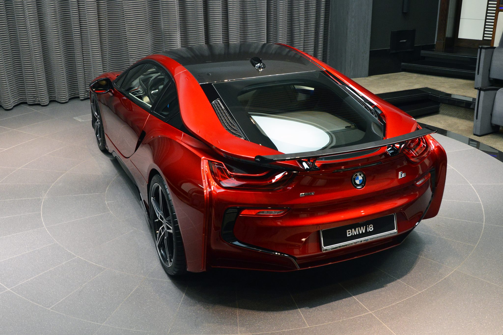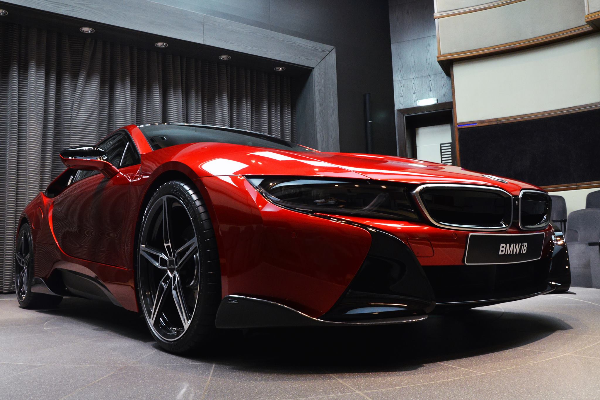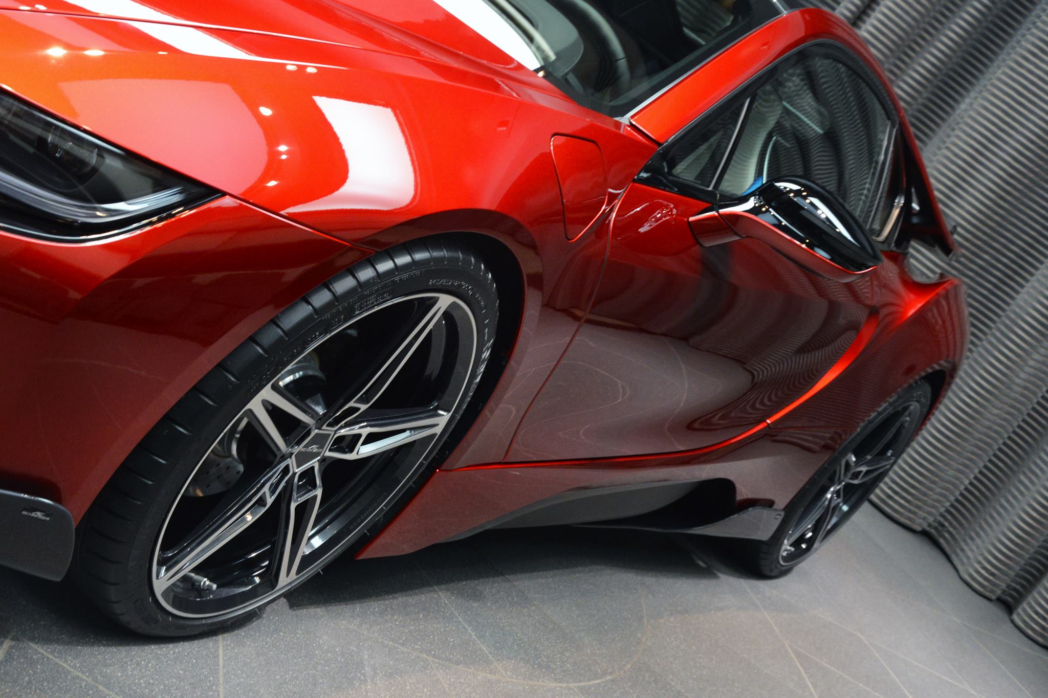 In knalligem Rot und mit Tuning-Komponenten von AC Schnitzer glänzt der BMW i8 in einem Showroom auf der arabischen Halbinsel. Bei BMW Abu Dhabi Motors steht der exklusiv in Lava Red lackierte Flügeltürer und wartet auf seinen neuen Besitzer, der lieber kein Problem mit neugierigen Blicken von zufälligen Beobachtern haben sollte. Denn an dem farblich und aerodynamisch optimierten Plug-in-Hybrid können nicht nur Auto-Fans kaum vorbeischauen, was selbst im Supersportler-gefluteten Abu Dhabi gelten dürfte.