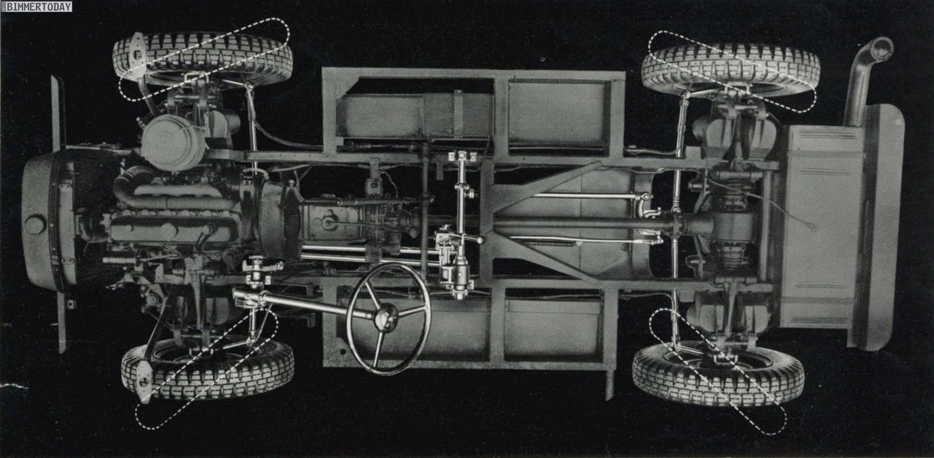 Ein alter Katalog aus dem BMW-Archiv verrät uns zahlreiche Details zum BMW 325, der seine vier Räder nicht nur antreiben, sondern auch allesamt lenken konnte. Genau wie moderne BMW mit Integral-Aktivlenkung verfügt auch der 325 von 1938 über eine Allradlenkung, die Steuerung war damals allerdings noch deutlich simpler und sollte in erster Linie für einen kleineren Wendekreis sorgen. Über den Geradeauslauf bei hohen Geschwindigkeiten musste man damals schon deshalb nicht nachdenken, weil der BMW 325 lediglich eine Höchstgeschwindigkeit von 80 km/h erreichen konnte.