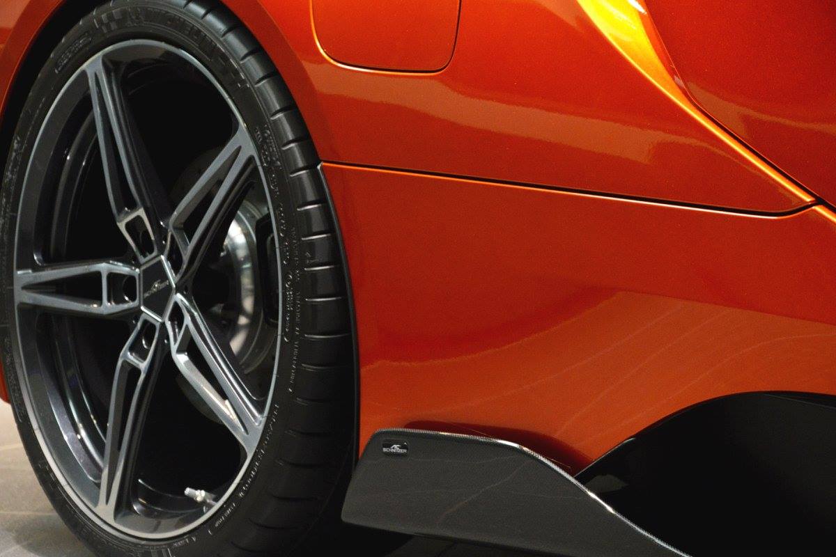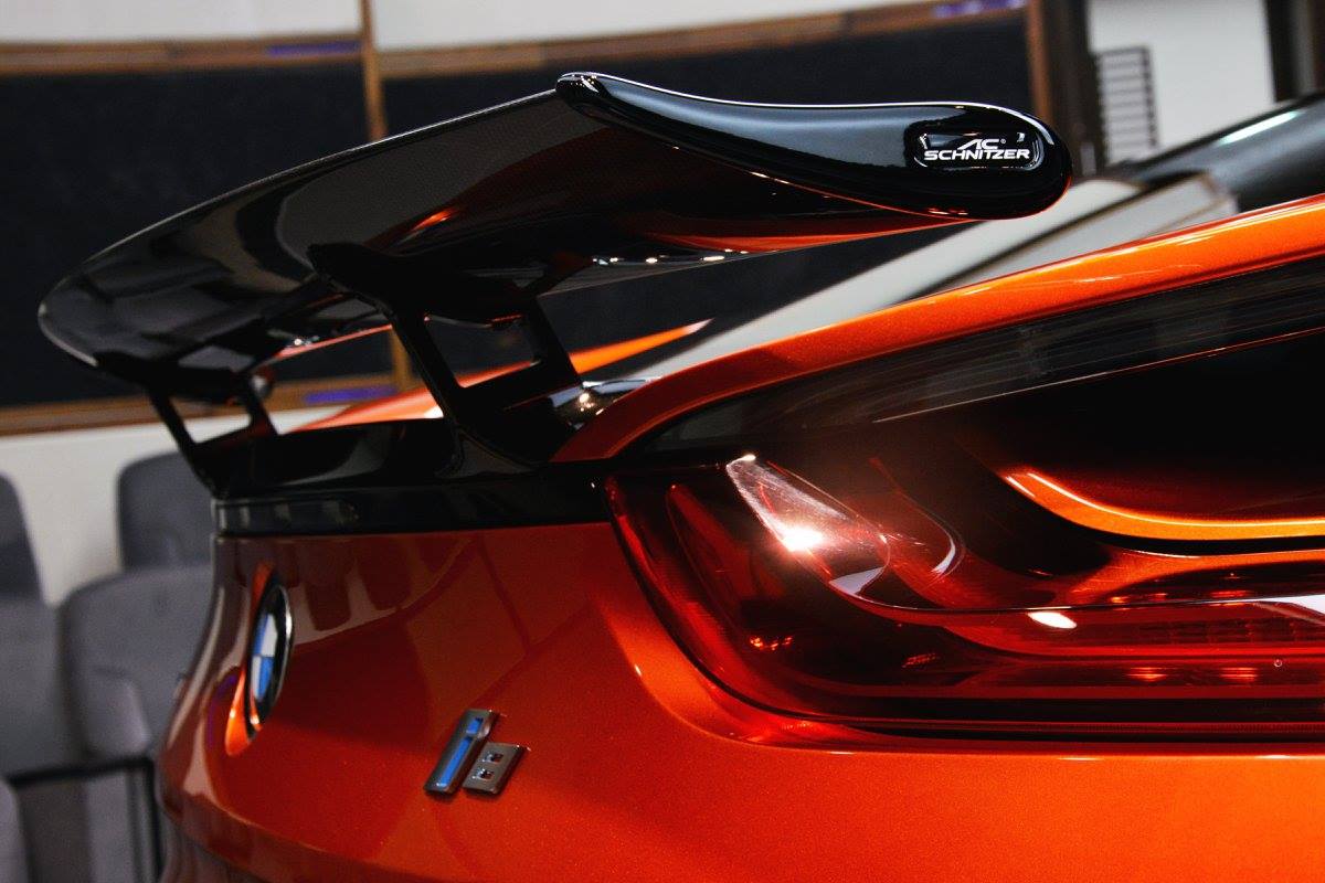 Neben der auffälligen Lackierung in Lava Orange verfügt der gezeigte BMW i8 auch über einige Tuning-Komponenten aus dem Programm von AC Schnitzer. Die Aero-Flaps an Frontschürze und Seitenschweller bestehen genau wie der Heckflügel aus Carbon, sind dementsprechend leicht und passen hervorragend zum Konzept des Flügeltürers mit Carbon-Fahrgastzelle.