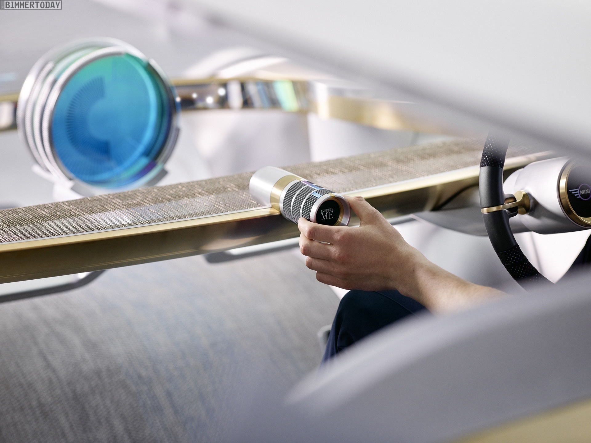 Sitzt der Fahrer am Steuer, soll er wie bisher selbst das Lenkrad in die Hand nehmen und großen Fahrspaß genießen können. “Urban Gokart” nennt MINI den eigenen Anspruch, das Fahrgefühl des klassischen Mini auch in der Zukunft anbieten zu wollen. Zum besonderen Fahrerlebnis trägt auch der Innenraum bei, der vom zentralen Rundinstrument geprägt wird. Im Fall des MINI Vision Next 100 hört die Technik hinter dem früheren Center Speedo auf den Namen Cooperizer, denn genau hier kann der Fahrer das Auto für die kommende Fahrt anpassen. Per Drehregler können Atmosphäre im Innenraum und Fahrmodus ausgewählt und verändert werden, je nach Laune glänzt der Kleinwagen entweder als effizienter Sparmeister oder als kurvenhungriger Spaßmacher.
