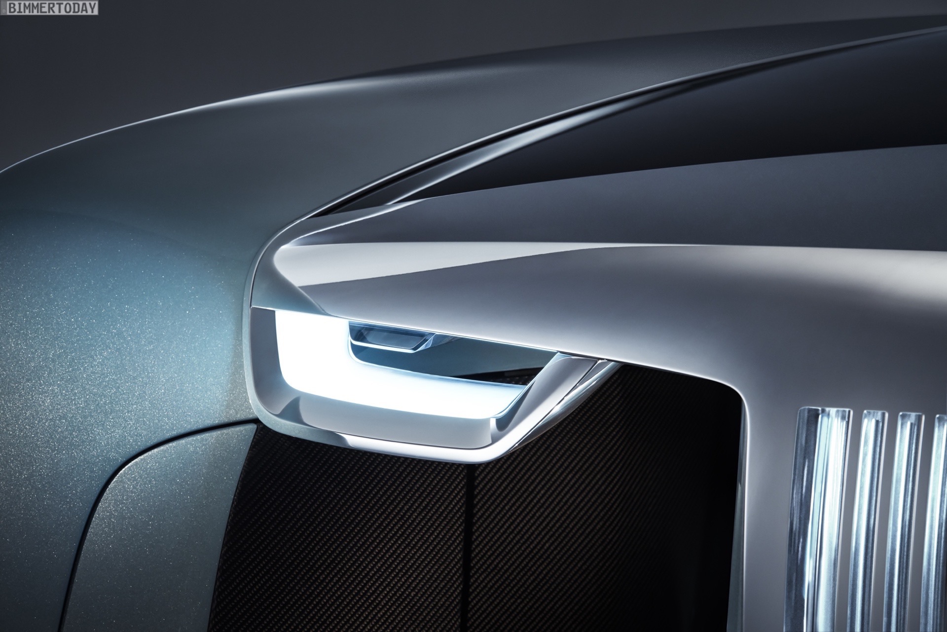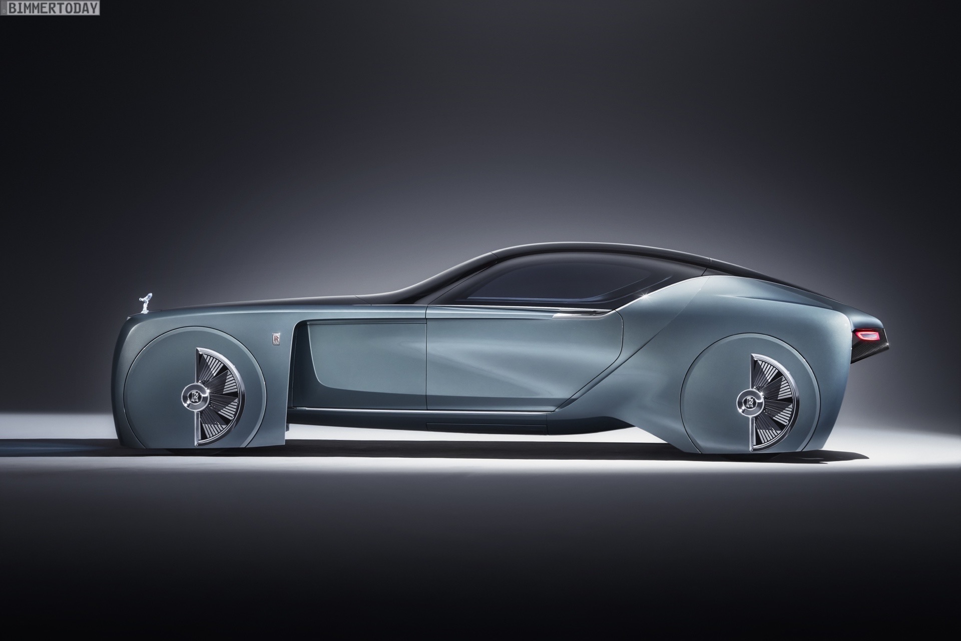 Das Design der spektakulären Studie ist eine Mischung aus Futurismus und Retro, bleibt ganz sicher im Gedächtnis und ist ebenso unverwechselbar wie unübersehbar. Auf 5,90 Meter Länge erstreckt sich der Rolls-Royce 103 EX, der auf 28 Zoll großen Felgen steht und sich schon auf den ersten Blick über alle Konventionen des aktuellen Automobil-Designs stellt.