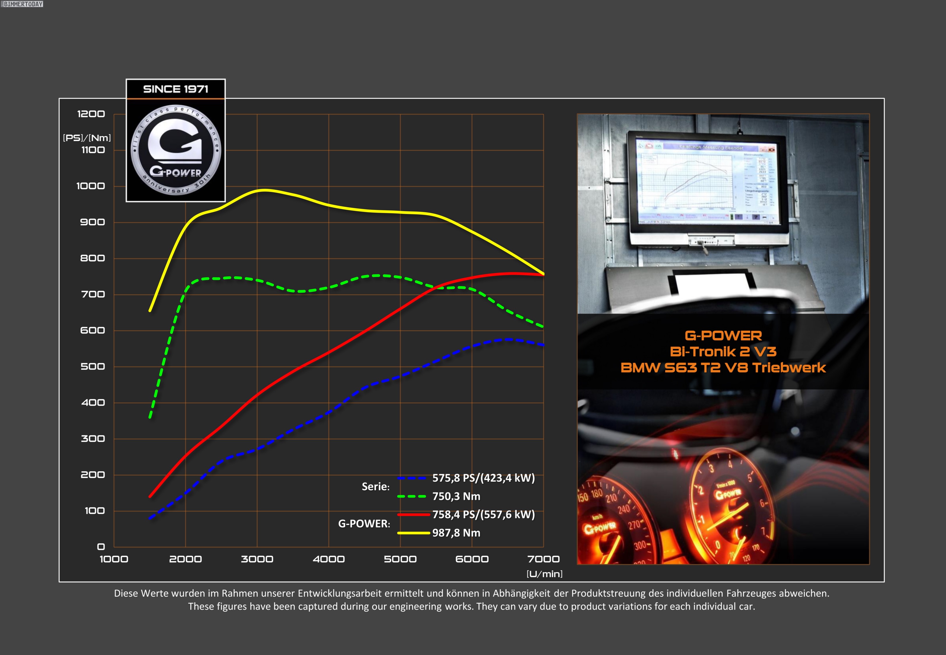 Dass es dem Power-SUV dennoch nicht an Dynamik mangelt, hat bereits die Serie in zahlreichen Vergleichstests unter Beweis gestellt. Doch in der Welt von G-Power stellen die 575 PS eines BMW X5 M nicht viel mehr als eine gute Arbeitsgrundlage dar, in Aresing wird für gewöhnlich in anderen Größenordnungen gedacht. Der G-Power BMW X5 M wird je nach Kundenwunsch mit bis zu 750 PS ausgeliefert, außerdem stehen etwas schwächere Leistungsstufen mit 650 und 700 PS zur Wahl.