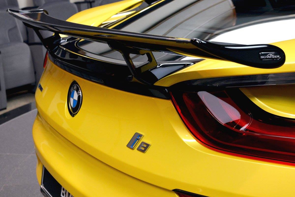 Wie schon die ersten beiden Lava-i8 aus Abu Dhabi trägt auch das dritte Mitglied der Familie einige Tuning-Komponenten von AC Schnitzer, die den sportlichen Auftritt mit ihrem Design zusätzlich betonen. Vor allem der Heckspoiler sticht dabei sofort ins Auge und lässt das schon von Haus aus sichtbar aerodynamisch gezeichnete Heck des BMW i8 noch spezieller wirken.