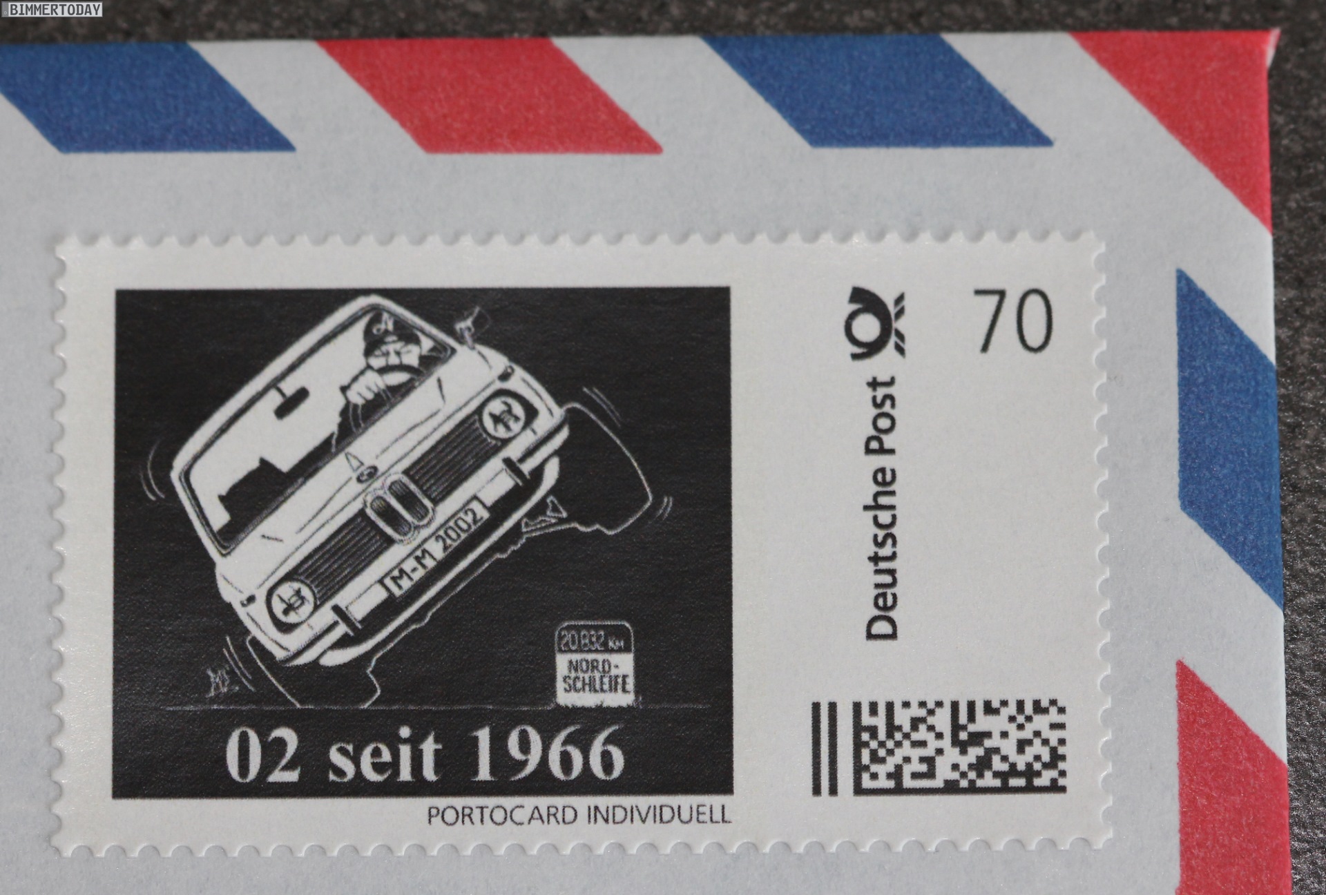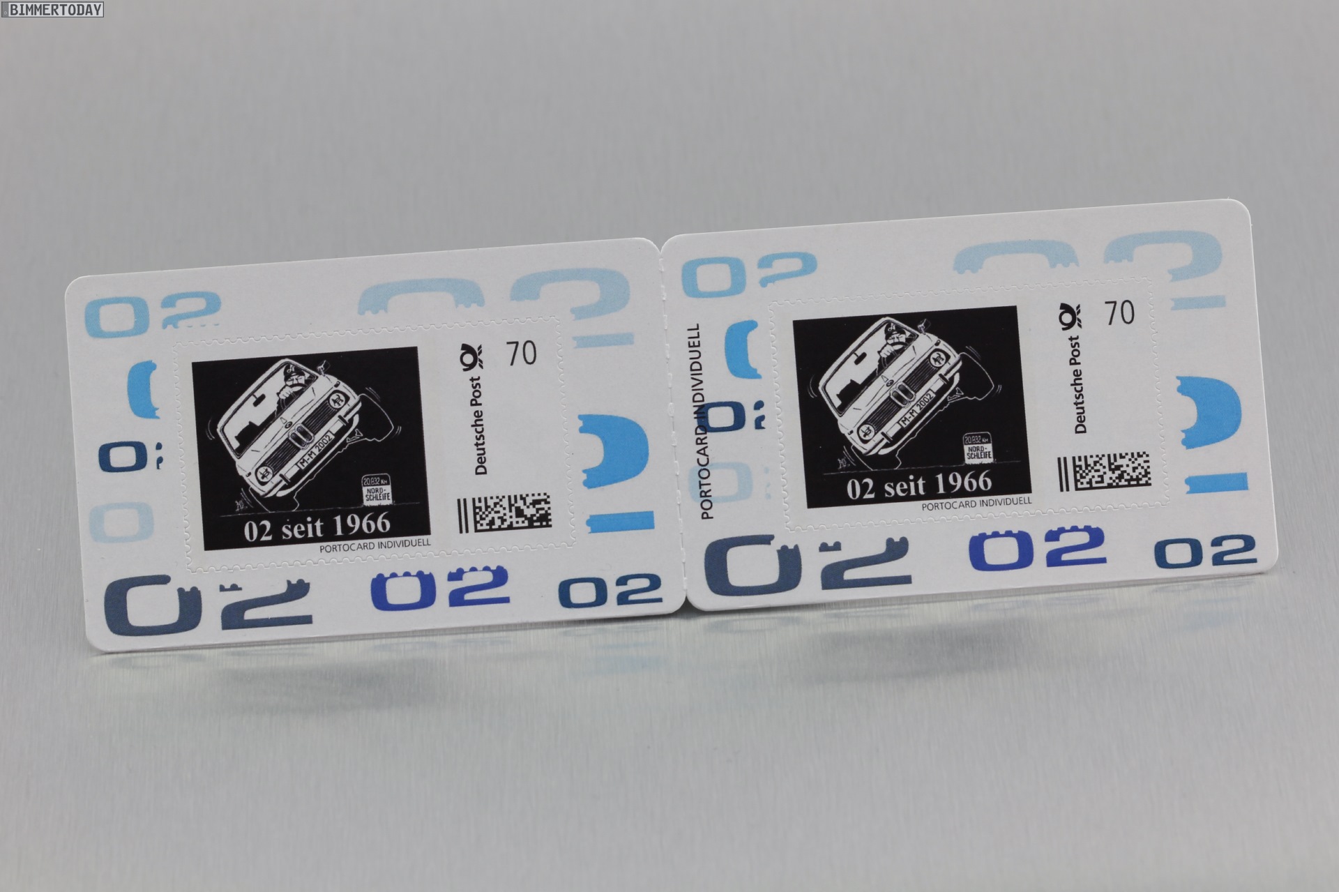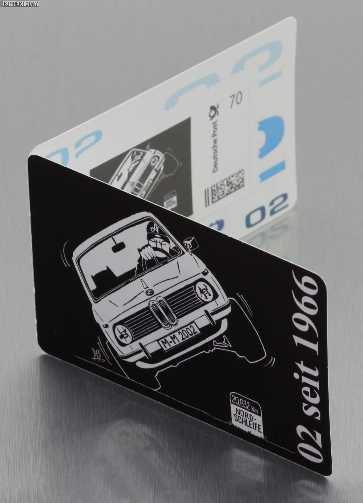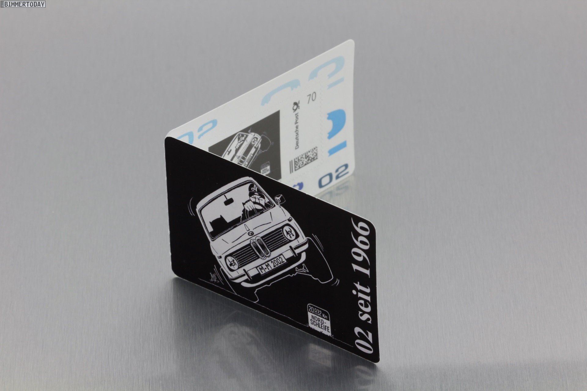 Das Motiv stammt vom französischen Künstler BOD und zeigt einen BMW 02, der auf nur zwei Rädern durch eine Kurve jagt. So soll die Briefmarke den Sturm und Drang des Fahrzeugs, aber auch den heute wie damals aktuellen Wunsch nach immer höheren Kurvengeschwindigkeiten zum Ausdruck bringen. Die Sammler-Klappkarten mit jeweils zwei Briefmarken “02 seit 1966” werden in einer Auflage von 2002 Stück hergestellt und sind unter 99rodeodrive.com erhältlich.