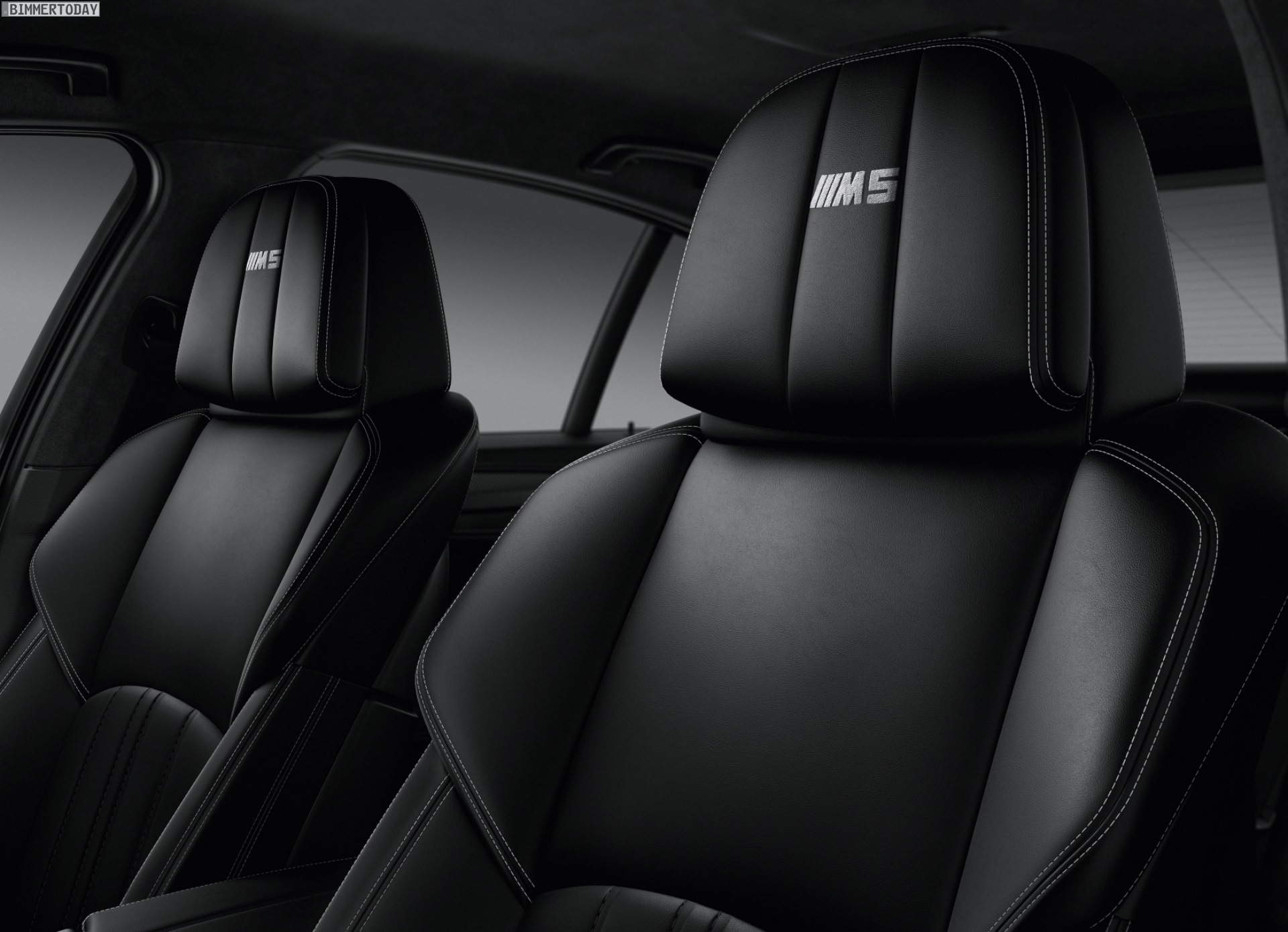 Um den exklusiven Charakter der BMW M5 Competition Edition zu unterstreichen, gibt es einige unübersehbare Hinweise auf das Sondermodell. Eine wichtige Rolle spielt dabei die Farbe, denn in dieser Hinsicht kennt die Edition lediglich Schwarz und Weiß: Jeweils 100 Exemplare werden in Carbonschwarz und Mineralweiß Metallic lackiert, andere Farben stehen nicht zur Wahl. Keinerlei Auswahl gibt es bei den Felgen, alle 200 Fahrzeuge tragen ab Werk die 20 Zoll große M Doppelspeiche in Jet Black glanzgedreht. Aus dem Tuning-Programm von BMW M Performance stammen Spiegelkappen, Diffusor, Spoiler-Lippe und schwarze Nieren.