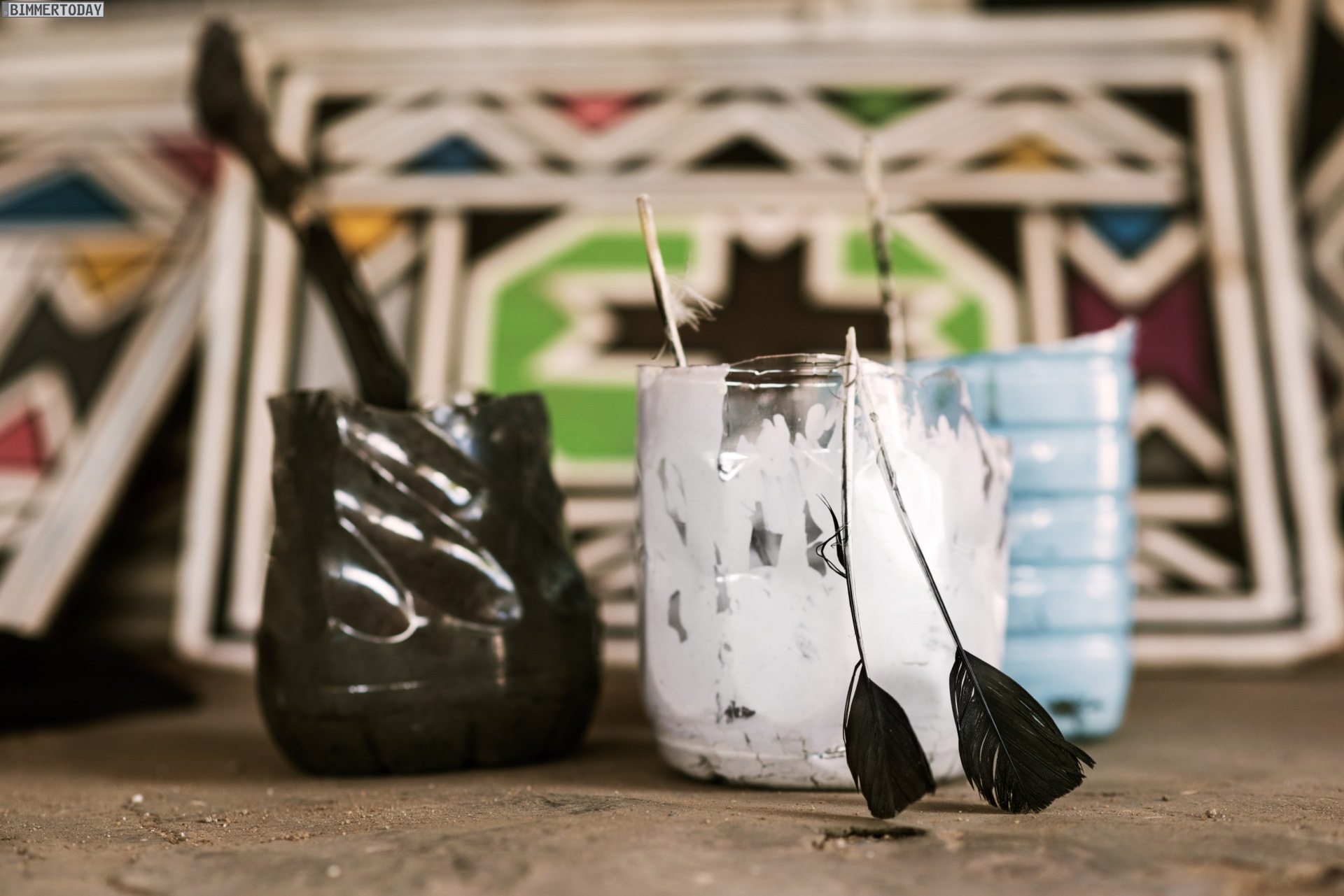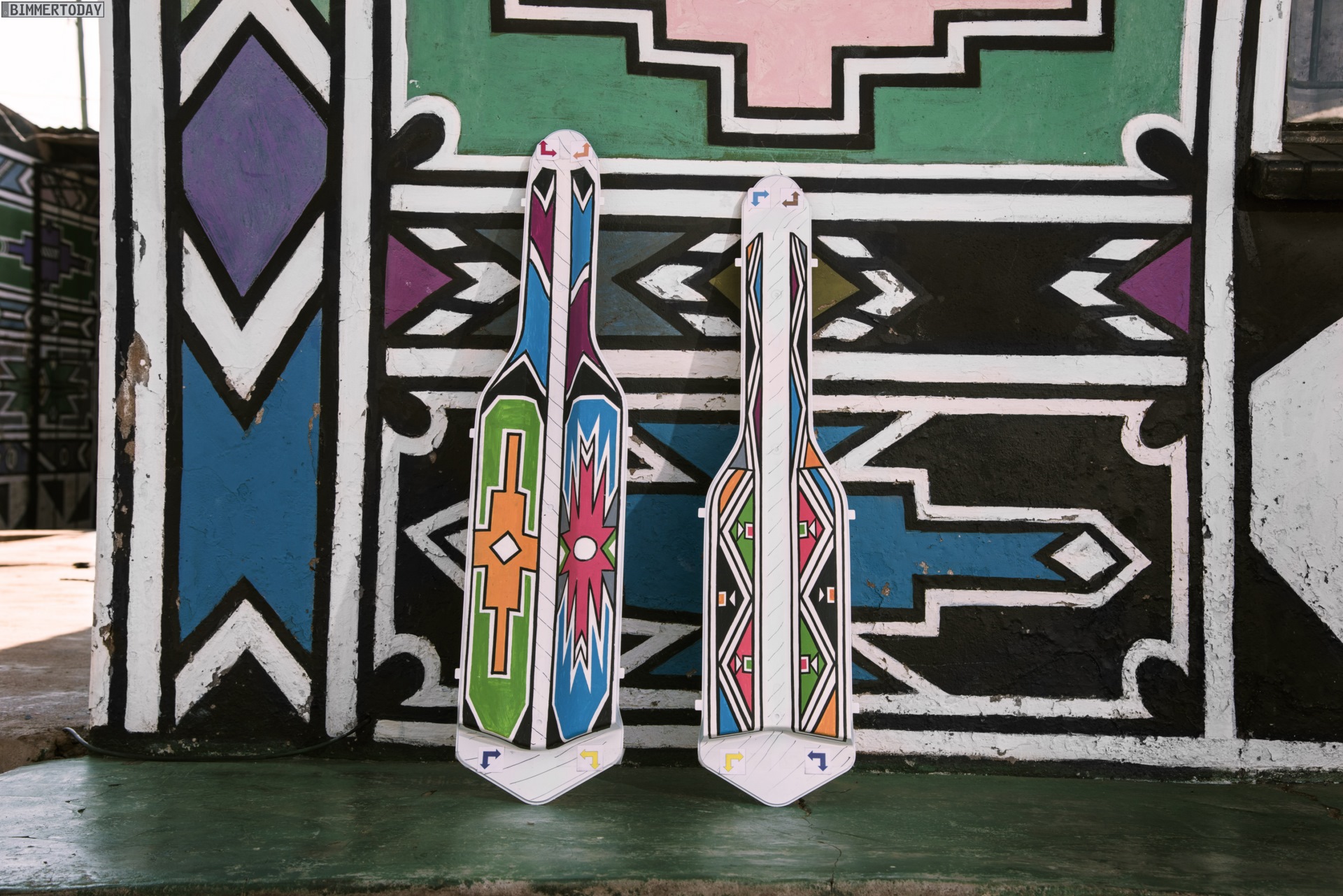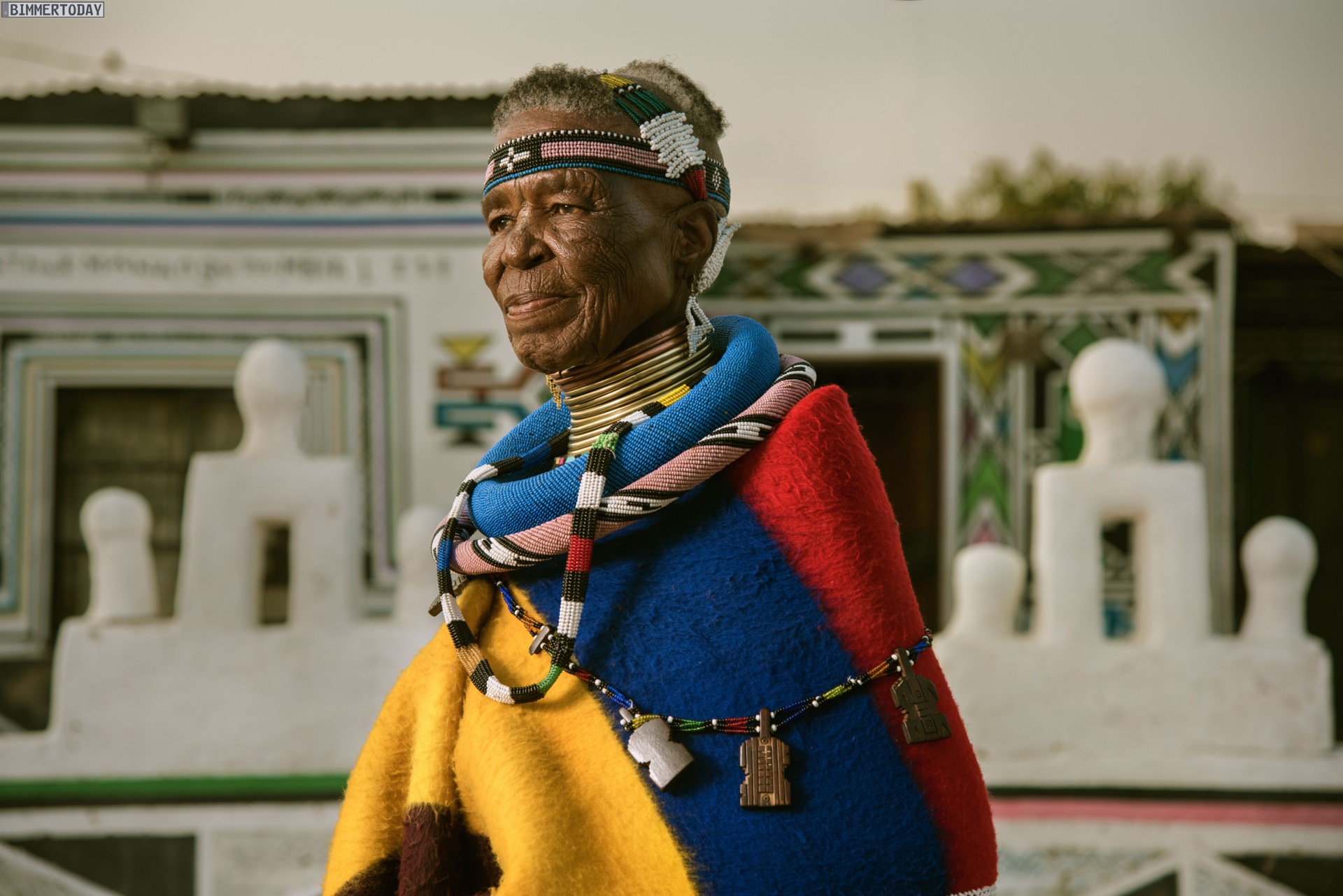 Esther Mahlangu: “Die Malerei ist eine Herzensangelegenheit von mir und liegt mir im Blut. Die Art, wie ich male, habe ich von meiner Mutter und meiner Großmutter gelernt. Zwar wechseln die Motive und Farben sowie die Oberflächen und Objekte, die ich bemale, aber an meiner Liebe zur Malerei hat sich nichts geändert. Bei meiner Arbeit für BMW habe ich Tradition mit dem einzigartigen Charakter der Marke BMW verbunden. Als ich die Leisten von BMW erhalten habe, hatte ich bereits eine Vorstellung von der Gestaltung im Kopf und machte mich sofort an die Arbeit! Ich habe mit dem Bemalen der kleinen Leisten begonnen, um ein Gefühl für die Oberfläche zu entwickeln. Dann lief alles praktisch von selbst. Das Design folgte den Linien. Meine Kunst hat mich an viele Orte dieser Welt geführt und ich habe viel gesehen. Ich habe zahlreiche Wände und Objekte bemalt und meine Arbeiten sind in vielen Museen zu sehen, doch ich bin immer noch Esther Mahlangu aus Mpumalanga in Südafrika. Ich habe mich sehr gefreut, als ich von BMW erneut gefragt wurde.”