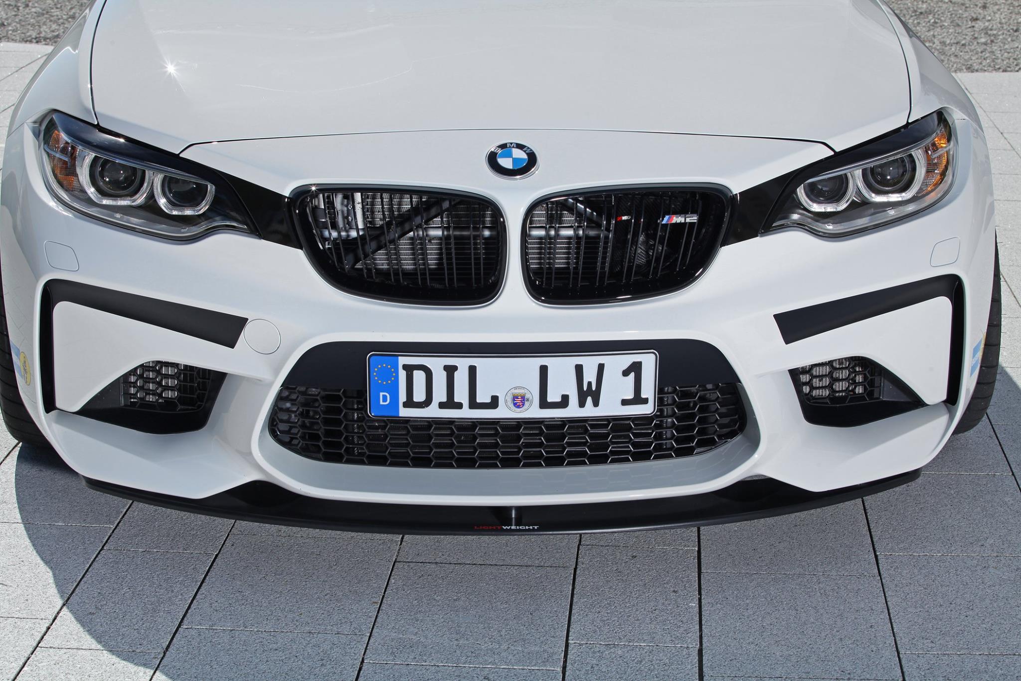 Lightweight Performance hat am Wochenende den LW M2 auf Basis des BMW M2 F87 enthüllt und damit eine der bisher schärfsten Tuning-Varianten des Kompaktsportlers präsentiert. Schon auf den ersten Blick wirkt der modifizierte M2 besonders eigenständig, denn Lightweight Performance hat ihm eine interessante Dekor-Beklebung verpasst und lässt die aggressive Frontschürze so noch etwas böser wirken. Die schwarz eingefärbten Nieren sind optisch direkt mit den Scheinwerfern verbunden und auch die seitlichen Lufteinlässe werden durch schwarze Streifen noch stärker betont.