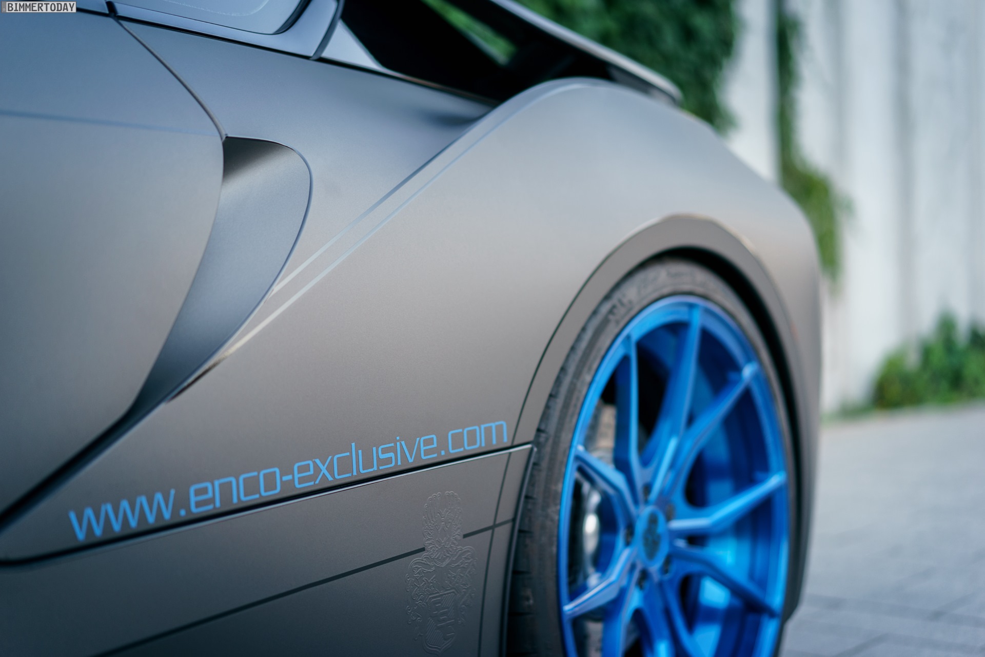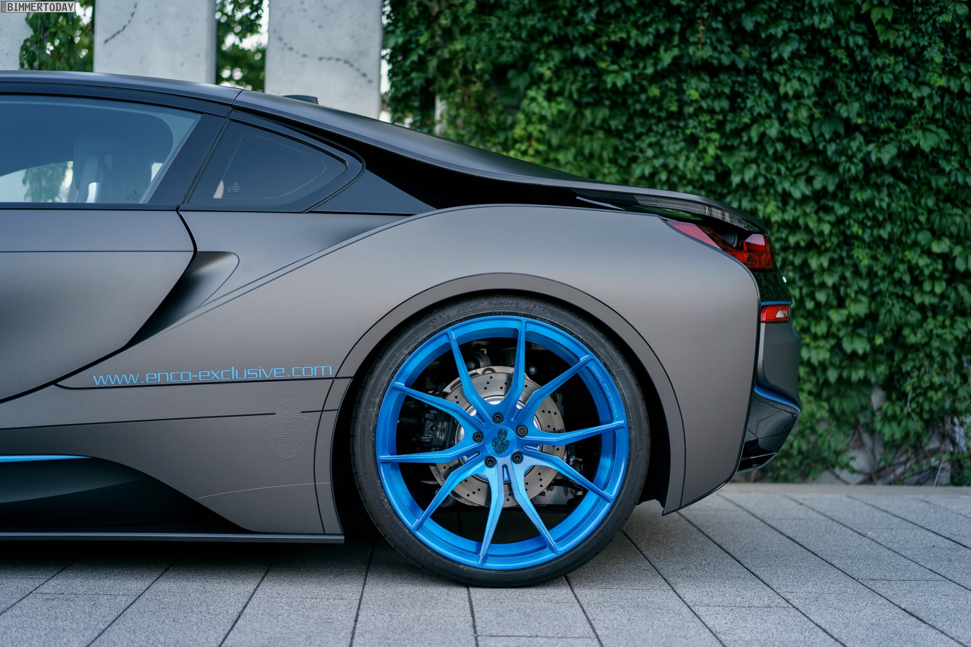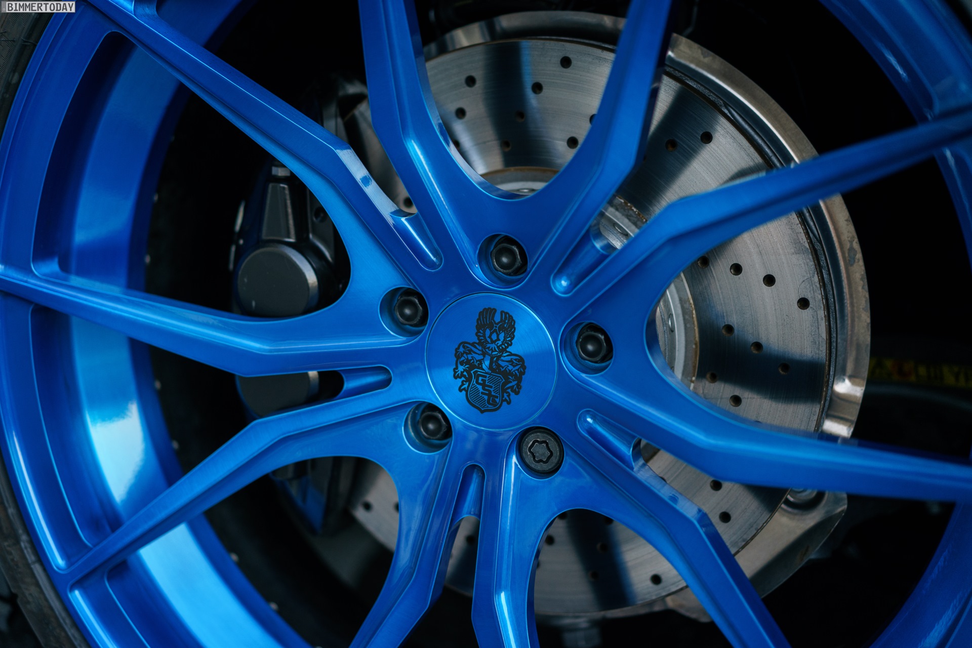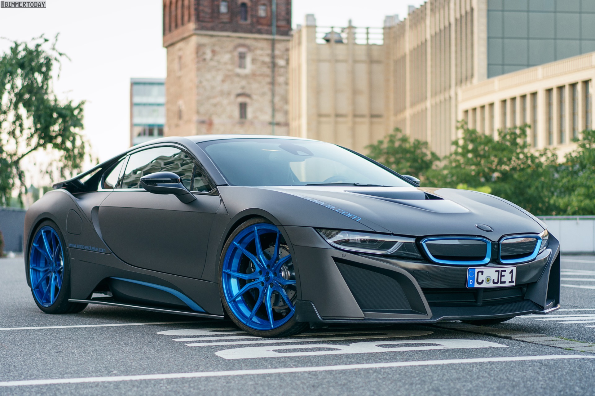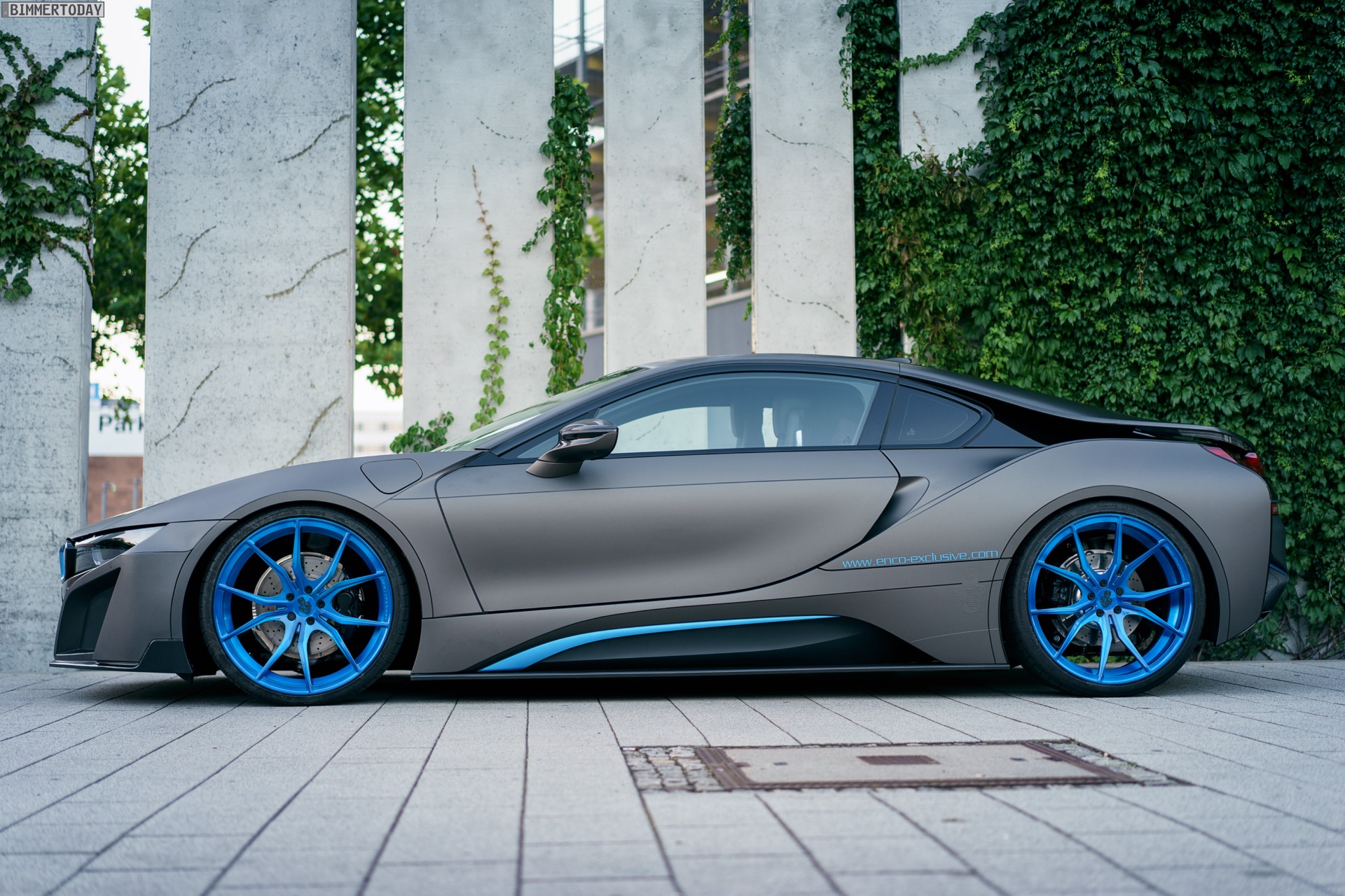Als weiterer großer Blickfang dienen die Leichtmetallräder des BMW i8 von German Special Customs. In den Radhäusern stecken nun 22 Zoll große Felgen von COR International, die in leuchtendem Blau gehalten sind und somit für einen scharfen Kontrast zur mattgrauen Hauptfarbe sorgen. Dank einer Tieferlegung mit Federn von H&R kommen die Felgen noch besser zur Geltung.