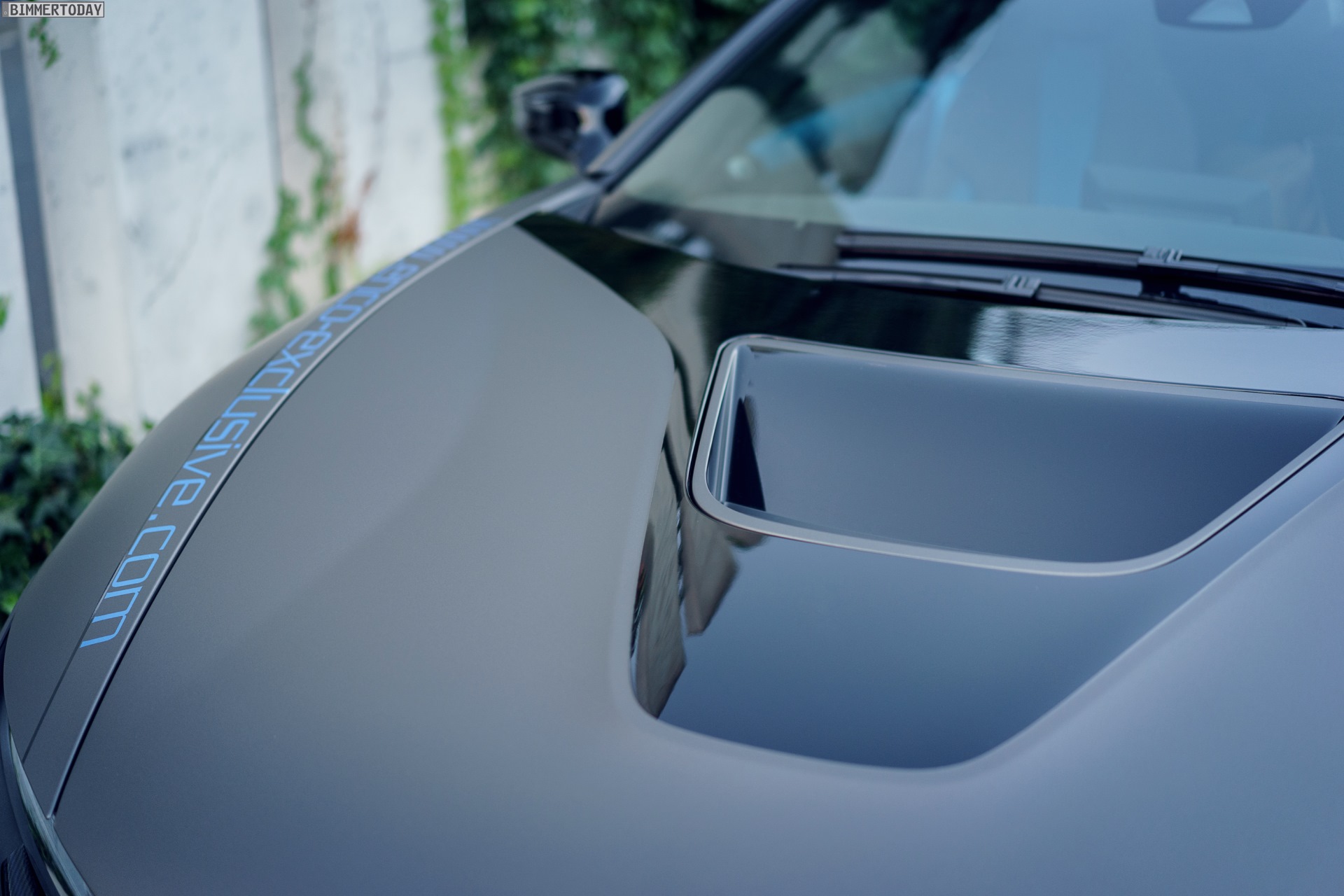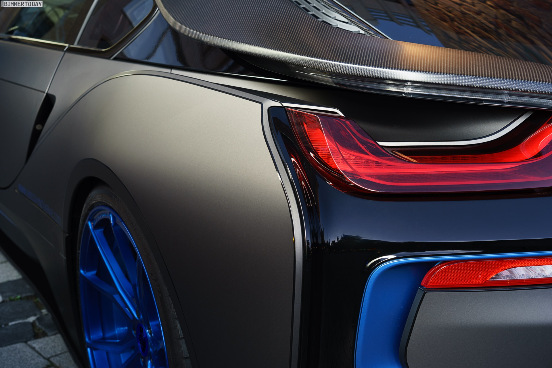 In Szene gesetzt wird die modifizierte Außenhaut mit einer vollständigen Folierung in mattem Grau, lediglich einige Elemente des sogenannten Black Belt glänzen auch weiterhin in Schwarz. Die Einfassung der Nieren und einige weitere Details sind außerdem in Protonic Blue gehalten – ein Akzent, der bereits ab Werk angeboten wird und die einzigartigen Formen des BMW i8 zusätzlich betont.