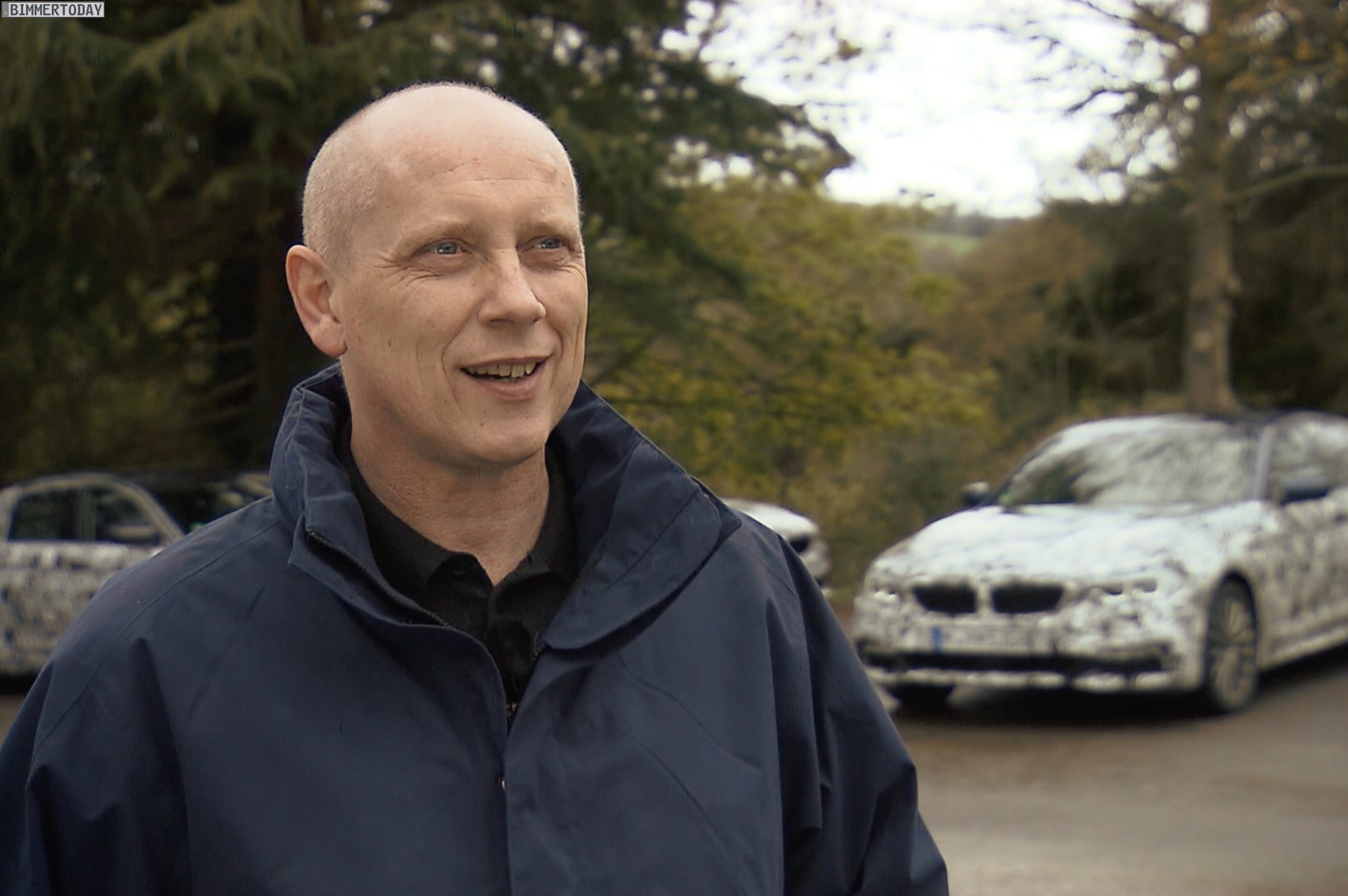 Im Rahmen des Interviews sehen wir auch einige Details der getarnten Prototypen, mit denen die Fahrwerksentwicklung unter anderem in Wales vorangetrieben wurde. Wir sehen die getarnten Erlkönige dabei aus unmittelbarer Nähe und können unter anderem die äußere Form der Scheinwerfer und Rückleuchten, der Nieren und der Außenspiegel klar erkennen. Wir dürfen außerdem einen Blick in den nur zum Teil abgehangenen Innenraum werfen und sehen das optionale M Sportlenkrad weitestgehend enttarnt.