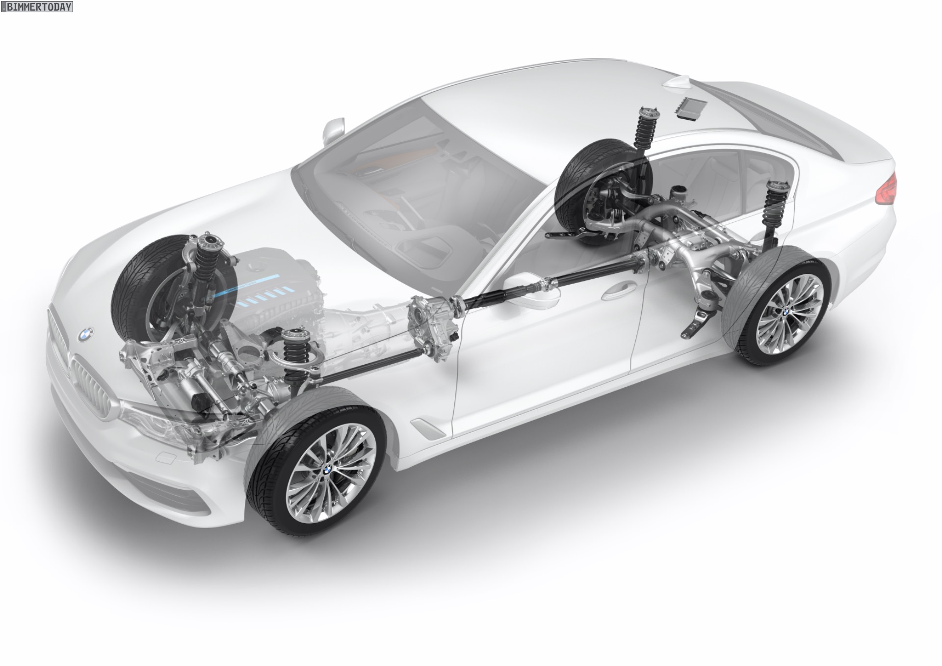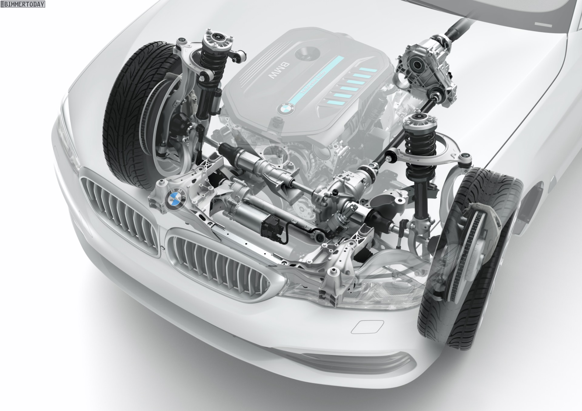 Dass sich das niedrige Gewicht des 5er G30 in einem ausgeglichenen Verhältnis zwischen Vorder- und Hinterachse verteilt, muss man bei einer BMW-Limousine kaum gesondert erwähnen. Trotz reduziertem Gewicht konnten die Ingenieure auch die Verwindungssteifigkeit der Karosserie weiter verbessern und den Fahrwerks-Entwicklern so eine ideale Basis für überdurchschnittliche Fahrdynamik liefern. Der um 7 Millimeter gestreckte Radstand wird mit 5 Millimetern mehr Spurweite vorn und 3 Millimetern mehr Spurweite an der Hinterachse kombiniert, wichtiger als diese marginalen Änderungen sind aber die folgenden Änderungen: An der Vorderachse kommt eine neue Doppelquerlenker-Konstruktion mit zahlreichen Leichtbau-Komponenten und neuer Achskinematik zum Einsatz, die Fünflenker-Hinterachse ist im Vergleich zum Vorgänger leichter und steifer ausgeführt.
