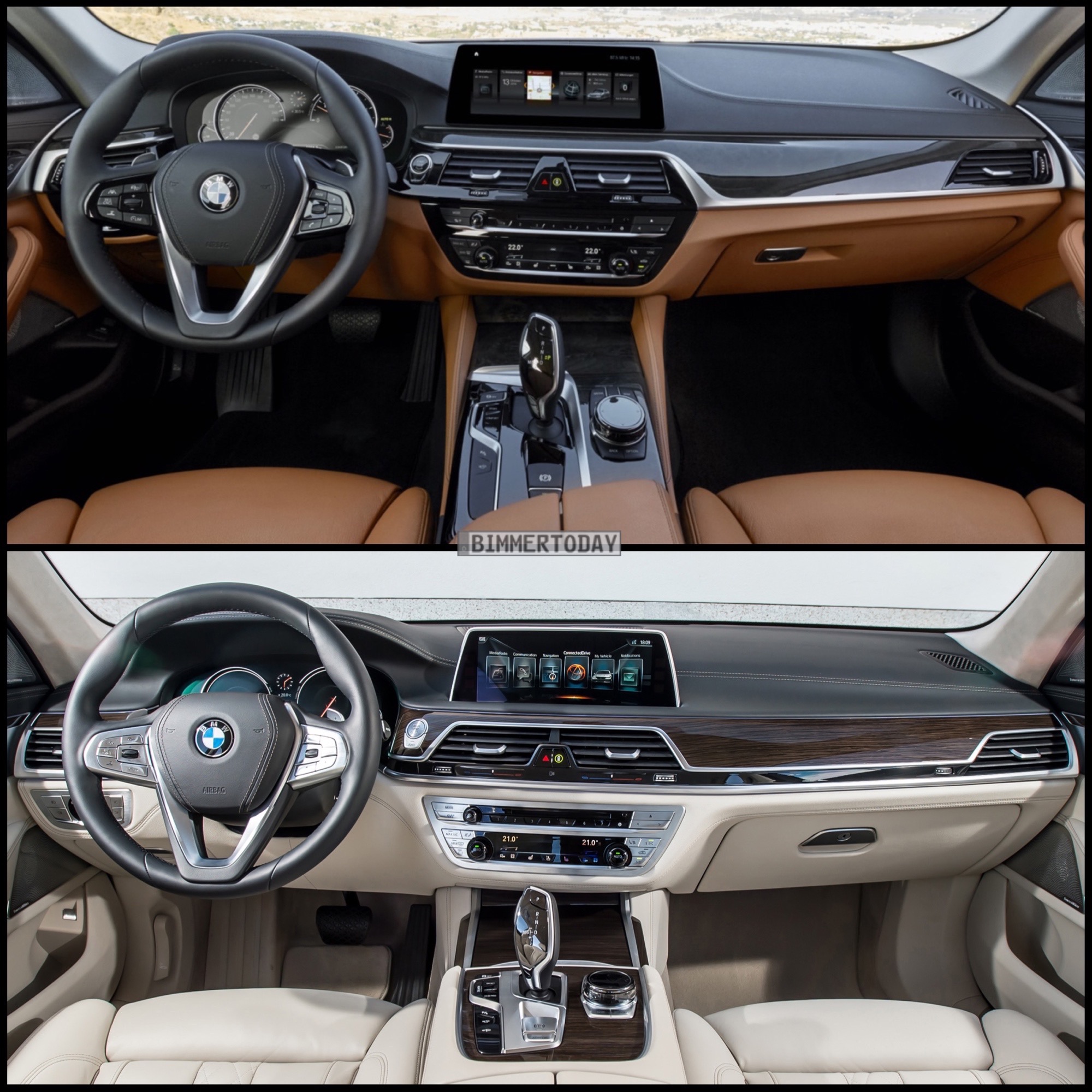 Und der Innenraum? Auch hier gibt es eine unbestreitbare Ähnlichkeit zwischen beiden Modellen, aber auch hier fallen im direkten Vergleich einige Unterschiede ins Auge. Unter anderem sind die Bedien-Einheiten von Radio und Klimaanlage optisch direkter mit den darüber platzierten Lüftungsdüsen verbunden, auch die Mittelkonsole mit dem futuristischen Bedienhebel der Achtgang-Automatik ist im Detail anders ausgeführt. Etwas deutlicher wird die Unterscheidung beim Blick auf die Details: Während im 7er fast alle Bedienelemente mit einer Metall-oder Glas-Oberfläche glänzen, kommt im 5er sichtbar mehr Kunststoff zum Einsatz.